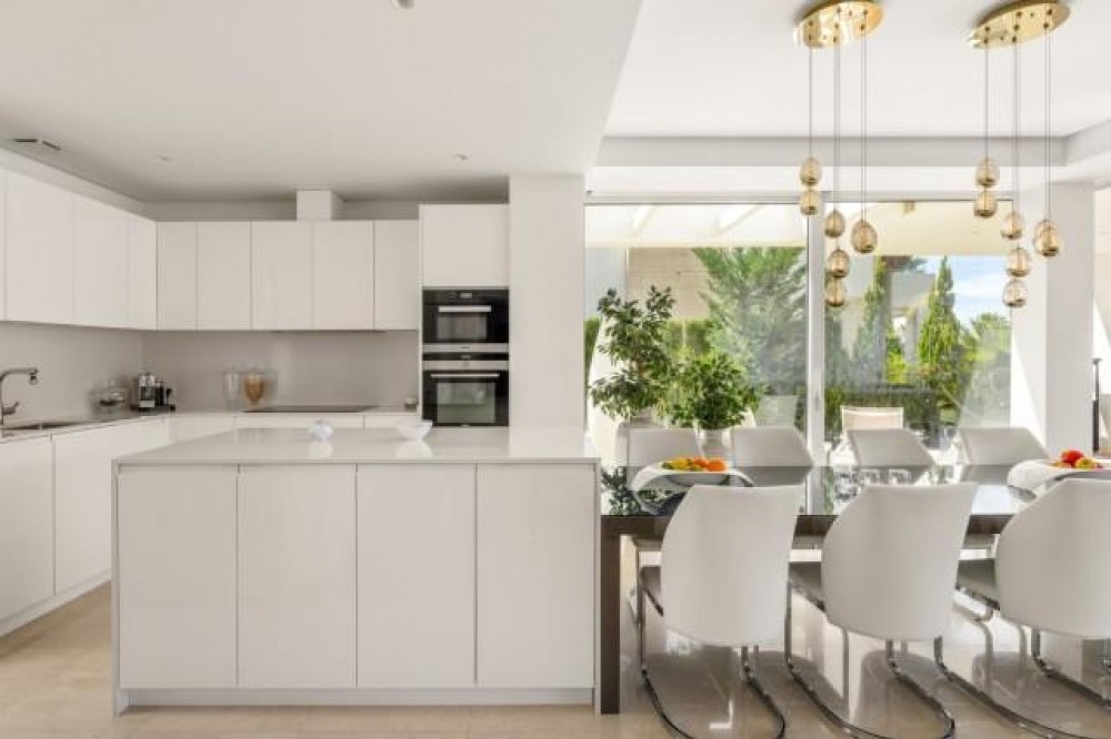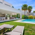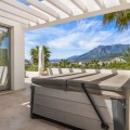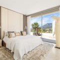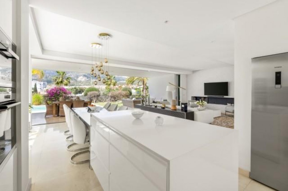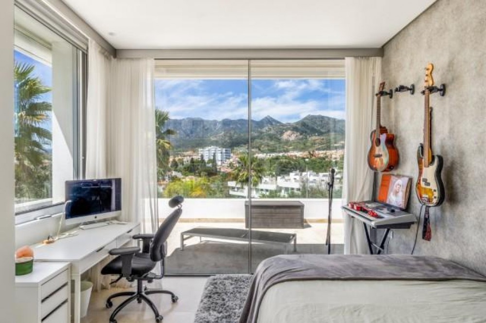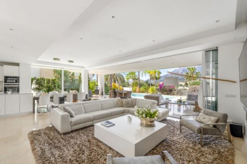 - BEAUTIFUL MODERN VILLA FOR SALE WITH VIEWS TO THE CONCHA MOUNTAINS IN MARBELLA. Welcome to this exquisite modern and contemporary 3-bedroom villa nestled in a peaceful residential area, just east of Marbella town, dominated by gentle olive and pine-clad slopes, beaches, dunes and beautiful views. This north-facing property offers stunning panoramic views of the Concha Mountains, encapsulating the serene beauty of the surrounding landscape. The neighborhood is highly sought after, providing peace of mind and exclusivity. The villa, set on two levels, with two bedrooms downstairs and the master room upstairs with private mountain views terrace. The villa offers a spacious area and is situated on a beautifully landscaped plot featuring a private swimming pool and well-maintained gardens. Its contemporary design includes large glass windows ensuring abundant natural light floods the open plan kitchen, dining, and living room. The main floor offers direct access to the garden and has been designed to provide unobstructed mountain views, enhancing the connection to the natural environment. The property also boasts a large, covered terrace, ideal for relaxation and outdoor dining, featuring a barbecue area and offering panoramic views of both the mountains and the pool area. The terrace serves as a perfect spot for entertaining guests or enjoying quiet family evenings.