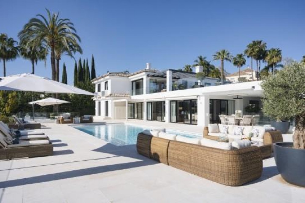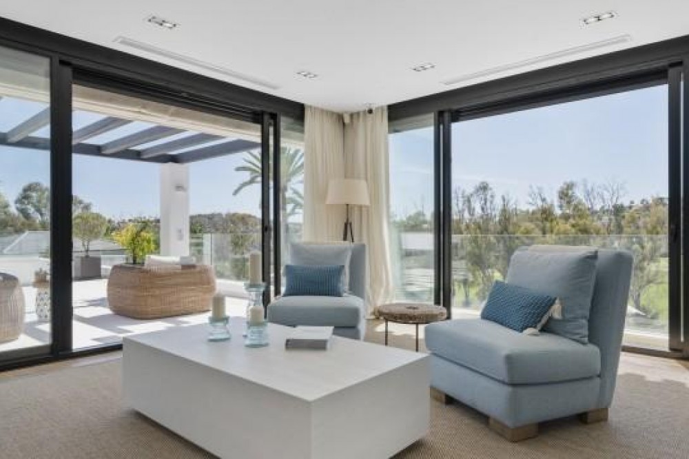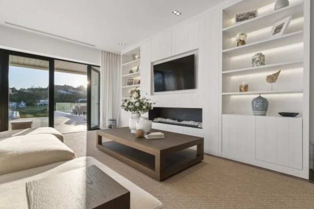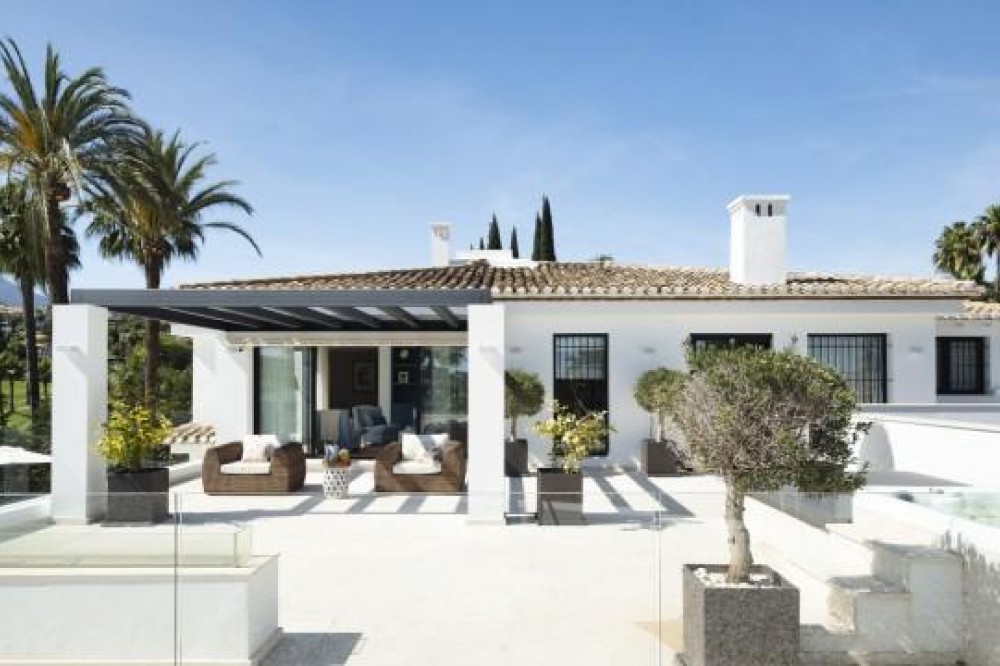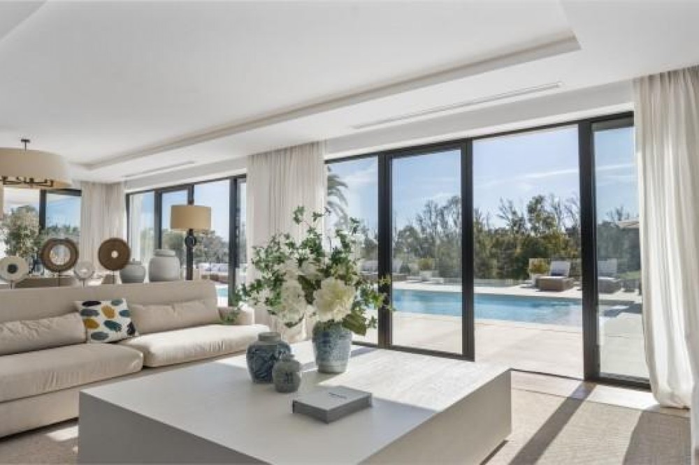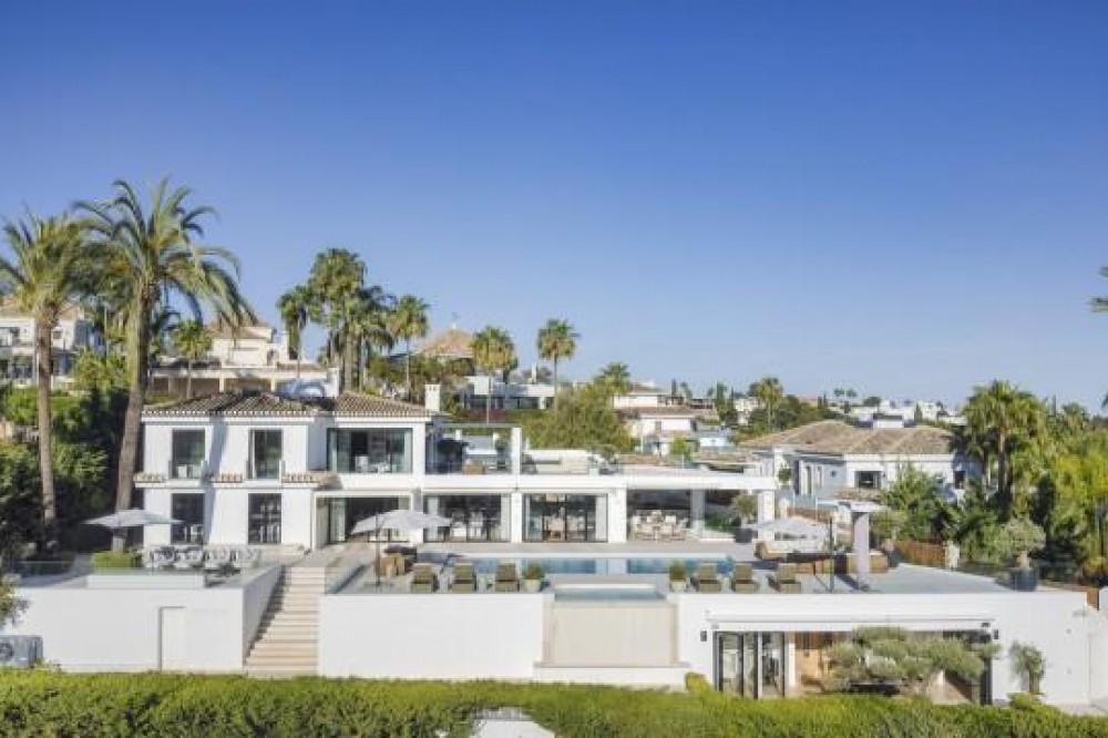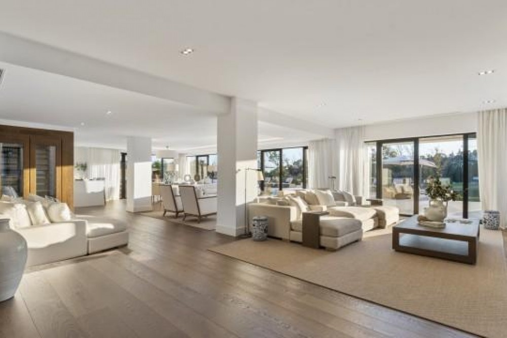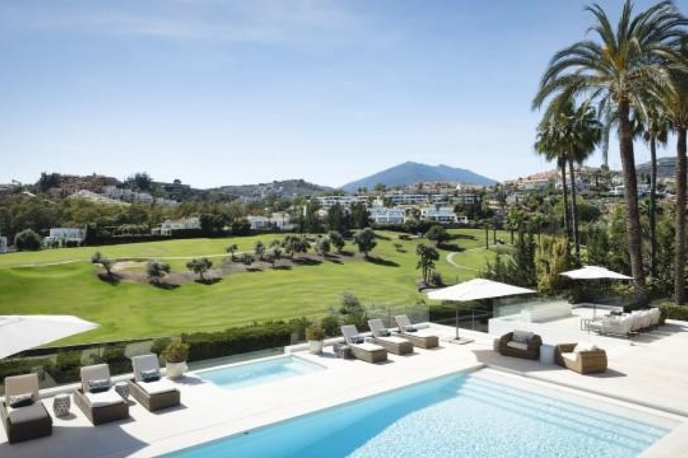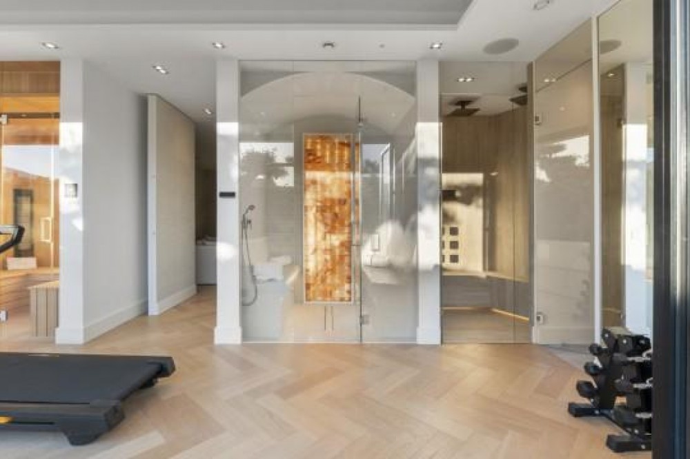 - Frontline Golf Luxury Villa for sale in Nueva Andalucia Spain. Welcome to this luxurious family home located in the prestigious Nueva Andalucia area in Marbella. As you enter the property, you are greeted by a spacious open-plan living area that seamlessly blends indoor and outdoor living. The living space with heated wooden floors opens onto a generous pool area, complete with an outdoor fireplace fueled by ethanol, creating the perfect ambiance for outdoor gatherings. The heated swimming pool invites you to take a refreshing dip any time of the year. The main level of the home features three well-appointed bedrooms, offering comfort and privacy for the entire family. Additionally, there is an office space for those who need to work from home and a separate TV room where the family can unwind and enjoy movie nights together. Ascending to the upper level, you will find three more bedrooms, each with its own en-suite bathroom. The master bedroom is a true retreat, boasting a spacious layout, his and her walk-in closets, and a private terrace offering stunning views of the golf course and the sea beyond. This luxury family home is designed to provide the utmost comfort and style, with ample space for every member of the family to relax and enjoy the beautiful surroundings of Marbella's Golf Valley. Descend into the basement of this luxurious family home and discover an unexpected haven of relaxation and entertainment. The basement is designed as the ultimate retreat, offering a variety of amenities to cater to every need. Step into the sleek and stylish bar area, where you can mix up your favorite cocktails and entertain guests in style. Adjacent to the bar, you'll find a cozy TV room, perfect for movie nights or catching up on your favorite shows. For those seeking relaxation and rejuvenation, the basement boasts a sauna and steam room with Himalaya salt wall, where you can unwind and let the stresses of the day melt away. Indulge in a luxurious massage in the dedicated room... And more, much more...