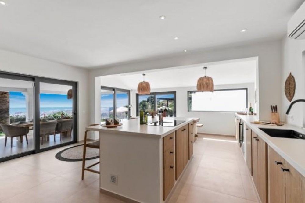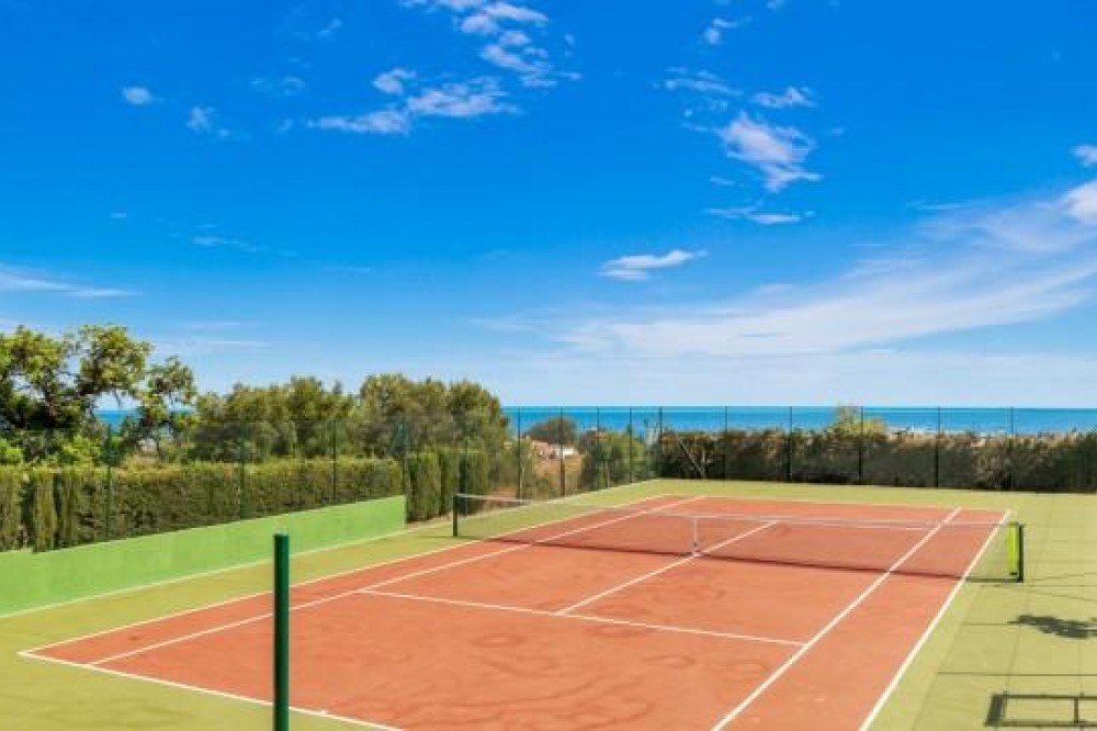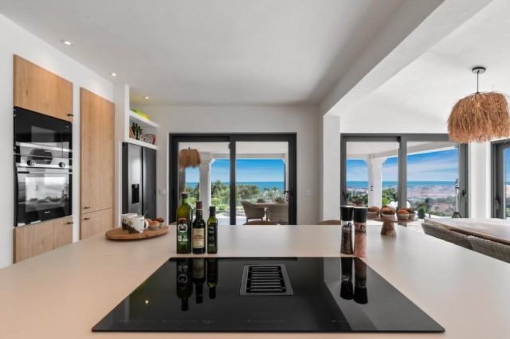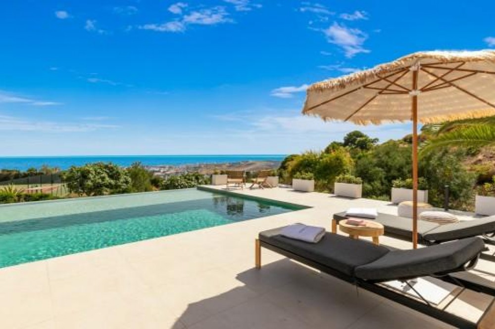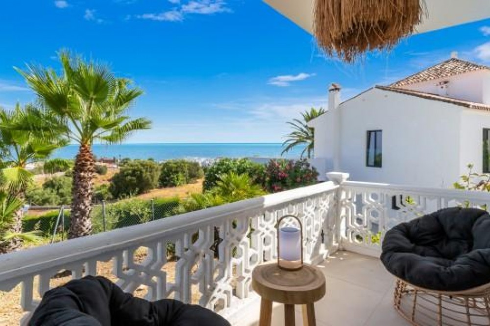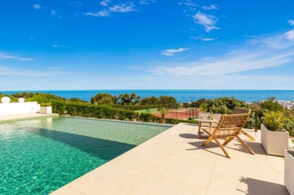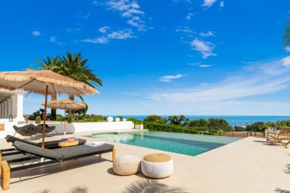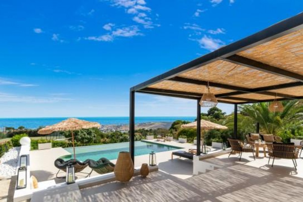 - Beautiful Villa for sale in Estepona with Panoramic Sea Views. Introducing an exquisite Ibiza-style villa, beautifully renovated in 2023, perched just above the vibrant Estepona town center. This south-facing haven offers breathtaking panoramic views of the Coast and the Mediterranean, ensuring privacy and tranquility on a sprawling plot of nearly 5,000m². The main house welcomes you with an open-plan living and dining area, complete with a charming wood-burning fireplace and a fully equipped, top-quality kitchen. The living area seamlessly extends to both covered and open terraces, leading to a lush garden and a stunning pool area. Additionally, the main floor features a convenient guest toilet and a dedicated laundry area. The first floor hosts three elegant guest bedrooms, each with its own bathroom, while the second floor is dedicated to the master suite, featuring an en suite bathroom and a spacious dressing area. Adding to the allure, a separate guest house provides complete privacy with its own bathroom, kitchenette, dining area, and terrace. Exceptional amenities abound, including a pool-house with a chic chillout and BBQ area, an infinity pool, and beautifully landscaped mature gardens. For sports enthusiasts, the property boasts a splendid tennis court. Practical features such as a two-car garage complete this unique offering. This remarkable villa is a true gem, offering unparalleled luxury and comfort, just moments from the heart of Estepona. A must-see for those seeking an idyllic retreat with modern elegance and stunning views.