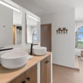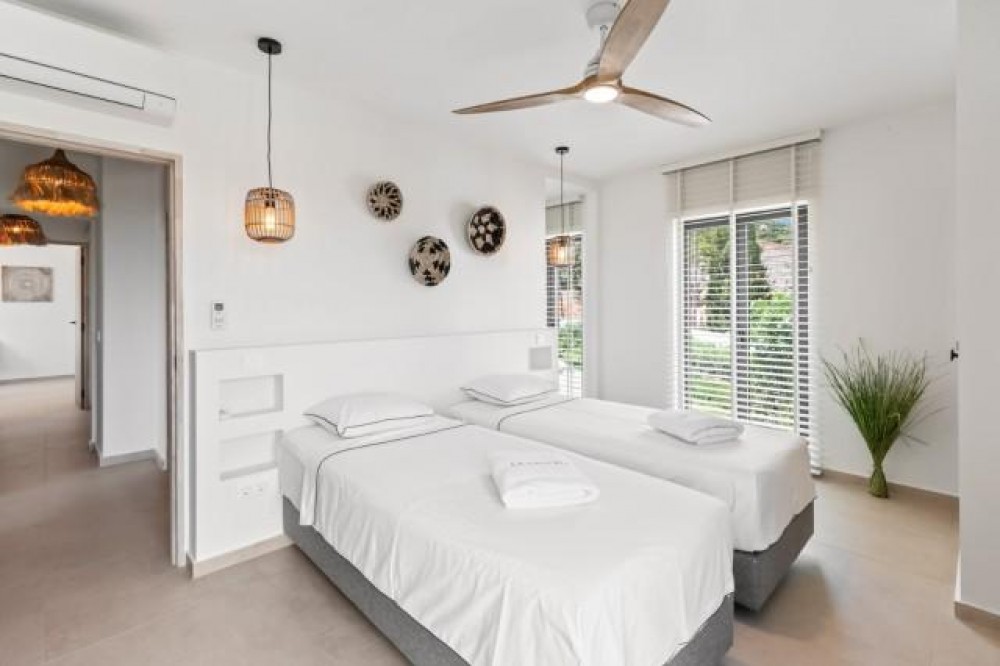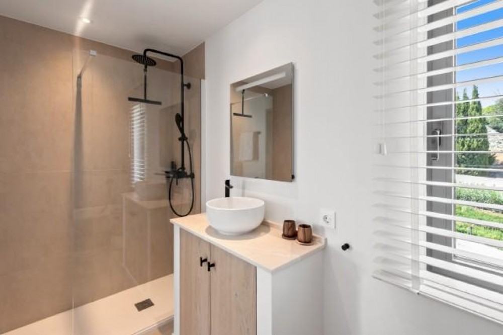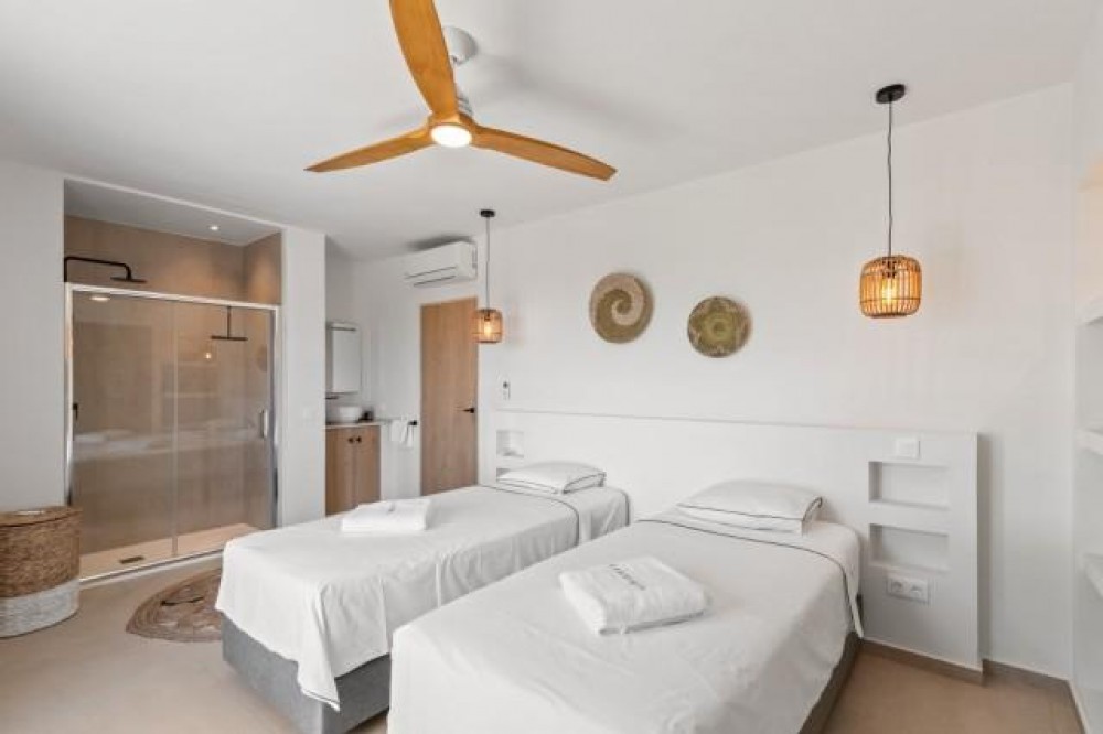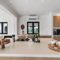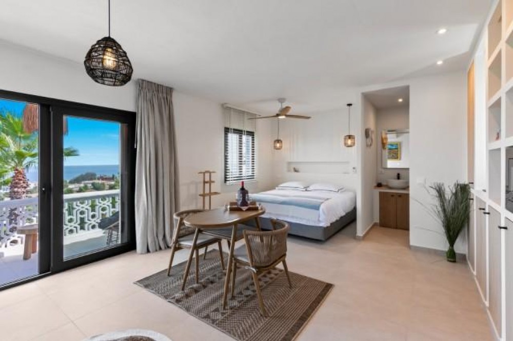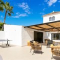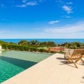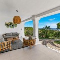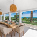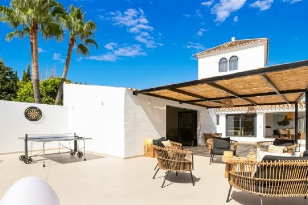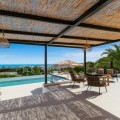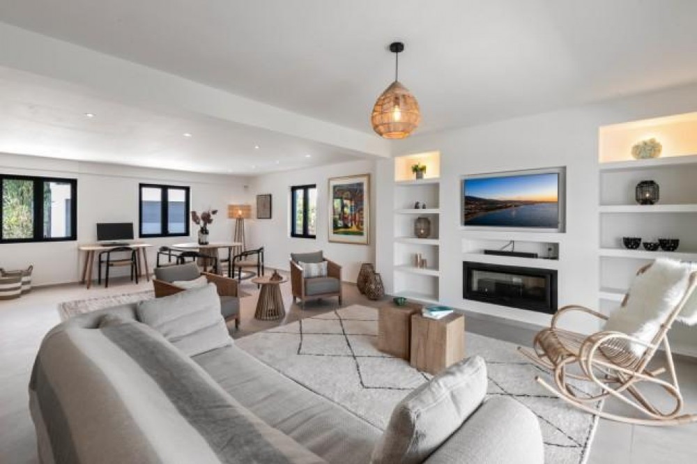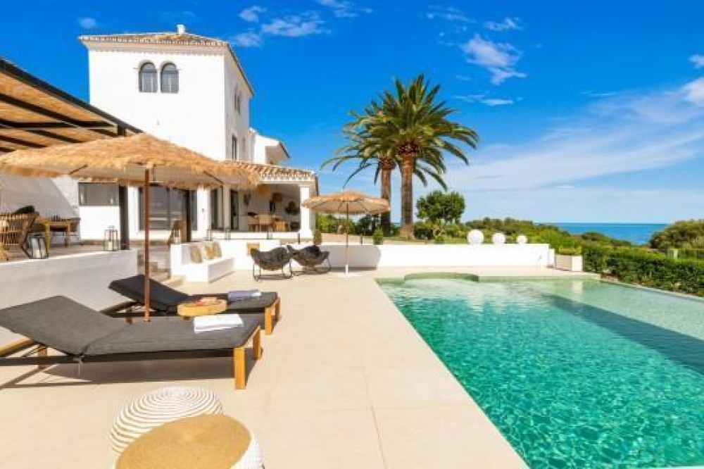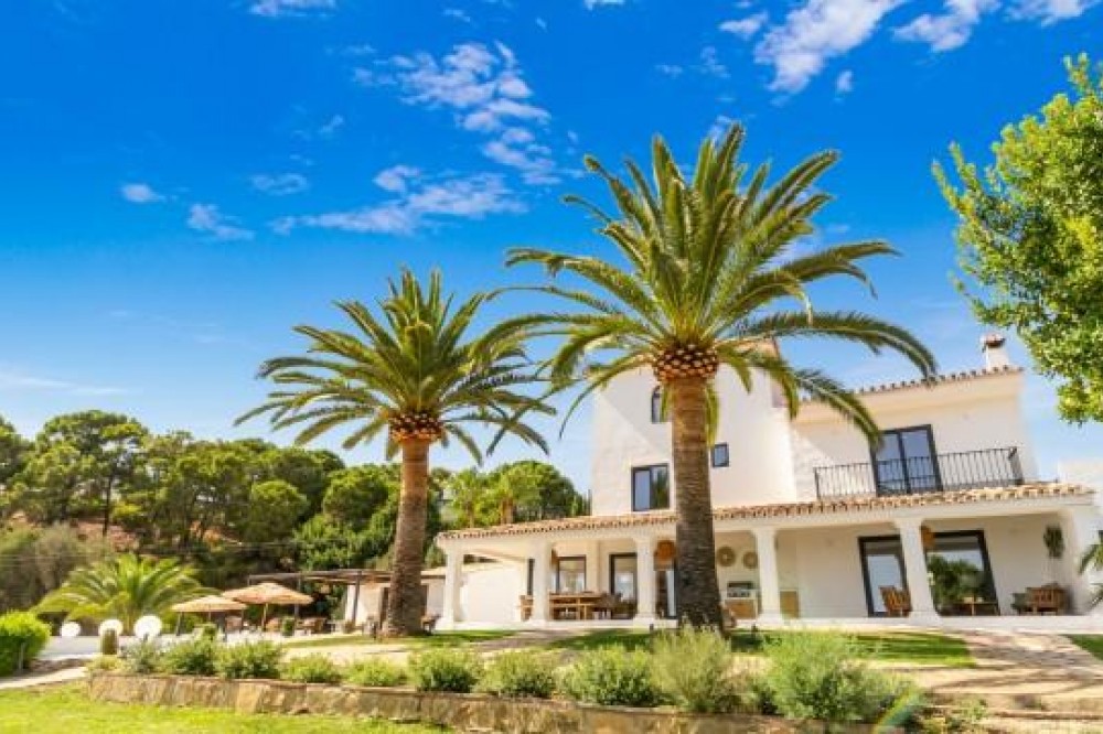 - Beautiful Villa for sale in Estepona with Panoramic Sea Views. Introducing an exquisite Ibiza-style villa, beautifully renovated in 2023, perched just above the vibrant Estepona town center. This south-facing haven offers breathtaking panoramic views of the Coast and the Mediterranean, ensuring privacy and tranquility on a sprawling plot of nearly 5,000m². The main house welcomes you with an open-plan living and dining area, complete with a charming wood-burning fireplace and a fully equipped, top-quality kitchen. The living area seamlessly extends to both covered and open terraces, leading to a lush garden and a stunning pool area. Additionally, the main floor features a convenient guest toilet and a dedicated laundry area. The first floor hosts three elegant guest bedrooms, each with its own bathroom, while the second floor is dedicated to the master suite, featuring an en suite bathroom and a spacious dressing area. Adding to the allure, a separate guest house provides complete privacy with its own bathroom, kitchenette, dining area, and terrace. Exceptional amenities abound, including a pool-house with a chic chillout and BBQ area, an infinity pool, and beautifully landscaped mature gardens. For sports enthusiasts, the property boasts a splendid tennis court. Practical features such as a two-car garage complete this unique offering. This remarkable villa is a true gem, offering unparalleled luxury and comfort, just moments from the heart of Estepona. A must-see for those seeking an idyllic retreat with modern elegance and stunning views.