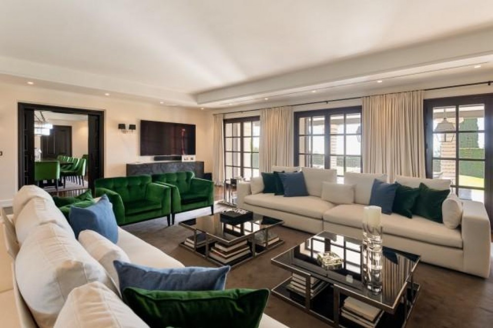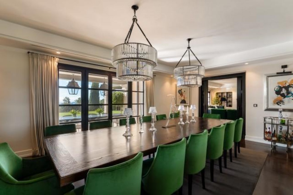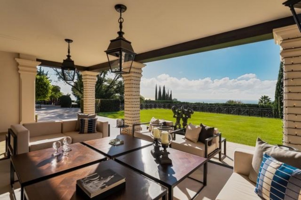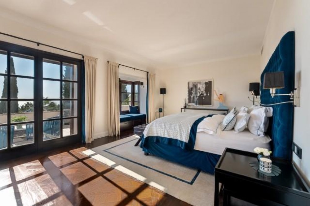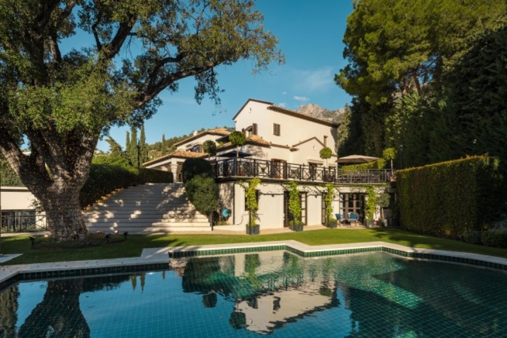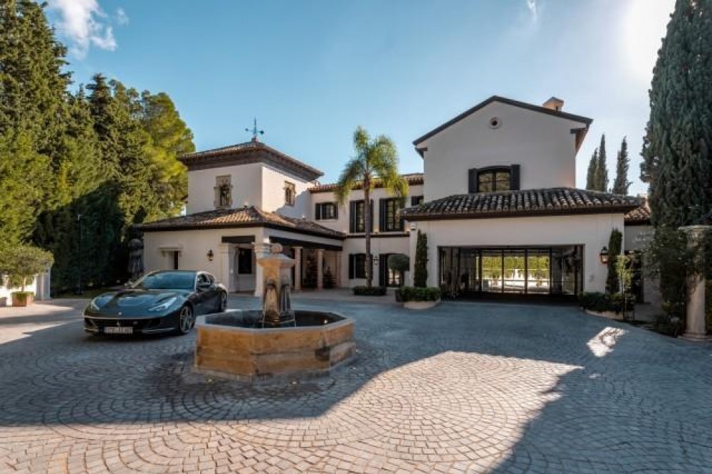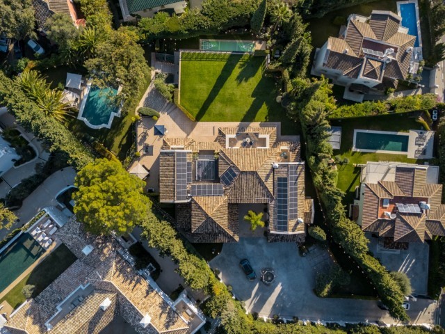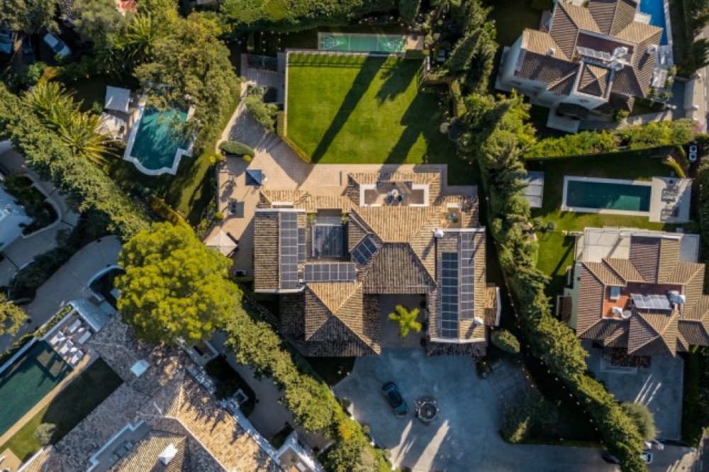 - This 7-bedroom villa is available for sale in the exclusive area on Marbella’s Golden Mile. Situated in a prime mountainside location, the property offers stunning panoramic views of the sea, lush gardens, and surrounding mountains. Renowned for its tranquility, security, and proximity to top-tier amenities, this prestigious neighborhood is one of Marbella’s most coveted areas. Spanning 1,041 m² on an expansive 3,093 m² plot, this property seamlessly combines elegance and comfort. The main level features a spacious living room with a gas fireplace, a separate dining area, a fully equipped kitchen with SMEG appliances (including 4 ovens), a study, a laundry room, and a guest bathroom. Expansive terraces extend the indoor living spaces outdoors, creating a seamless connection to the lush surroundings. In addition to the main villa, a separate building hosts a fully equipped gym, a Turkish bath, a massage room, a complete bathroom, and storage space, offering a private wellness retreat. Outdoors, the property boasts a beautiful pool area surrounded by landscaped gardens, a BBQ area, a shuffleboard court, and spacious terraces designed for relaxation and entertainment. The villa is equipped with state-of-the-art amenities, including underfloor heating, air conditioning with room-specific control, a built-in sound system, solar panels, and a newly renovated roof (2024). Additional highlights include wooden floors with green-tiled accents, double-glazed windows, elegant wooden doors, and bathrooms fitted with premium Villeroy & Boch fixtures and Zucchetti fittings. The villa includes a garage for 1.5 cars, a carport for two vehicles, and ample uncovered parking spaces. Security is ensured with an advanced system featuring intercom capabilities and surveillance cameras. This villa exemplifies the epitome of luxury living in Marbella, blending timeless elegance with modern functionality. Perfect for families or those seeking a serene retreat, it offers convenient access to shops, schools, and Marbella’s vibrant city. Whether unwinding in the private spa or hosting gatherings on the terrace with breathtaking sea views, this property delivers an unparalleled lifestyle.
