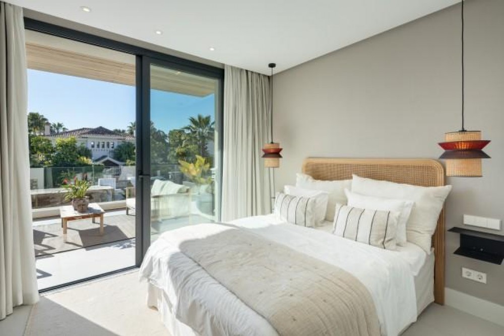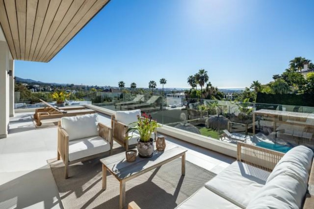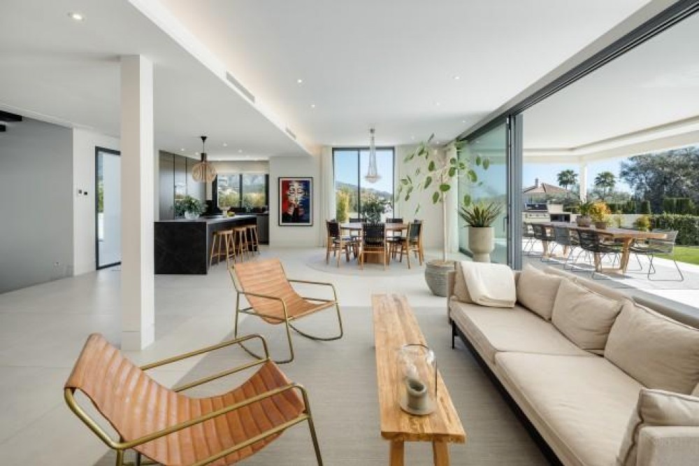 - Contemporary Luxury Villa in La Cerquilla, Marbella Outstanding modern villa nestled in the prestigious residential enclave of La Cerquilla, right in the heart of Marbella’s celebrated Golf Valley. This exquisite home offers the perfect harmony of luxury, convenience, and style—set against the stunning backdrop of sea and mountain views, and just moments from elite golf courses, international schools, and the glamour of Puerto Banús. Thoughtfully designed with contemporary flair, the villa features expansive floor-to-ceiling glass doors that flood the interior with natural light and create a seamless transition between indoor and outdoor living. The open-plan layout showcases a striking modern kitchen with a marble island and top-of-the-line integrated appliances, ideal for stylish yet functional living. Tailored for all-season enjoyment, the outdoor areas include generous terraces for alfresco dining and lounging, a chic pergola-shaded poolside retreat, and a fully equipped outdoor kitchenette with built-in BBQ—perfect for entertaining under the sun or stars. Inside, five beautifully appointed bedrooms ensure comfort and privacy for family and guests alike. The primary suite offers direct terrace access and a sumptuous en-suite bathroom, embodying the very essence of refined Marbella living. The lower level is a true highlight—featuring a bespoke entertainment area complete with a custom bar and TV lounge. Clever lighting throughout the home enhances its ambience, particularly in the evenings when the covered terraces and interiors come to life. A private driveway, secure entrance, and covered parking complete this exceptional property. It is a rare opportunity to own a sophisticated contemporary residence in one of Marbella’s most desirable postcodes—perfect for discerning buyers seeking modern luxury with timeless appeal.