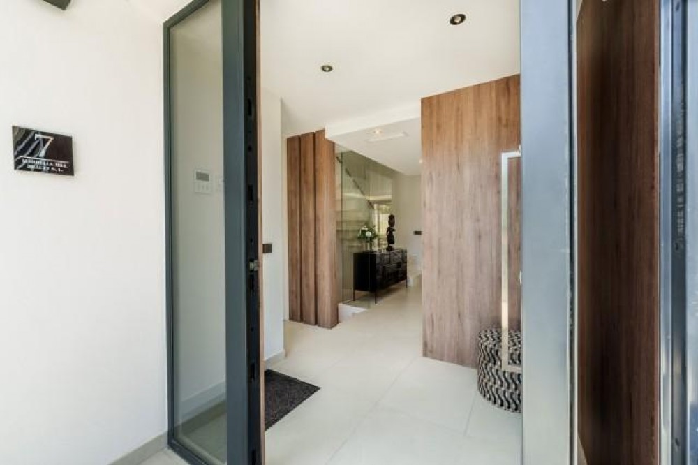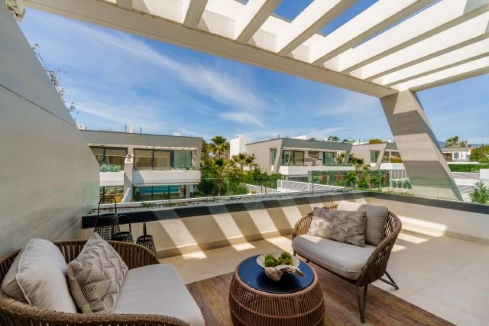 • Contemporary Semi-Detached Villa in Banus Bay – Steps from Puerto Banús Located in the exclusive gated community of Banus Bay, just moments from the golden beaches and vibrant heart of Puerto Banús, this modern 5-bedroom semi-detached villa offers an exceptional blend of luxury, comfort, and prime coastal living. With sleek architectural lines, bright open-plan interiors, and a wealth of outdoor space, this is an ideal residence for year-round enjoyment or a stylish holiday retreat. Set across multiple levels, the villa boasts a spacious main living and dining area that opens seamlessly onto a private terrace and swimming pool, perfect for entertaining or relaxing in the sun. The fully equipped modern kitchen is designed for both functionality and style, while the lower level offers a cosy TV lounge—a perfect hideaway for quiet evenings or family movie nights. A true highlight of the property is the rooftop solarium, complete with a jacuzzi and ample space for sunbathing or hosting under the stars. Surrounded by a private garden, the villa’s outdoor areas have been thoughtfully curated to enhance the Marbella lifestyle. This elegant residence is situated within a secure, gated complex with 24-hour surveillance and dedicated maintenance services, ensuring peace of mind and effortless living. Banus Bay is renowned for its tranquil yet central location, placing you within walking distance to designer boutiques, fine dining, lively beach clubs, and renowned international schools. Golf enthusiasts will be spoilt for choice, with more than ten top-tier courses within a short drive. Key Features: Five well-appointed bedrooms Private pool and garden Rooftop solarium with jacuzzi Lower-level TV lounge Secure gated community with 24-hour security Walking distance to beach, shops, and restaurants Proximity to top golf courses and schools An exceptional opportunity to enjoy the very best of Marbella’s lifestyle in a refined and secure setting. Whether for full-time living or as a sound investment, this Banus Bay villa is a rare gem on the Costa del Sol.