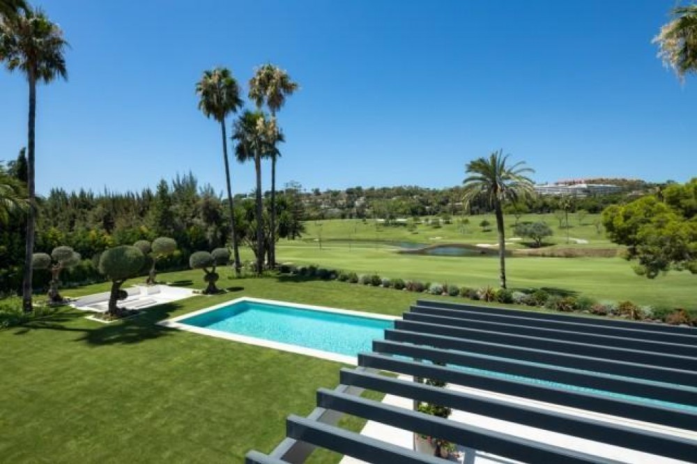 - An Exceptional Frontline Golf Villa in the Heart of Nueva Andalucía We are delighted to present Villa Solstice, a truly magnificent west-facing villa enjoying a frontline position to the prestigious Las Brisas Golf Club—one of Marbella’s most sought-after private members-only golf courses. Perfectly situated in the heart of Nueva Andalucía’s Golf Valley, this exquisite residence offers an enviable blend of timeless elegance, modern luxury, and a location second to none. Set amidst beautifully landscaped gardens, the outdoor space has been masterfully designed to embrace the Mediterranean lifestyle. The meticulously manicured grounds feature a stunning private swimming pool, complemented by a sunken chill-out lounge, ideal for both relaxation and stylish entertaining. A charming pergola houses a custom-designed bar and an alfresco dining area, providing the perfect setting for gatherings with family and friends whilst enjoying breathtaking sunsets that give the villa its name. Step inside and you are immediately welcomed by a calming, sophisticated interior. The home is finished with elegant Crema Sara marble flooring throughout and a soft, neutral colour palette that enhances the sense of space and serenity. Architectural details such as the striking triangular ceiling design in the main living area create an airy, open-plan atmosphere, perfect for both relaxed living and entertaining on a grand scale. The bespoke kitchen is a chef’s delight—fitted with top-of-the-line appliances, extensive cabinetry, and generous countertop space, marrying functionality with style. Adjacent lies a refined dining area that opens seamlessly onto the lounge and outdoor terraces, ensuring a continuous flow between indoor and outdoor living. The villa offers a selection of beautifully appointed guest bedrooms, each with its own en-suite and positioned across the ground and lower levels for maximum comfort and privacy. The upper floor is entirely devoted to the master suite—an indulgent private retreat featuring an expansive walk-in wardrobe, a luxurious bathroom, and access to a private terrace with sweeping views over the golf course. The lower level is a sanctuary of leisure and wellness, boasting a fully equipped spa with an indoor pool, sauna, and Turkish bath. There is also a dedicated cinema room and an entertainment lounge, offering residents the ultimate in comfort and recreation. Additional features include a secure private garage with space for three vehicles and a private driveway for added convenience. With its unparalleled location, refined finishes, and comprehensive range of luxury amenities, Villa Solstice is a rare gem that combines the tranquillity of frontline golf living with easy access to an array of top-tier amenities, including international schools, fine dining, shopping, Puerto Banús, and the famed Marbella Golden Mile.