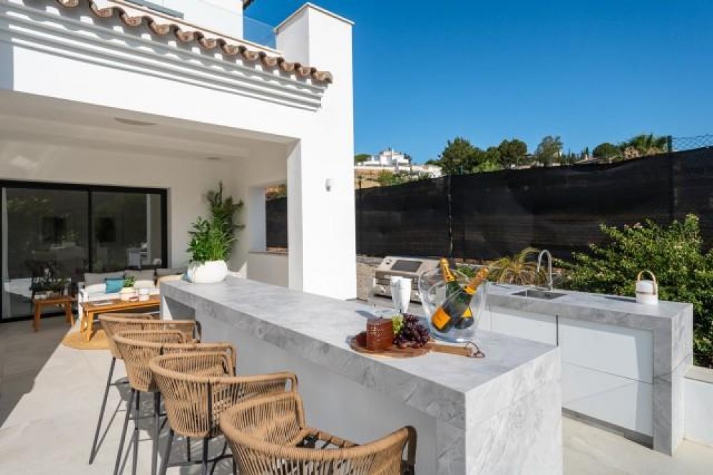- Positioned within the prestigious Santa Maria Golf urbanization in Elviria, it is an extraordinary frontline golf villa for sale in Marbella offering contemporary luxury, seamless design, and a highly desirable setting. Built in 2021 on a generous plot of 1,743 square meters, the villa boasts 902 square meters, including 264m2 of terraces, offering an expansive indoor-outdoor living experience tailored for both leisure and lifestyle. Spread across three levels served by a lift and a wide staircase, the villa is thoughtfully laid out to balance elegance with practicality. It features five spacious en-suite bedrooms (3 of them are on the same level). The design embraces refined materials such as ceramic stone and warm wood finishes, brought together under a sleek architectural vision. High-end details including Miele appliances, solar panels, electric blinds, and an automatic irrigation system underline the home’s intelligent, sustainable engineering. Each floor flows effortlessly to the next, with expansive terraces accessible from all bedrooms and common areas. Outdoor spaces include a covered swimming pool, private barbecue zone, and a sauna—ideal for entertaining family life, or quiet relaxation. Panoramic views over the Santa Maria Golf course and out to the Mediterranean Sea reinforce the villa’s prime positioning and tranquil atmosphere. Security and functionality go hand in hand. It is fitted with security shutters, a comprehensive alarm system, and private gated access. A large basement area includes a three-car garage and a storeroom—perfect for storing golf equipment or seasonal belongings—while additional outdoor parking ensures practicality for everyday living or entertaining. The villa’s location in the sought-after Elviria district places it just a five-minute drive from Carrefour supermarket and essential shops, while the golden sands and vibrant atmosphere of Nikki Beach are less than ten minutes away. Families will value the proximity to international schools such as the German International College, reachable within a few minutes by car. As part of the PS GOLF (DEL) (STA M GOLF) community, Villa Andrea enjoys direct access to Santa Maria Golf & Country Club’s acclaimed 18-hole course, as well as its driving range and putting green. The surrounding neighborhood features upscale villas and low-density residences, offering tranquility, scenic golf views, and a well-maintained environment. Dining, sports, and leisure options are abundant. Gastronomic highlights include El Lago Restaurant at Greenlife Golf, a Michelin-starred culinary destination, and beachfront restaurants such as Playa de la Fontanilla and Chiringuito Los Tony’s. For world-class dining and entertainment, Puerto Banús is a short drive away with venues like La Sala offering international menus and a lively social scene. Luxury shopping is within easy reach, with La Cañada Shopping Center and the designer boutiques of Puerto Banús and Marbella Old Town providing extensive retail options. The villa’s connectivity is another key advantage, with the A-7 motorway offering a direct 40-minute route to Málaga-Costa del Sol Airport. Public transport links, including bus services, further support regional and local accessibility. Tennis and padel courts, fitness centers, and beach clubs add further lifestyle value, along with Elviria’s scenic surroundings ideal for walking, cycling, or unwinding outdoors. The area’s refined yet relaxed character appeals to permanent residents, holiday homeowners, and investors alike. This villa represents a rare opportunity to acquire a fully modernized, frontline golf villa with large built dimensions, generous terraces, and one of the most enviable plots in Elviria. Its seamless blend of contemporary architecture, top-tier amenities, and coastal golfside location make it a standout choice for those seeking space, sophistication, and superior quality on the Costa del Sol. Villa, Frontline Golf, Equipped Kitchen, Underground parking, Pool: Private, Garden: Private, Facing: Southeast Views: Countryside, Courtyard, Garden, Golf, Pool, Sea Features: 2 Parking Places, Alarm System, Automatic Irrigation System, Barbecue, Basement, Close to schools, Completely Equipped Kitchen, Contemporary style, Conveniently Situated for Golf, Conveniently Situated Schools, Conveniently Situated Tennis, Electric Blinds, En suite bathroom, Excellent Condition, Fireplace, Frontline Golf, Furnished, Garden and Pool View, Gated Complex, Guest Apartment, Landscaped Gardens, Lift, Luminous, Luxury Fittings, Mature Garden, Modern Style, Private pool, Sauna, Sea Views, Solar Heated Water, Solar Panels, Sought After Area, Spacious Accommodation, Storage room, Stylish Accommodation, Subtropical Gardens, Underground parking, Wood Flooring