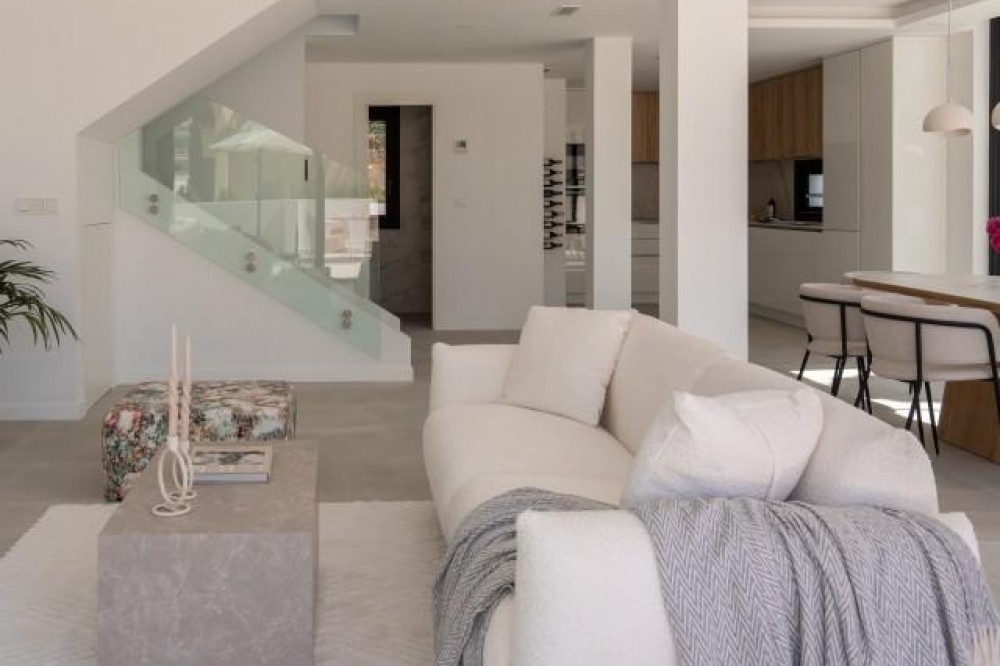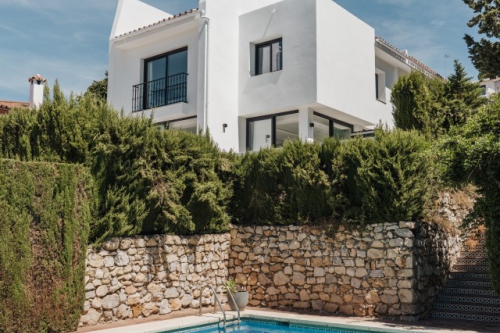 - Modern Elegance in the Heart of Nueva Andalucía This beautifully renovated villa offers the perfect blend of contemporary design, comfort, and an unbeatable location in the heart of Nueva Andalucía. Spanning two levels, the home features three spacious bedrooms, each with its own en suite bathroom. Two of the bedrooms enjoy partial sea views, while a stylish guest toilet adds extra convenience. With its southwest orientation, the villa is bathed in natural light throughout the day, creating a warm and inviting atmosphere both indoors and out. Its slightly elevated position provides serene, partial views of the sea, while the area’s restaurants, cafés, and supermarkets are just a short stroll away. Set within an exclusive community of only five villas, the property combines the privacy of a detached home with the comfort of a shared swimming pool – perfect for relaxation and enjoying Marbella’s sunny lifestyle. This is a rare opportunity to own a modern turnkey villa in one of the most desirable locations on the Costa del Sol.