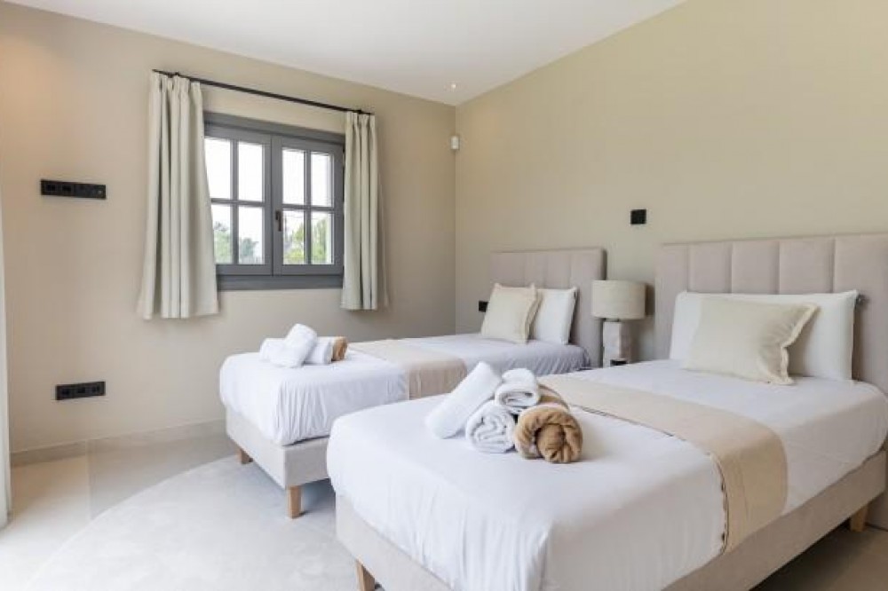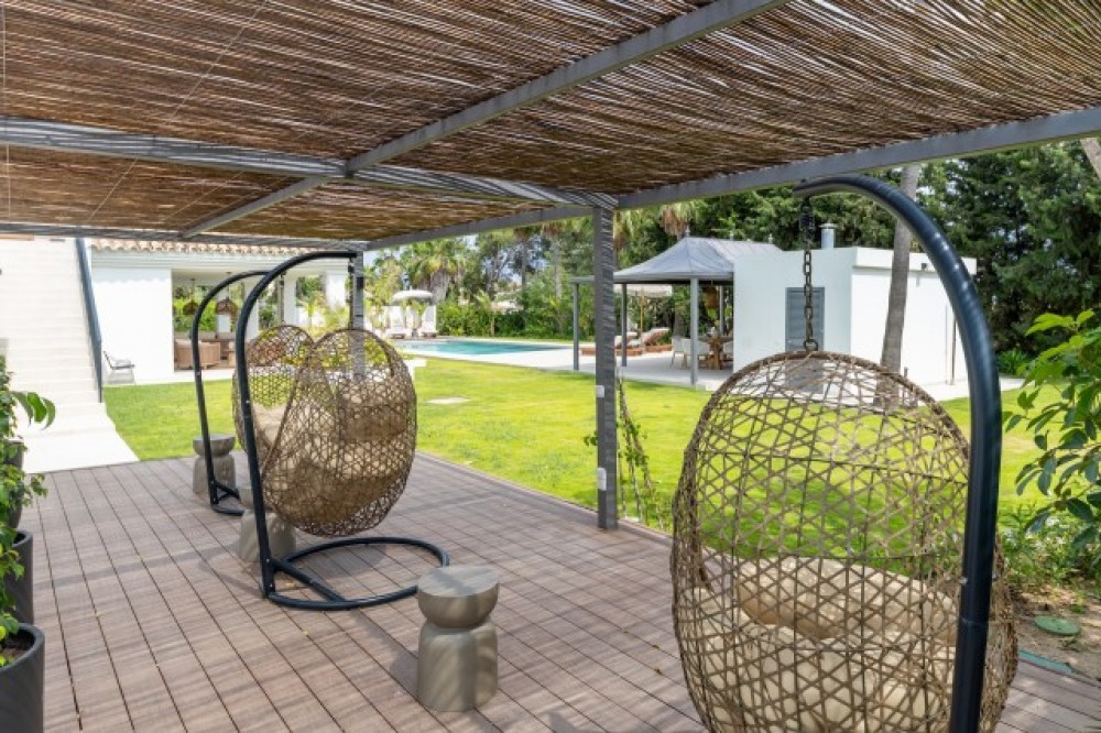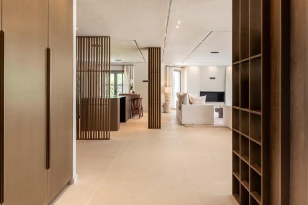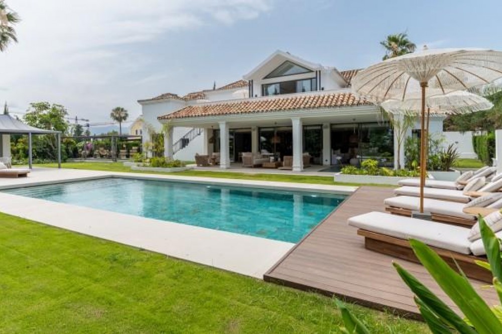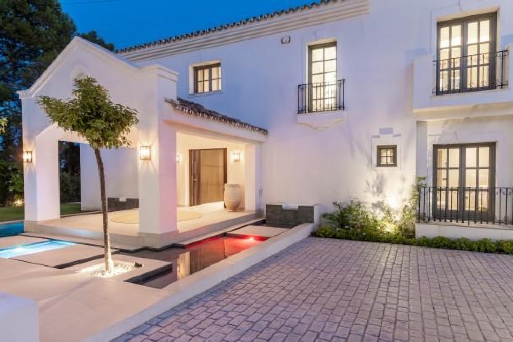 - Andalusian-Inspired Villa Near Atalaya Golf Just 400 metres from Atalaya Golf Club, this elegant villa combines timeless Andalusian architecture with contemporary luxury. Surrounded by mature trees, landscaped gardens, and a private pool, it offers a serene setting that perfectly balances sophistication and comfort. The interiors are bright and airy, with open-plan living spaces that flow seamlessly to the outdoors. The kitchen, equipped with Siemens appliances, and natural wood accents add warmth and style, while two master suites with spa-inspired bathrooms provide a refined retreat, each overlooking the lush gardens. A sweeping driveway leads to secure underground parking and a naturally lit basement, a versatile space that can be transformed into a gym, cinema, entertainment room, or wine cellar. Blending exclusivity, design, and location, this villa is ideally positioned to enjoy the best of golf, fine dining, and leisure on the Costa del Sol.