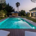 - Andalusian-Inspired Villa Near Atalaya Golf Just 400 metres from Atalaya Golf Club, this elegant villa combines timeless Andalusian architecture with contemporary luxury. Surrounded by mature trees, landscaped gardens, and a private pool, it offers a serene setting that perfectly balances sophistication and comfort. The interiors are bright and airy, with open-plan living spaces that flow seamlessly to the outdoors. The kitchen, equipped with Siemens appliances, and natural wood accents add warmth and style, while two master suites with spa-inspired bathrooms provide a refined retreat, each overlooking the lush gardens. A sweeping driveway leads to secure underground parking and a naturally lit basement, a versatile space that can be transformed into a gym, cinema, entertainment room, or wine cellar. Blending exclusivity, design, and location, this villa is ideally positioned to enjoy the best of golf, fine dining, and leisure on the Costa del Sol.
