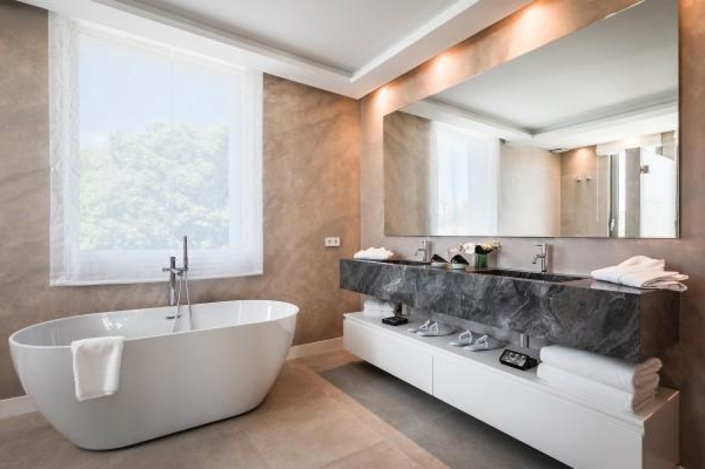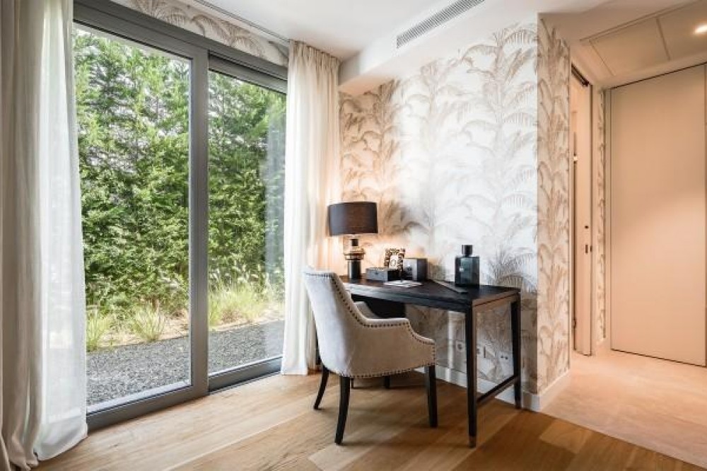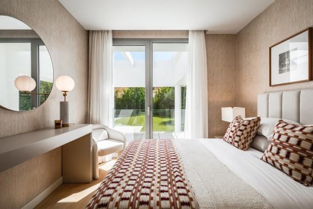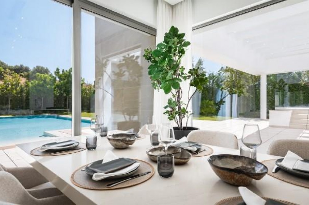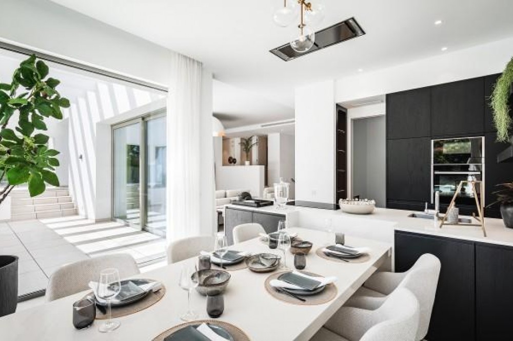 - Nestled in the serene and well-established residential enclave of El Paraíso, this sophisticated contemporary villa enjoys a prime setting on Marbella’s coveted New Golden Mile—just minutes from Puerto Banús, San Pedro de Alcántara, and Estepona. Designed to maximise natural light, space, and modern comfort, the home is arranged across three impeccably planned levels. The main floor boasts an expansive open-plan living and dining area that flows effortlessly into a fully equipped, high-end German kitchen. Floor-to-ceiling sliding doors open onto generous, partially covered terraces featuring stylish outdoor lounging and dining spaces—ideal for enjoying the Costa del Sol’s enviable year-round climate. The villa offers five spacious bedrooms, each with its own en-suite bathroom, as well as a guest toilet. Premium finishes, including natural wood floors, underfloor heating, and electric blinds, elevate the home’s refined yet functional design. Outside, a private, mature garden and sparkling swimming pool create an oasis of tranquility, enhancing the property’s appeal as both a luxurious permanent residence and an exceptional holiday retreat. The versatile lower level features a generous multi-purpose space, perfect for creating a gym, cinema room, office, or additional guest suites—allowing you to tailor the home to your lifestyle. Additional highlights include covered parking for two vehicles. The villa is offered fully furnished and move-in ready, providing a seamless transition into one of Marbella’s most desirable locations.