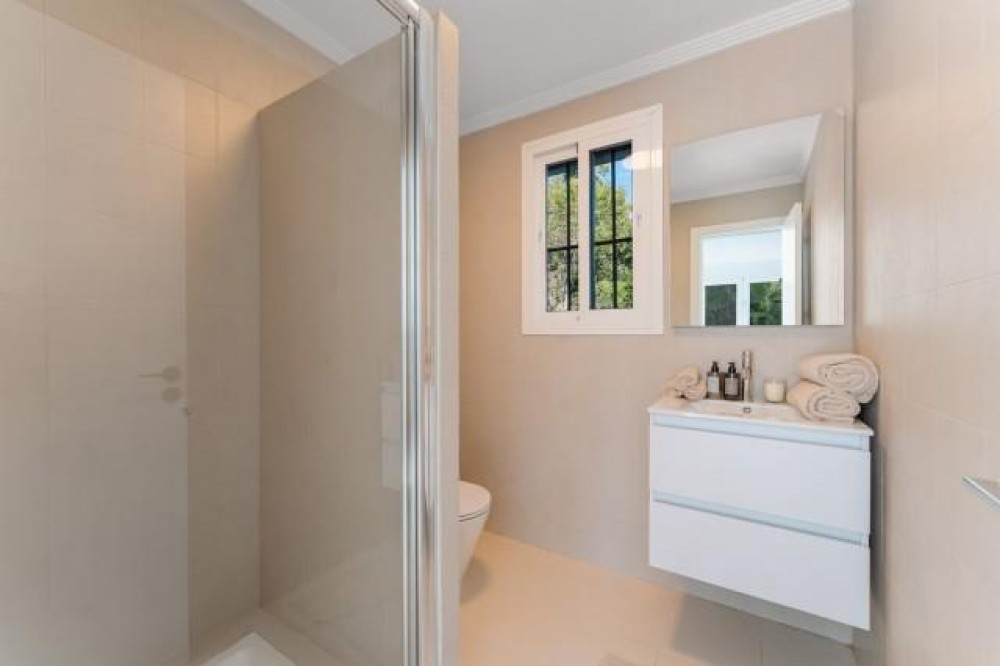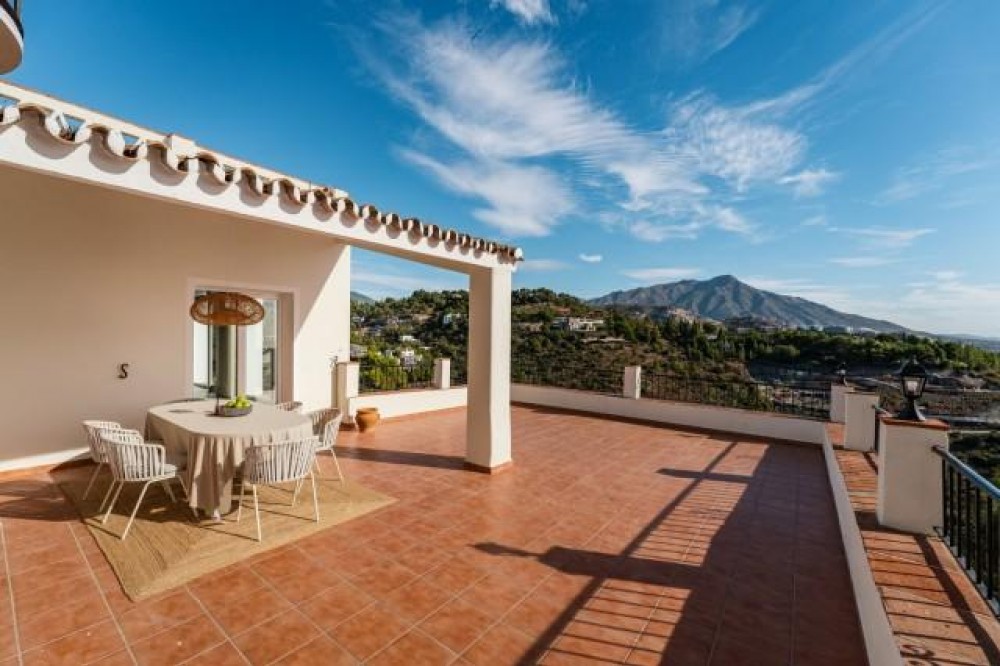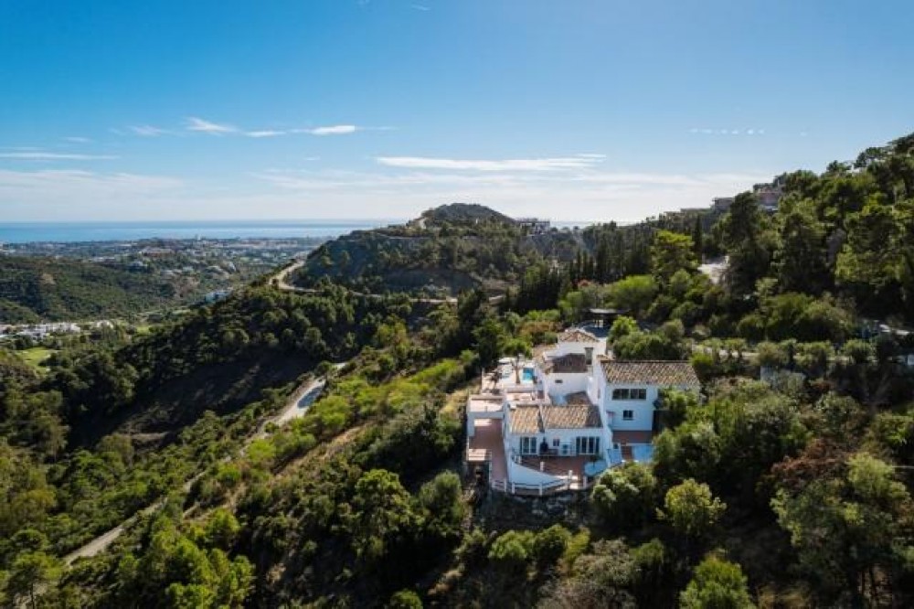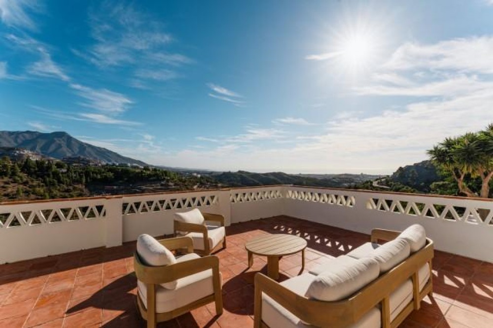 - This elegant residence, located in El Madroñal 2, an exclusive gated community in Benahavís, offers an exceptional combination of privacy, nature, and luxury. The property, comprising the main house, a staff apartment on the lower level, and a guest house above the garage, occupies a spacious, elevated plot of almost 4,800 m², boasting breathtaking panoramic views of the Mediterranean Sea and the mountains. Its architecture blends traditional Andalusian elements with contemporary design, creating a warm and sophisticated ambiance. The interiors are characterized by their comfort, with spacious living areas connected to a modern kitchen, en-suite bedrooms, a laundry room, and direct access to terraces and the swimming pool. The surrounding area offers 24-hour security, absolute tranquility, and proximity to nature, along with high-end amenities, golf courses, international schools, and prestigious restaurants. Furthermore, it features ample parking and extensive outdoor spaces designed to fully enjoy the climate and the views. Villa, Close to Golf, Fitted Kitchen, Parking: Garage, Pool: Private, Garden: Private, Facing: Southeast Views: Breathtaking, Garden, Mountains, Open views, Panoramic, Pool, Sea Features: 2 Parking Places, 24 hrs Security System, 5-10 minutes to Golf Course, Air Conditioning Hot/Cold, Close to schools, Condition - Good, Conveniently Situated for Golf, Conveniently Situated Schools, En suite bathroom, Fitted Kitchen, Furnished, Garage, Garden and Pool View, Gated Complex, Guest House, Laundry room, Mountain View, Private pool, Sea Views, Sep. guest accommodation, Staff Accommodations