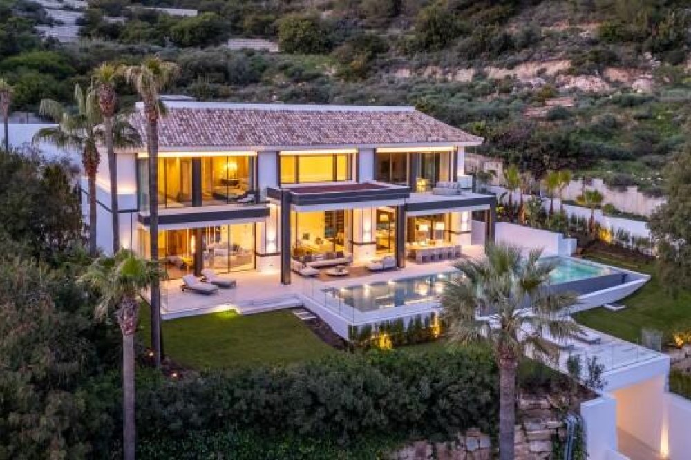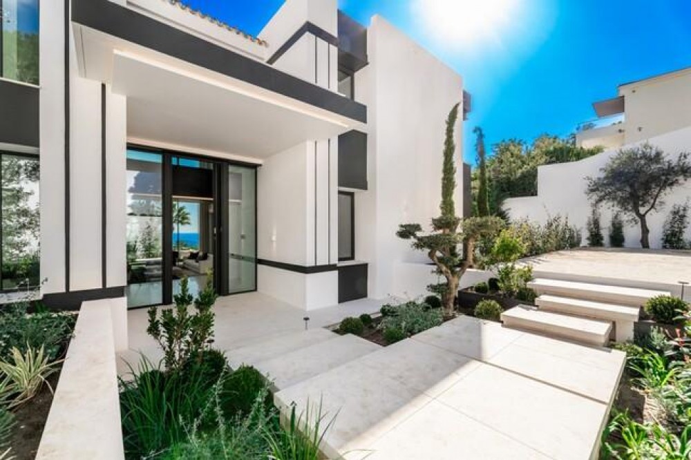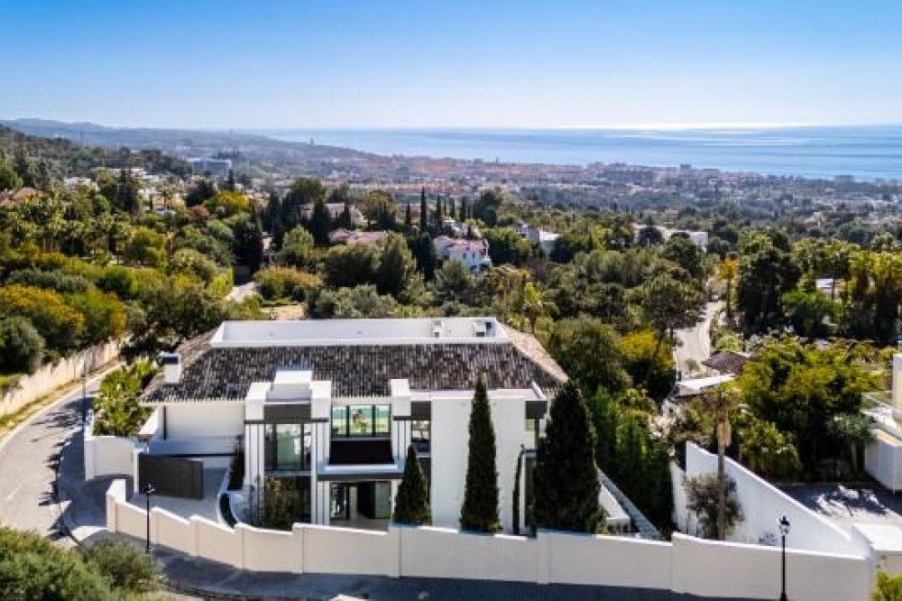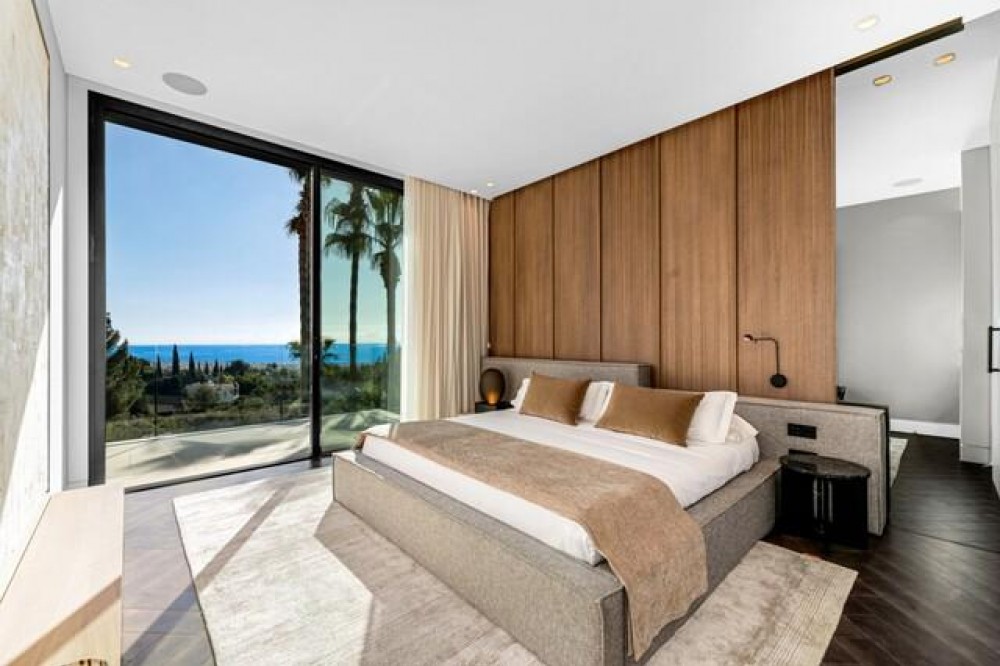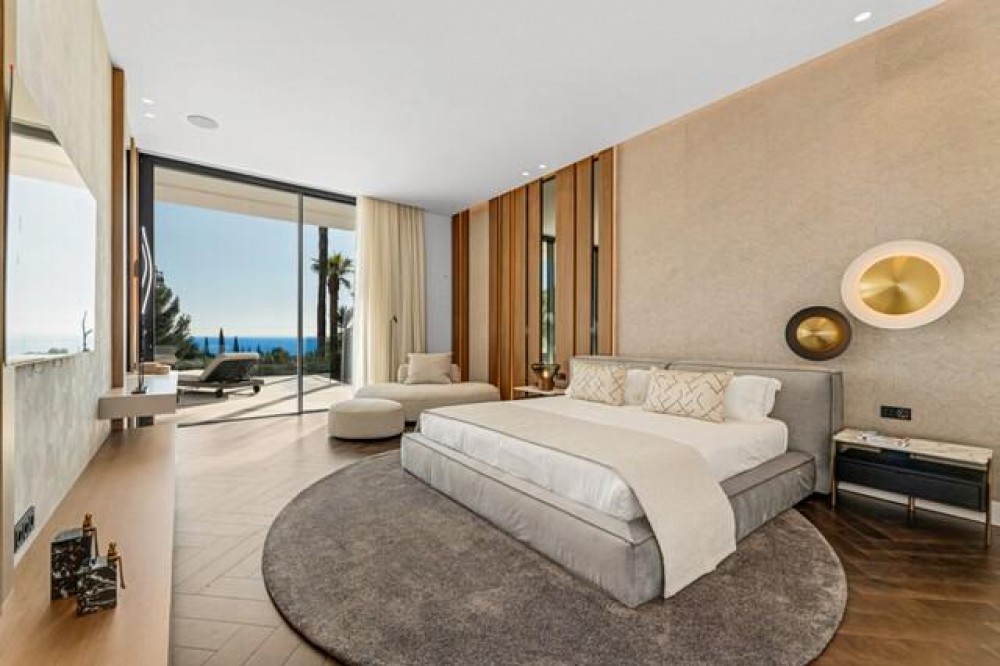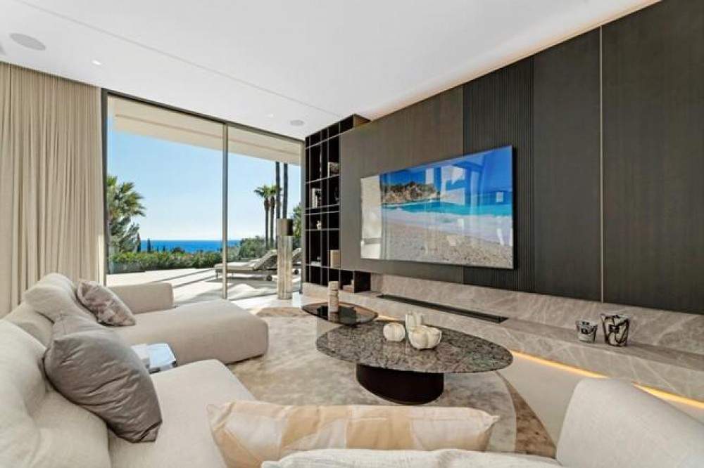 - This exceptional luxury villa, designed by renowned architect Miguel Tobal, represents the pinnacle of contemporary Mediterranean living. Located within an exclusive gated community, this prestigious residence offers ultimate privacy, refined elegance, and panoramic sea views, making it one of the most desirable high-end properties currently available. A striking double-height entrance welcomes you into expansive open-plan interiors, where soaring ceilings and floor-to-ceiling windows flood the home with natural light. The seamless indoor-outdoor flow enhances the sense of space, while breathtaking coastal views and landscaped surroundings create a serene and sophisticated atmosphere. At the heart of the home, a central lounge connects beautifully with multiple living areas. One wing features a stylish and comfortable TV room, while the opposite side hosts a spectacular dining area and designer Modulnova kitchen, fully equipped with premium Gaggenau appliances and an innovative concealment system. An additional service kitchen ensures effortless entertaining, with direct access to a fully equipped outdoor BBQ area and a state-of-the-art wine cellar. The main level includes two spacious guest suites, each offering privacy, bespoke finishes, and contemporary luxury design. The upper floor is dedicated to an impressive master suite, complete with a generous walk-in wardrobe, spa-inspired bathroom, and private terrace with stunning sea views. Three additional en-suite bedrooms on this level provide generous proportions, natural light, and elegant finishes. The lower level is designed for wellness and entertainment, featuring a heated indoor swimming pool, Hammam, sauna, and bright English patio. A fully equipped gym, elegant bar, games room, and comfortable TV lounge create the ultimate luxury lifestyle experience. A six-car garage completes this level, ideal for collectors. Advanced home technology includes a fully integrated smart home system, climate control, lift access, and automated window solutions throughout. Outside, landscaped gardens surround a spectacular infinity pool, offering complete privacy and tranquil outdoor living. This extraordinary contemporary villa combines architectural excellence, luxury amenities, and timeless design, creating a unique opportunity to acquire a landmark luxury property in a highly sought-after setting.