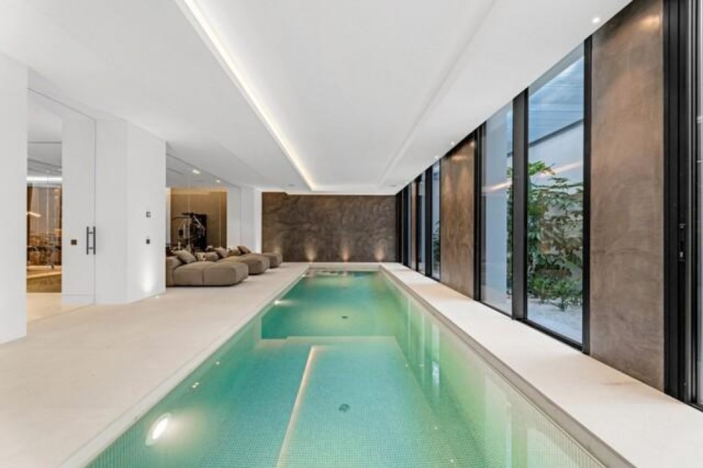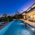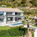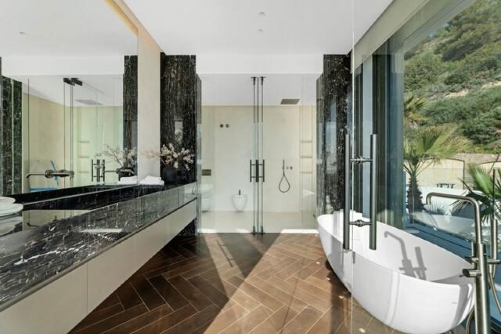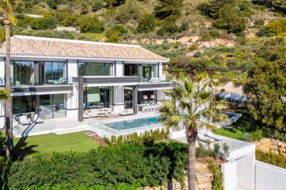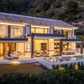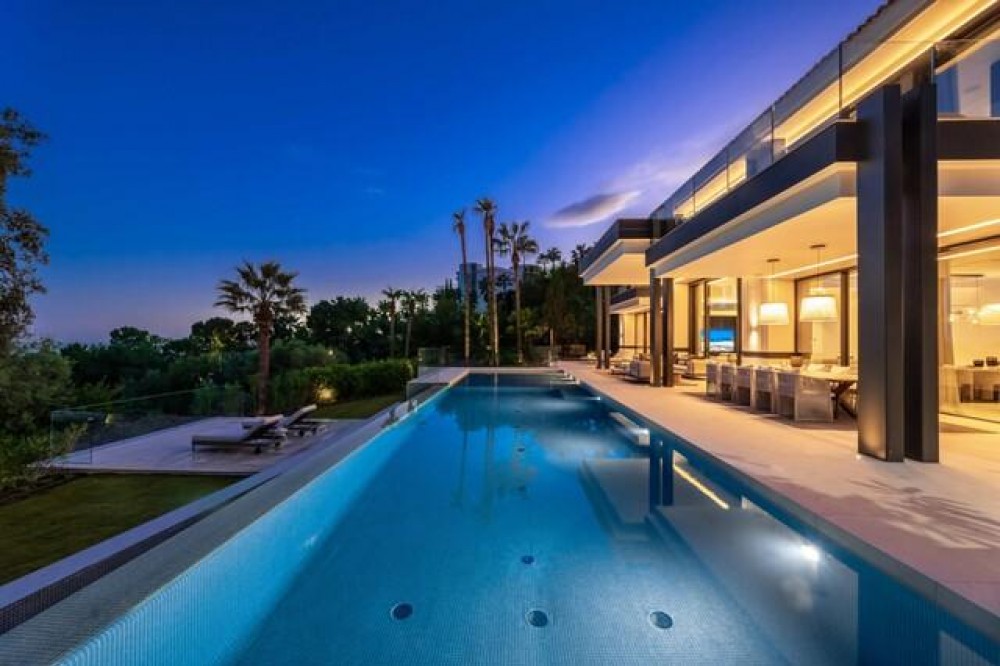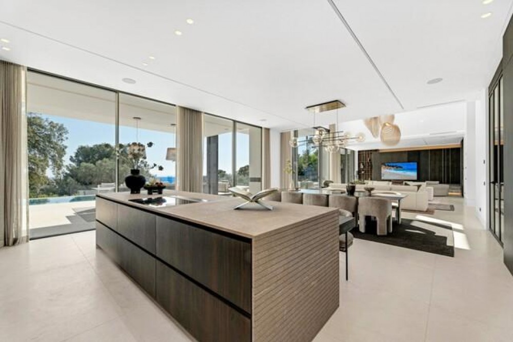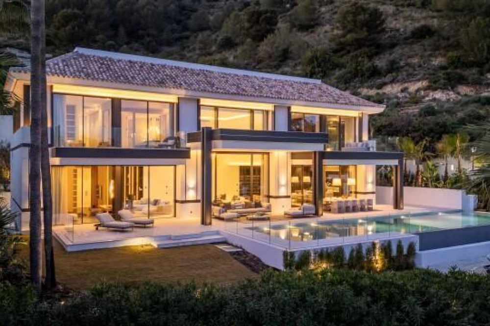 - This exceptional luxury villa, designed by renowned architect Miguel Tobal, represents the pinnacle of contemporary Mediterranean living. Located within an exclusive gated community, this prestigious residence offers ultimate privacy, refined elegance, and panoramic sea views, making it one of the most desirable high-end properties currently available. A striking double-height entrance welcomes you into expansive open-plan interiors, where soaring ceilings and floor-to-ceiling windows flood the home with natural light. The seamless indoor-outdoor flow enhances the sense of space, while breathtaking coastal views and landscaped surroundings create a serene and sophisticated atmosphere. At the heart of the home, a central lounge connects beautifully with multiple living areas. One wing features a stylish and comfortable TV room, while the opposite side hosts a spectacular dining area and designer Modulnova kitchen, fully equipped with premium Gaggenau appliances and an innovative concealment system. An additional service kitchen ensures effortless entertaining, with direct access to a fully equipped outdoor BBQ area and a state-of-the-art wine cellar. The main level includes two spacious guest suites, each offering privacy, bespoke finishes, and contemporary luxury design. The upper floor is dedicated to an impressive master suite, complete with a generous walk-in wardrobe, spa-inspired bathroom, and private terrace with stunning sea views. Three additional en-suite bedrooms on this level provide generous proportions, natural light, and elegant finishes. The lower level is designed for wellness and entertainment, featuring a heated indoor swimming pool, Hammam, sauna, and bright English patio. A fully equipped gym, elegant bar, games room, and comfortable TV lounge create the ultimate luxury lifestyle experience. A six-car garage completes this level, ideal for collectors. Advanced home technology includes a fully integrated smart home system, climate control, lift access, and automated window solutions throughout. Outside, landscaped gardens surround a spectacular infinity pool, offering complete privacy and tranquil outdoor living. This extraordinary contemporary villa combines architectural excellence, luxury amenities, and timeless design, creating a unique opportunity to acquire a landmark luxury property in a highly sought-after setting.
