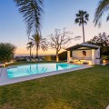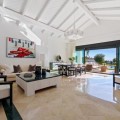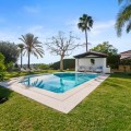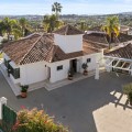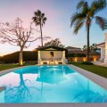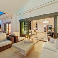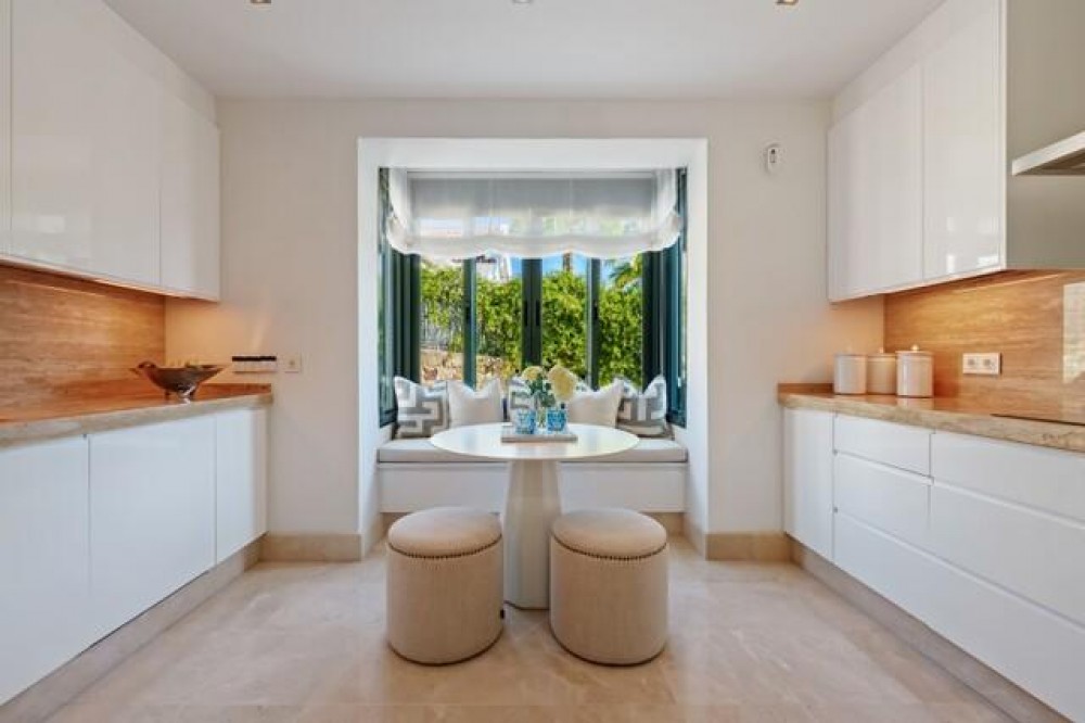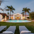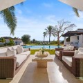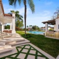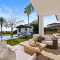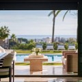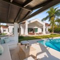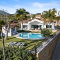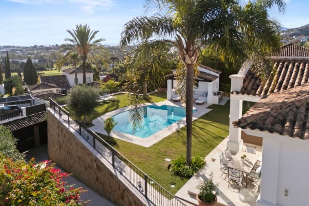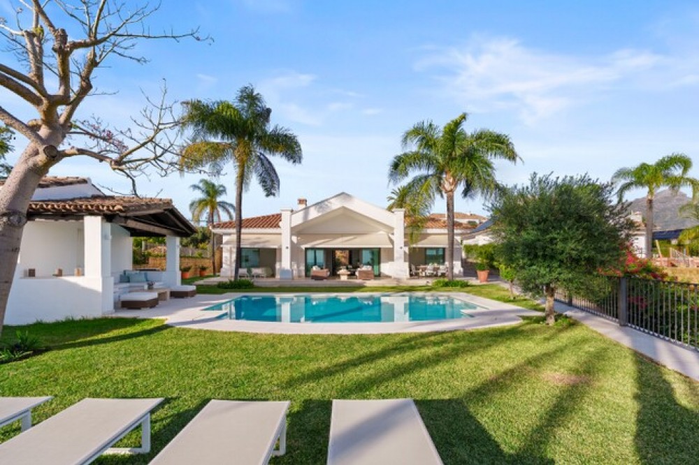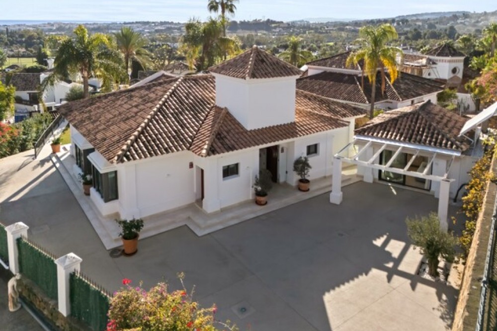 • This elegant luxury villa is located within the prestigious residential enclave of Nueva Andalucía, offering an exceptional combination of privacy, elevated views, and convenient access to Marbella’s finest amenities. Positioned on an elevated plot within a secure and discreet community, the property enjoys open views across the surrounding landscape and towards the Mediterranean Sea, creating a tranquil and exclusive living environment. The villa is thoughtfully arranged across a single main level, providing a practical and comfortable layout with a natural separation between living areas and private bedroom accommodation. The principal living and dining space is bright and generously proportioned, featuring high ceilings, marble flooring, and full-height sliding doors that seamlessly connect the interiors with the terraces and garden. This open-plan design enhances natural light and creates an effortless indoor-outdoor flow, ideal for both year-round living and seasonal enjoyment. Outside, the property features a mature, level garden designed for privacy and low-maintenance living. A centrally positioned swimming pool is surrounded by multiple terraces, offering both open and covered spaces for relaxation and entertaining. A detached poolside pavilion adds further versatility, complete with a comfortable lounge area and outdoor kitchen, extending the usable living space and enhancing the Mediterranean lifestyle. The fully enclosed grounds provide a high degree of privacy while maintaining a welcoming and elegant atmosphere. The south-facing orientation ensures abundant sunlight throughout the day, further enhancing the outdoor experience. The location offers excellent connectivity, placing the villa within close reach of renowned golf courses, fine dining, shopping, and international schools. Puerto Banús and central Marbella are only a short drive away, making this property ideal as a primary residence, holiday home, or investment opportunity. Combining a prime Nueva Andalucía address with a balanced layout, privacy, and beautifully designed indoor and outdoor spaces, this villa represents refined Mediterranean living in one of Marbella’s most sought-after residential areas.