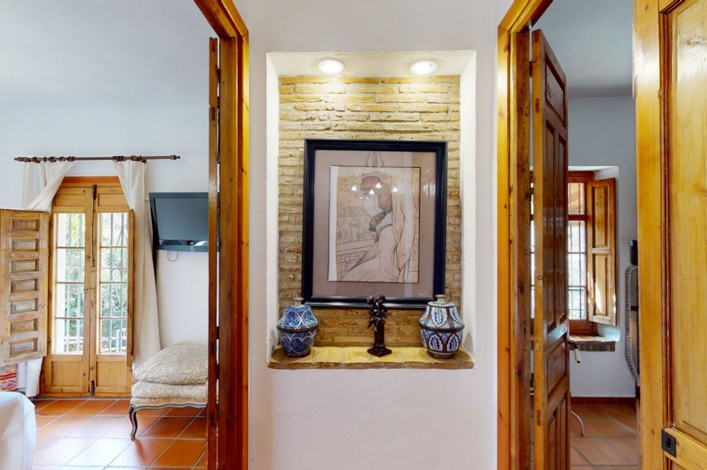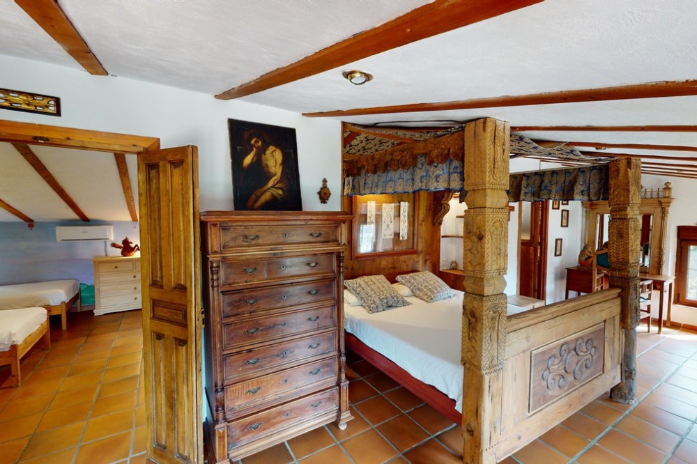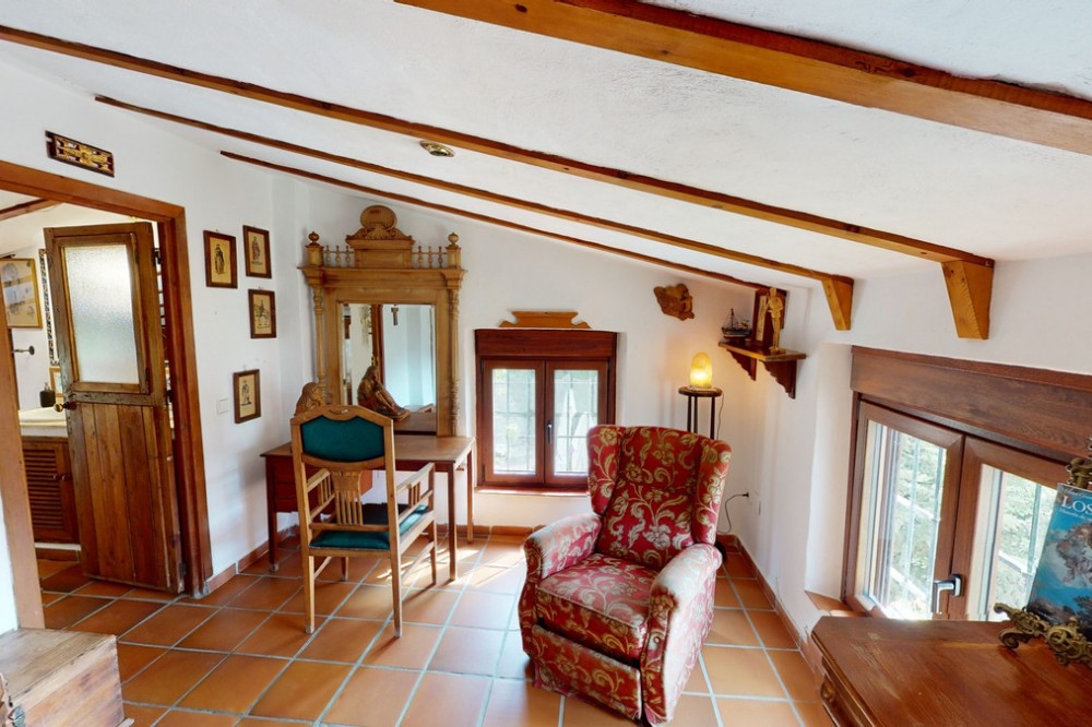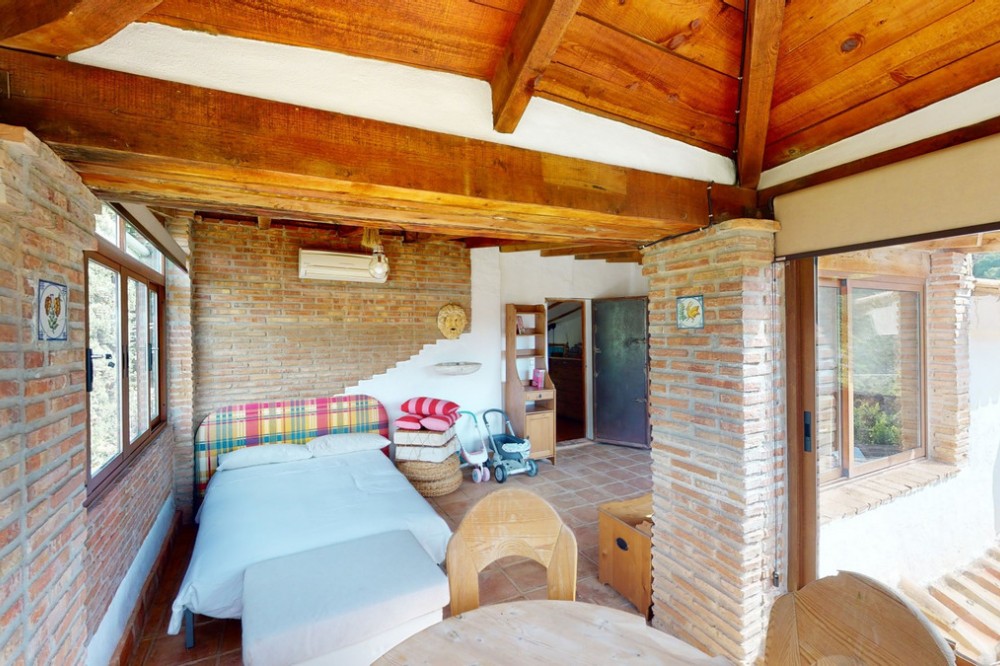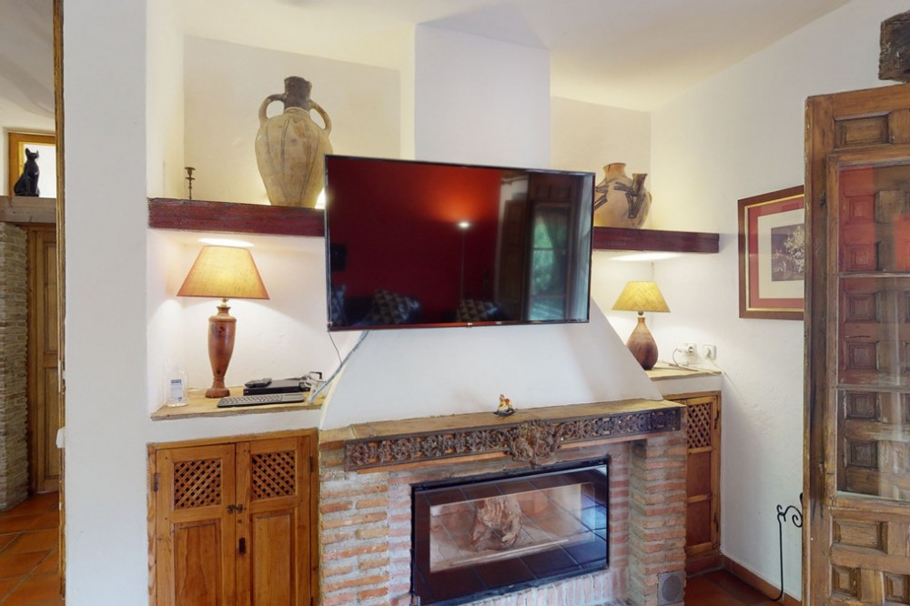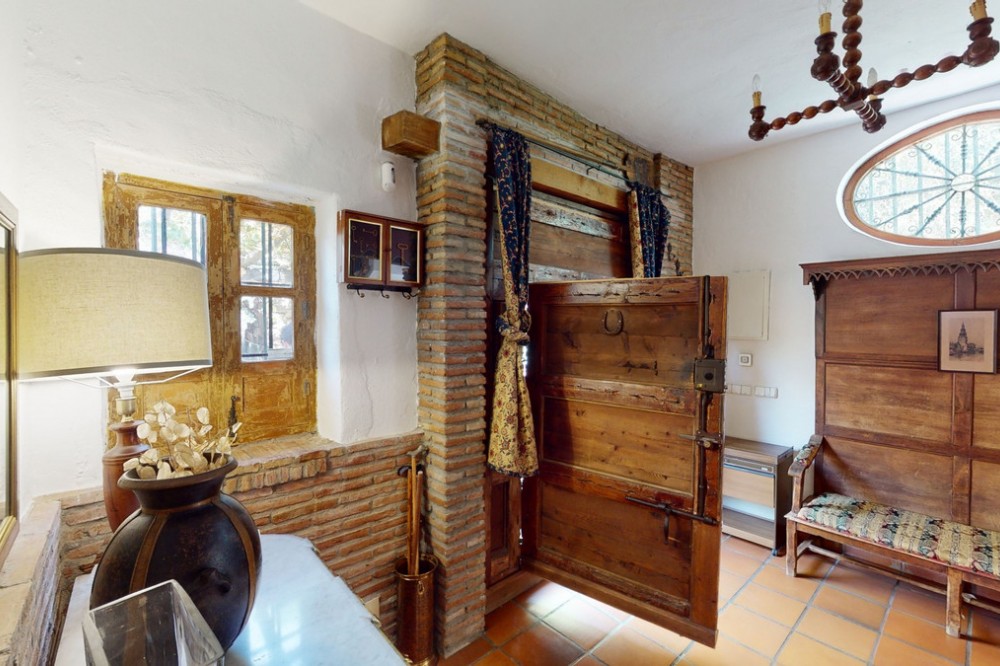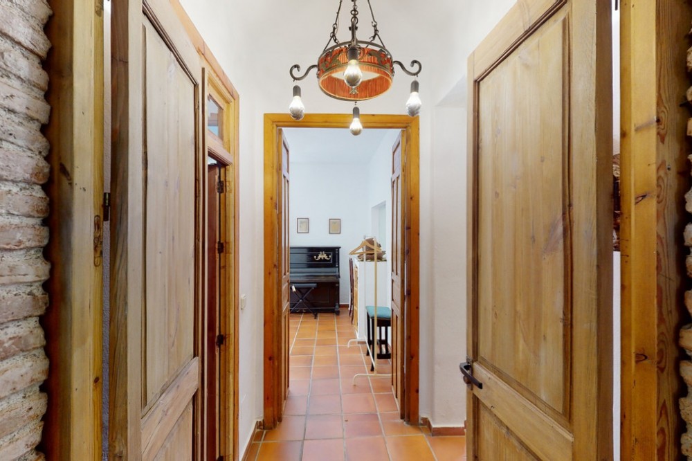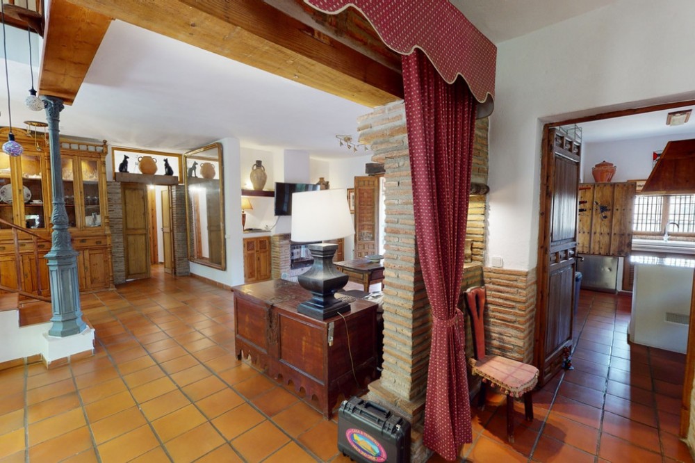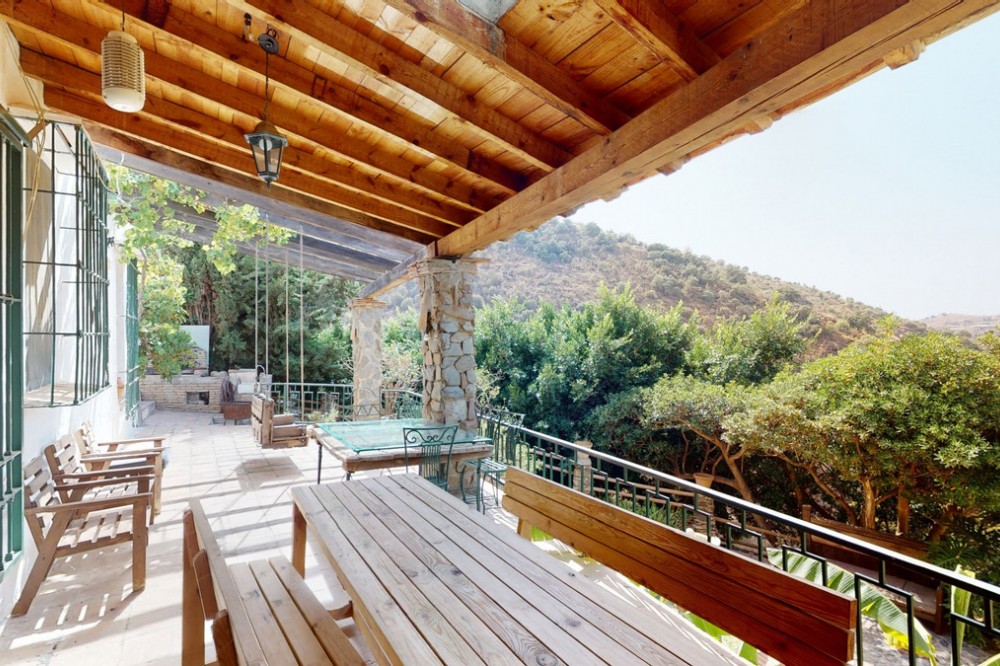 - A property with charm, soul and tradition, surrounded by nature on all four sides and with panoramic views to the southwest, the valley and the surrounding mountains. It consists of two floors. The current owner built it to his liking in 1996, with top quality materials and noble woods. The estate is accessed through an electric gate and there is space to park at least three vehicles at the entrance. In front of this area, we find several tree-lined paths, for relaxed strolls, and a 500-year-old marble fountain. Going down a ramp, with little slope, covered by a leafy vine and another fountain, we access a front patio. Here is the front door; a century-old solid wood door. Upon entering, to the right, is the kitchen, fully equipped and with access to the outside covered terrace. In front of the main door is the living-dining room, very spacious, bright and with a fireplace. From the living room there is also access to the covered terrace. After the living room we access the bedroom area on the ground floor, where we find two double bedrooms, a guest bedroom, and a bathroom. Going up the stairs to the second floor there are another three bedrooms -one with a conservatory overlooking the valley and the mountains-, a bathroom with a round hydromassage bathtub and a storage room. The outdoor area has lush gardens, a beautiful pool, barbecue area, a horse arena, and its boxes. We are pleased to be able to present this dream property to you soon, either personally or via virtual viewing. Because this world, it is unique - just like our Axarquía. In Andalusia. On the Costa del Sol. Here, on the sunny side of life...