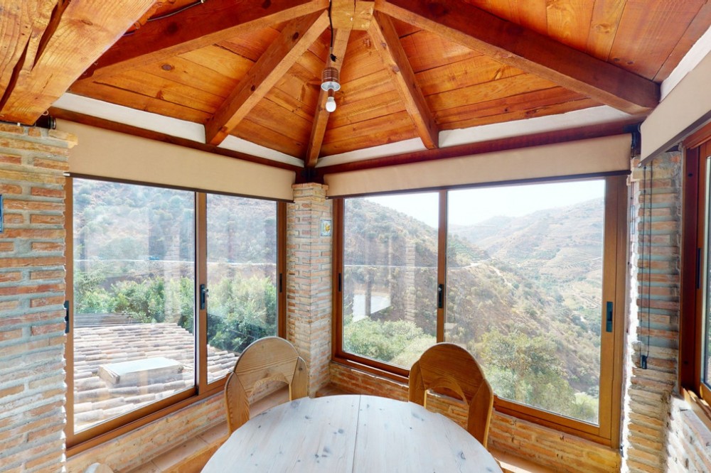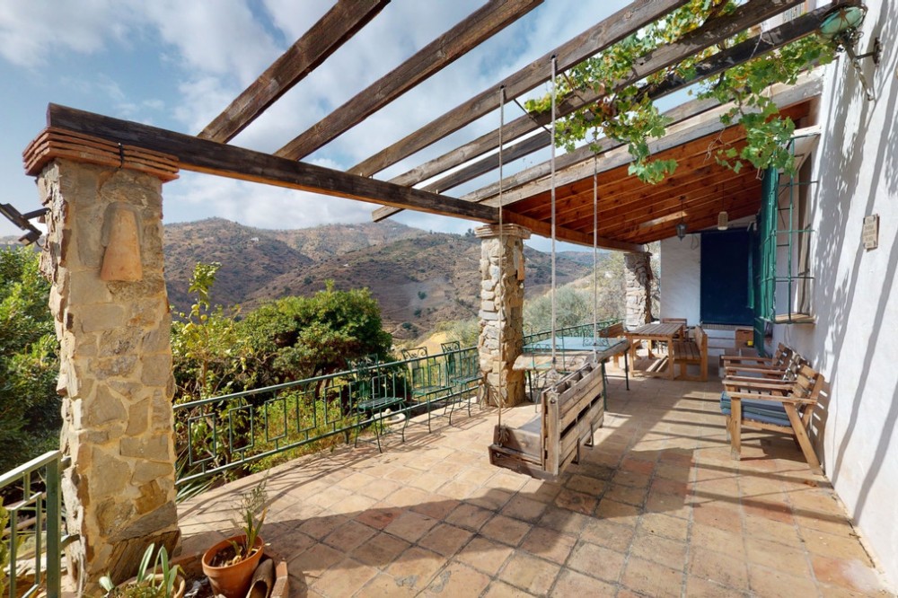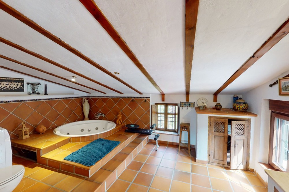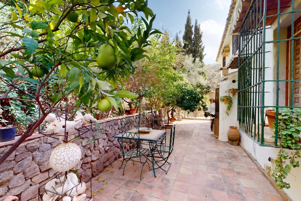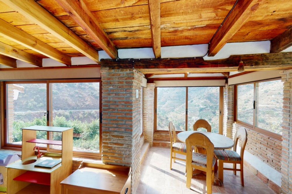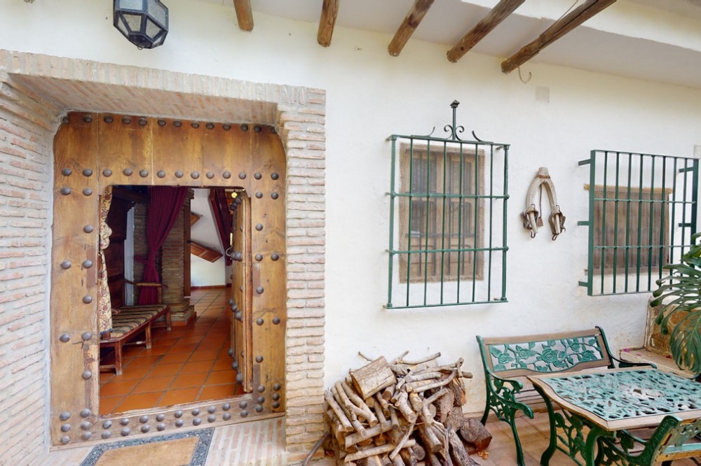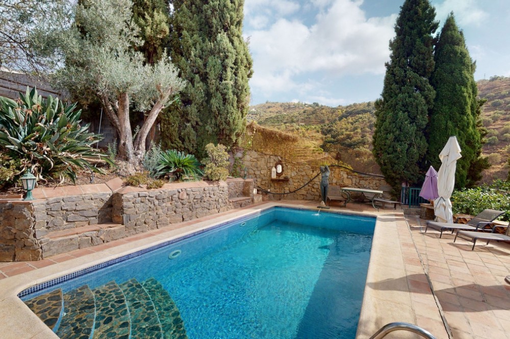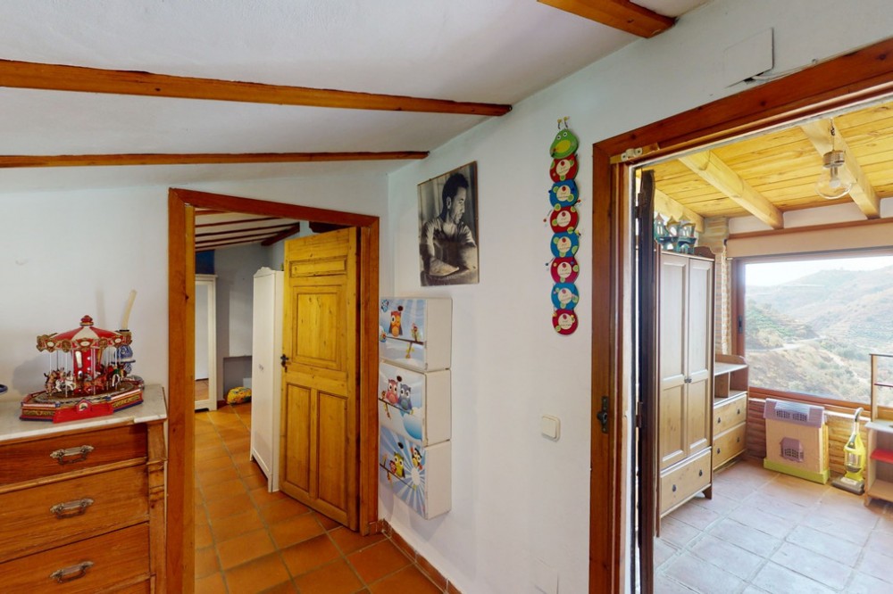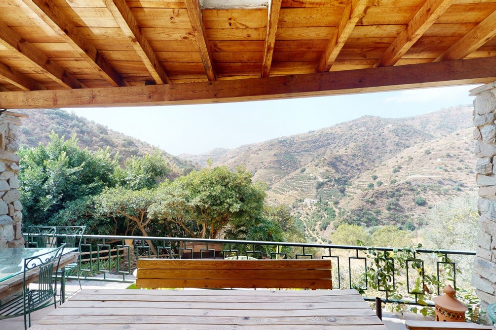 - A property with charm, soul and tradition, surrounded by nature on all four sides and with panoramic views to the southwest, the valley and the surrounding mountains. It consists of two floors. The current owner built it to his liking in 1996, with top quality materials and noble woods. The estate is accessed through an electric gate and there is space to park at least three vehicles at the entrance. In front of this area, we find several tree-lined paths, for relaxed strolls, and a 500-year-old marble fountain. Going down a ramp, with little slope, covered by a leafy vine and another fountain, we access a front patio. Here is the front door; a century-old solid wood door. Upon entering, to the right, is the kitchen, fully equipped and with access to the outside covered terrace. In front of the main door is the living-dining room, very spacious, bright and with a fireplace. From the living room there is also access to the covered terrace. After the living room we access the bedroom area on the ground floor, where we find two double bedrooms, a guest bedroom, and a bathroom. Going up the stairs to the second floor there are another three bedrooms -one with a conservatory overlooking the valley and the mountains-, a bathroom with a round hydromassage bathtub and a storage room. The outdoor area has lush gardens, a beautiful pool, barbecue area, a horse arena, and its boxes. We are pleased to be able to present this dream property to you soon, either personally or via virtual viewing. Because this world, it is unique - just like our Axarquía. In Andalusia. On the Costa del Sol. Here, on the sunny side of life...