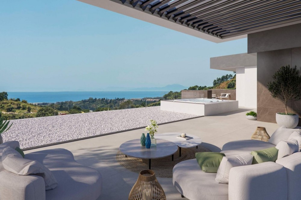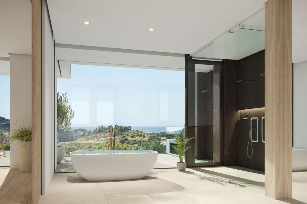 - Marbella club golf – Villa Alegria: Exceptional new build villa with excellent mountain and sea views. In one of the most exclusive areas of Marbella, Marbella club golf, we are developing this beautiful villa amidst the greenery. Sea views, golf views over the Marbella club golf and lush nature characterize this plot of more than 6.000m2! This 24h high-level security domain, features purely exclusive villas a horse riding center, charming clubhouse and an 18-hole golf course with many natural undulations. This renowned 18 hole golf club has been around for over 70 years and is known as one of the best clubs in Spain. Marbella Club brings its people together in the clubhouse, where the excellent menu attracts many club members and residents every day. In short, this cozy atmosphere makes you feel right at home. The architect with years of experience in this region, designed a masterpiece that feels practical and homely at the same time. The oasis of green is drawn in as the large floor tiles extend from inside to outside, and even into the 75m2 pool! This way, one creates a natural place of tranquility. The villa includes 776m2 of indoor area and 357m2 of terraces, distributed over 3 floors, each with their own individuality! Below are the bodega, exclusive garage for 5 cars, technical rooms, gym and 3 suites each with dressing room and bathroom. From each room and the gym you can enjoy the view into the beautiful nature that we intentionally leave untouched. Deer walk through the 5000m2 wooded area which you can see from this floor on a regular basis. Above we have the entrance hall with wardrobe, guest toilet, living space, dining-area, kitchen and 2nd kitchen. From each of these rooms one has a view over the crests of the forest to the sea, the golf and the beautiful mountain scenery. Because of its south orientation the villa with adjoining pool also enjoys the Mediterranean sun all day. This part of the house includes 202m2 of interior space and 160m2 of terraces, as well as a 75m2 swimming pool, which overflows to three sides and where the water level is equal to the terraces. Lastly, the upper level consists of the Master bed- & bathroom, with an indoor area of 84m2 and adjoining 127m2 terraces. From these terraces you can enjoy your built-in Jacuzzi, semi-covered chill-out area through a built-in bioclimatic pergola. On each floor, the glass windows are TRUE ‘floor-to-ceiling’ with minimalist aluminum partitions so that you maintain maximum integration between inside and outside, even with closed panels. In recent years Marbella is known for its modern, white ‘blocky’ villas, which we want to stay away from as much as possible with this design, by providing the design with natural elements that in this way ‘blend’ with the natural environment around it. Especially since the villa is partly ‘pushed’ into the mountainside, integration with nature is extremely important. Of course, this gem is being built by one of the most reputable contractors in Marbella, so the construction quality is absolutely guaranteed! Located in the green area of Benahavís, but just far enough from the hustle and bustle, this is also your ideal zen location, where everything is still very accessible. 15km from Puerto Banús, 4km from Cancelada (the nearest village) and 13km from Estepona. Contact us for more info!