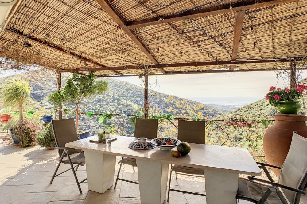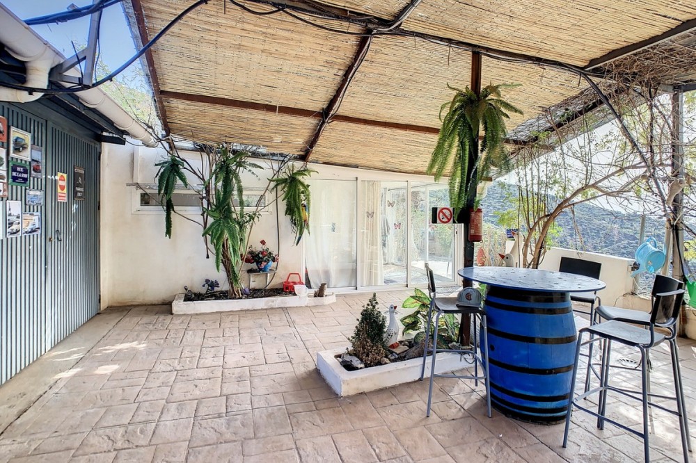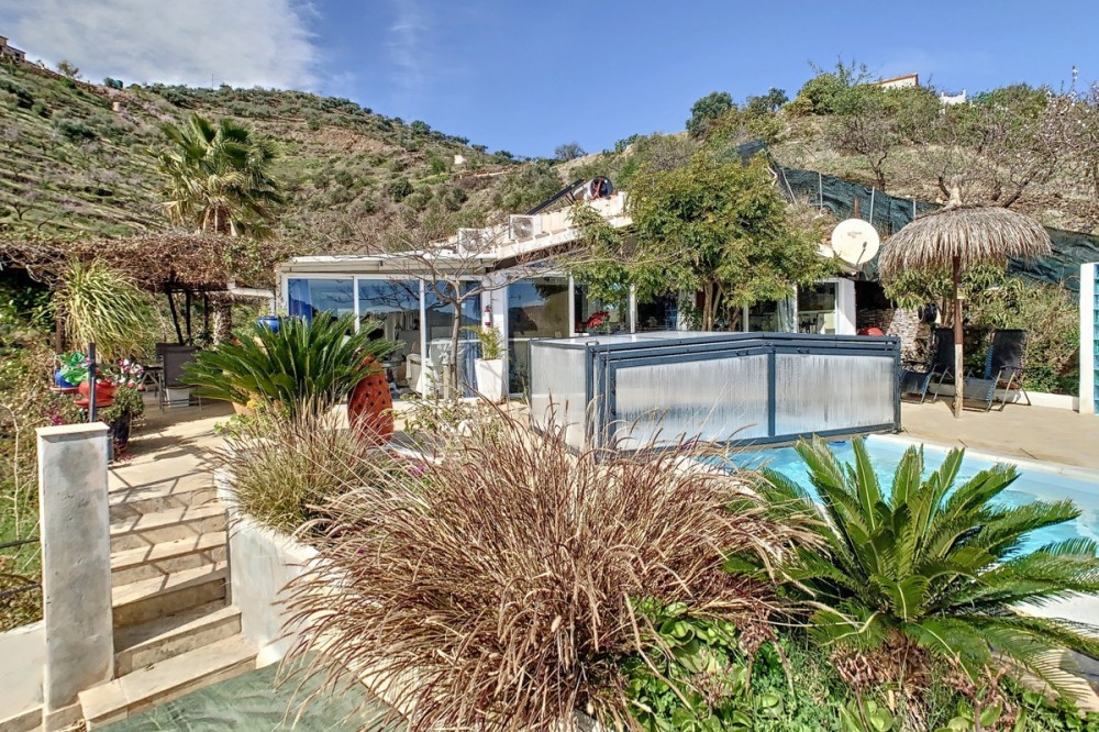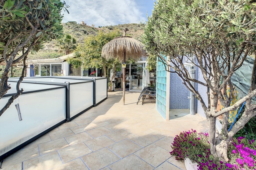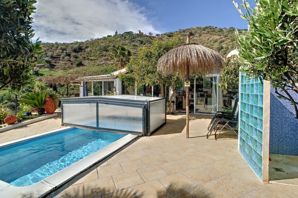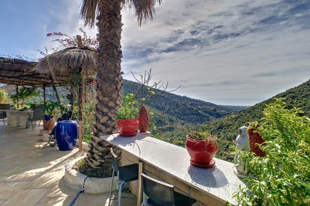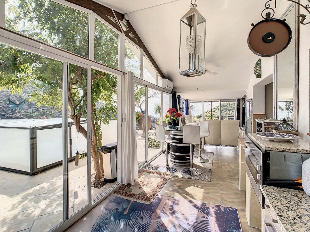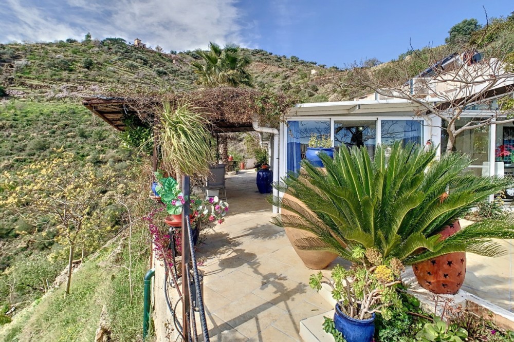 - You are looking for a large villa with a heated swimming pool, neatly hidden nearly at the top of a mountain, surrounded by nature with breath-taking views of the valley up to the sea and the village of Arenas? This might just be what you are looking for. At the entry of the property, you find a covered parking space for at least 6 cars and a workshop. From there you step onto a wide porch that surrounds the whole property. In the centre of the house, that ́s all on one level, you find an office, 3 bedrooms, 2 bathrooms (one on-suite), 2 kitchens, an open bbq space, a large sitting/dining room and more sitting areas with views to the outside through French doors. Around the porch there is an array of different privative sitting/sunbathing spaces where it is just a dream to be. Here you also find the heated swimming pool, palm trees, an exterior bedroom and a passage leading to little romantic benches with fantastic views all around the foot of the property. There is also an outdoor kitchen. This property is well finished and comes with all the amenities. It is perfect for people that are fond of comfort and privacy. We are pleased to be able to present this dream property to you soon, either personally or via virtual viewing. Because this world, it is unique - just like our Axarquía. In Andalusia. On the Costa del Sol. Here, on the sunny side of life...