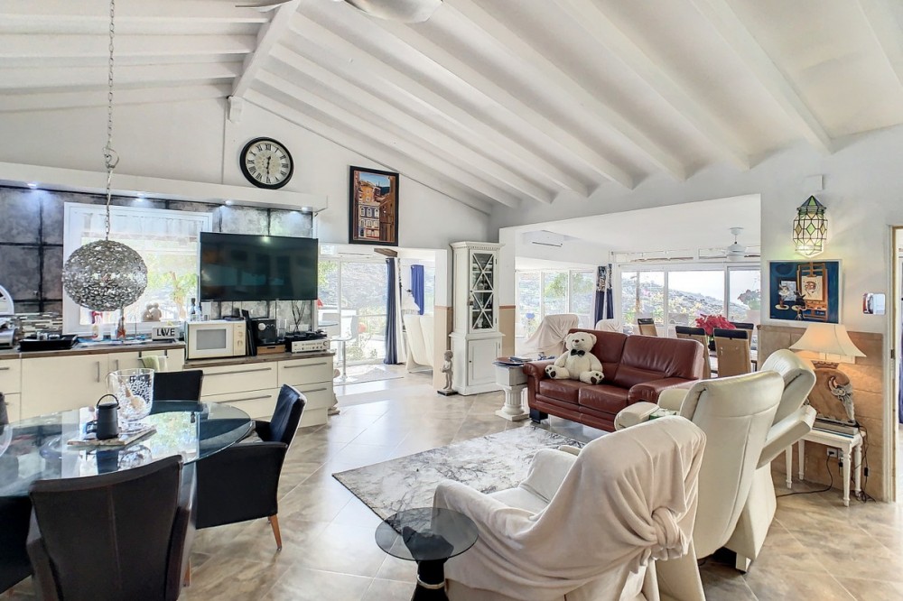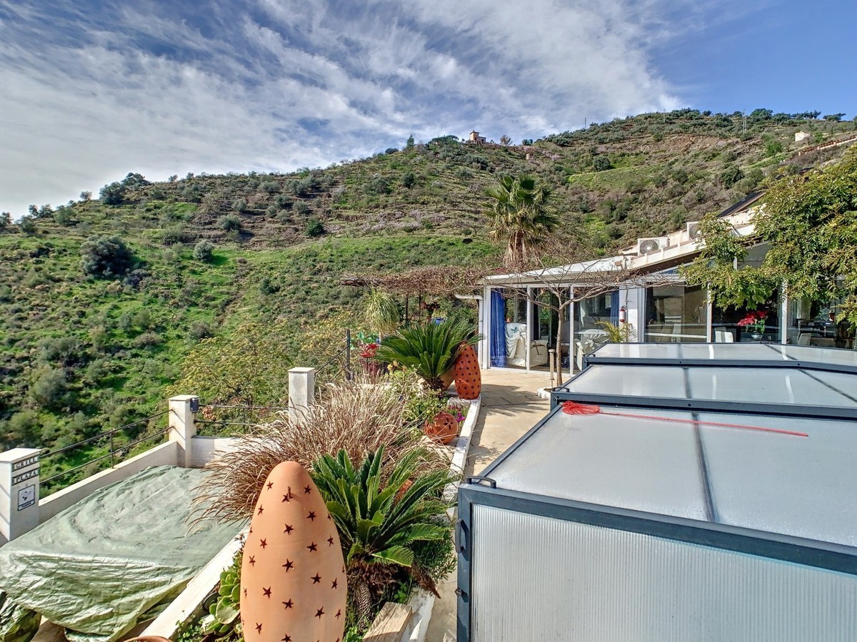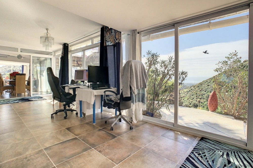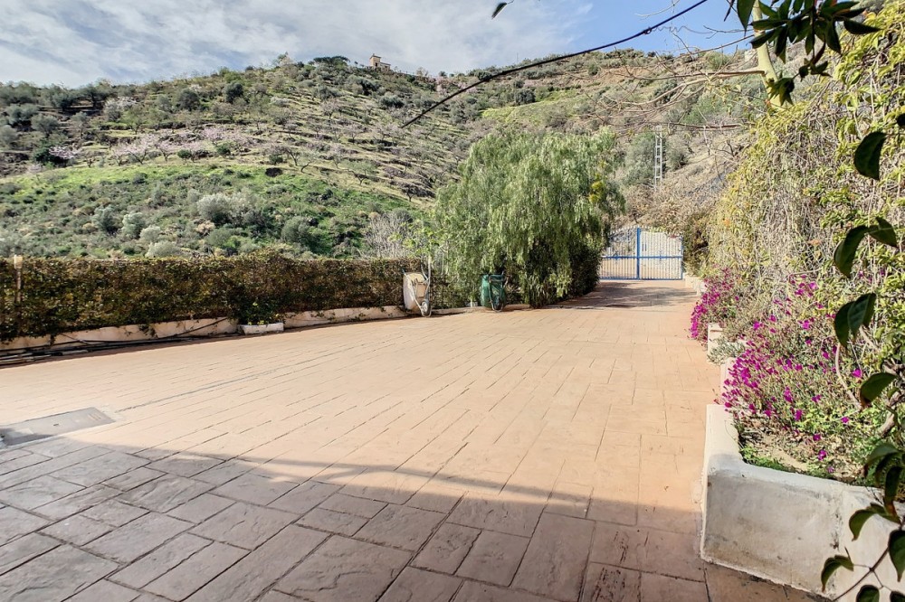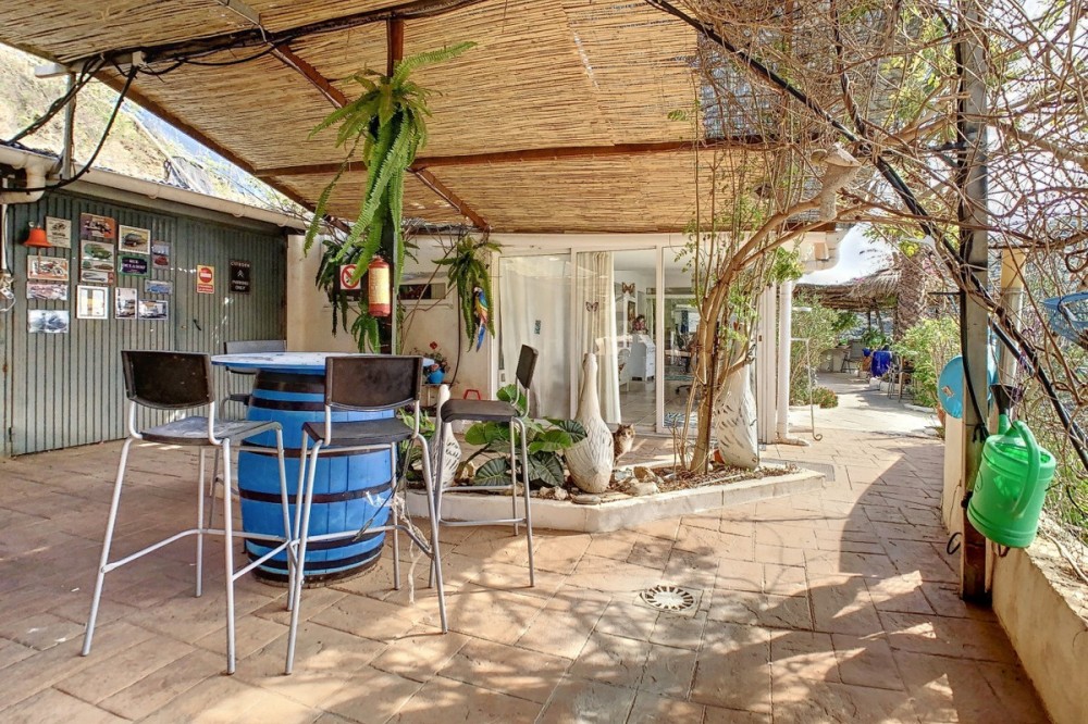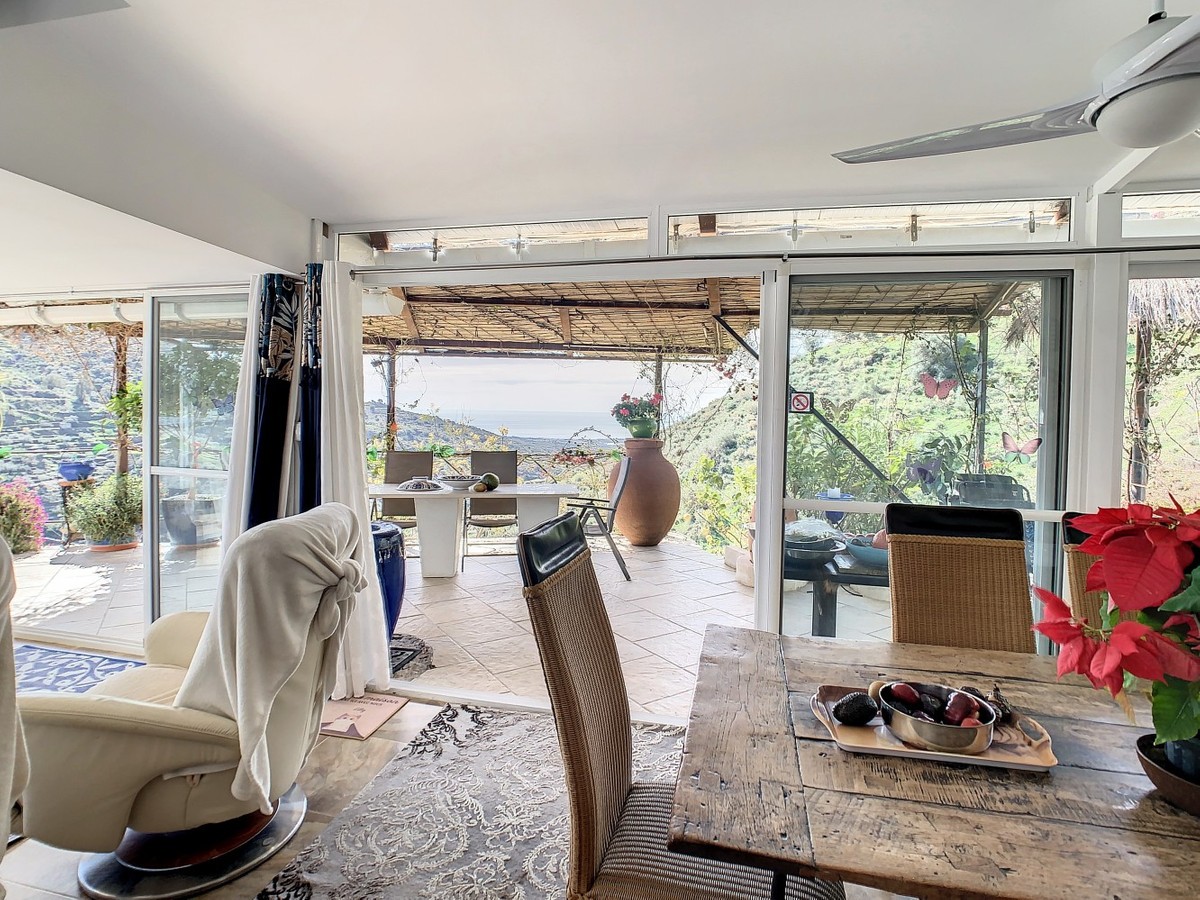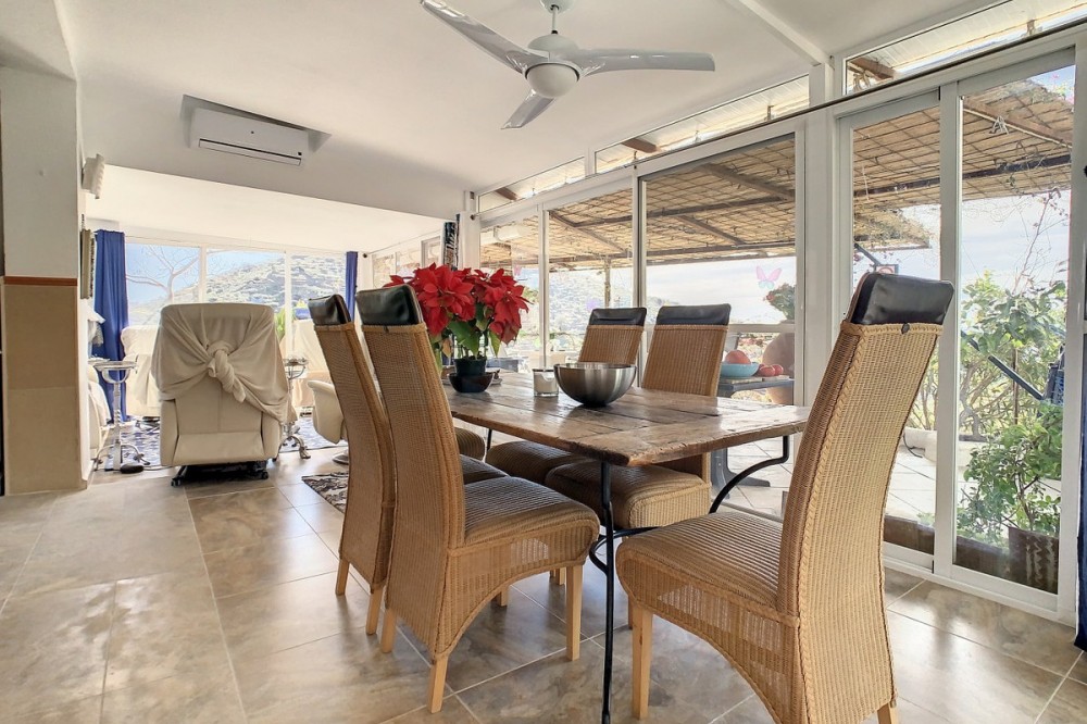 - You are looking for a large villa with a heated swimming pool, neatly hidden nearly at the top of a mountain, surrounded by nature with breath-taking views of the valley up to the sea and the village of Arenas? This might just be what you are looking for. At the entry of the property, you find a covered parking space for at least 6 cars and a workshop. From there you step onto a wide porch that surrounds the whole property. In the centre of the house, that ́s all on one level, you find an office, 3 bedrooms, 2 bathrooms (one on-suite), 2 kitchens, an open bbq space, a large sitting/dining room and more sitting areas with views to the outside through French doors. Around the porch there is an array of different privative sitting/sunbathing spaces where it is just a dream to be. Here you also find the heated swimming pool, palm trees, an exterior bedroom and a passage leading to little romantic benches with fantastic views all around the foot of the property. There is also an outdoor kitchen. This property is well finished and comes with all the amenities. It is perfect for people that are fond of comfort and privacy. We are pleased to be able to present this dream property to you soon, either personally or via virtual viewing. Because this world, it is unique - just like our Axarquía. In Andalusia. On the Costa del Sol. Here, on the sunny side of life...