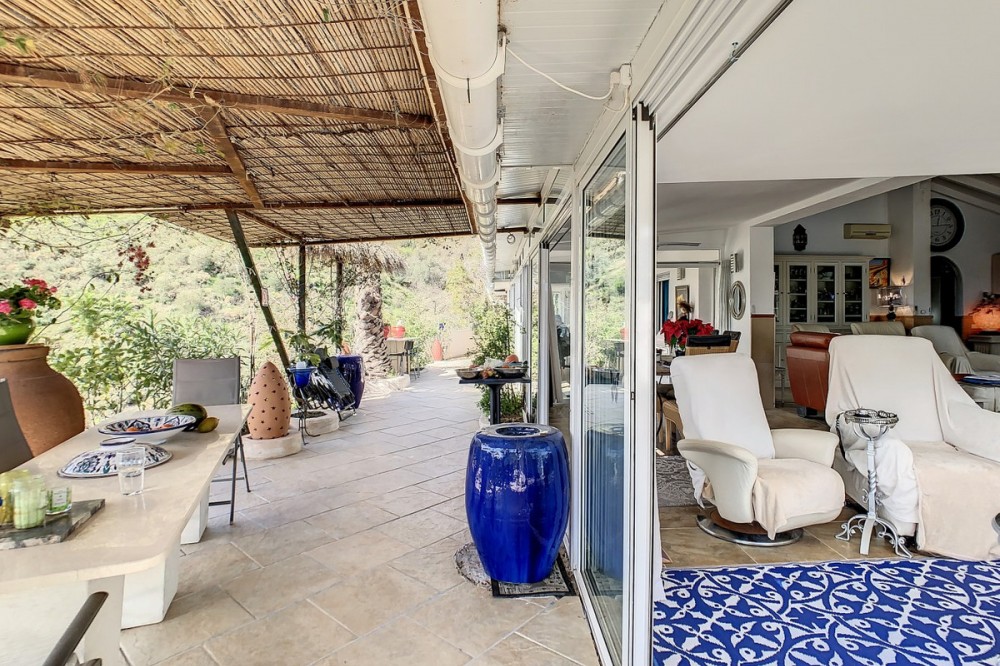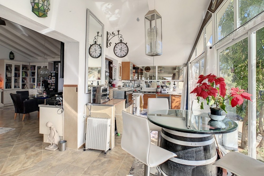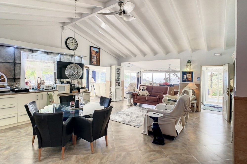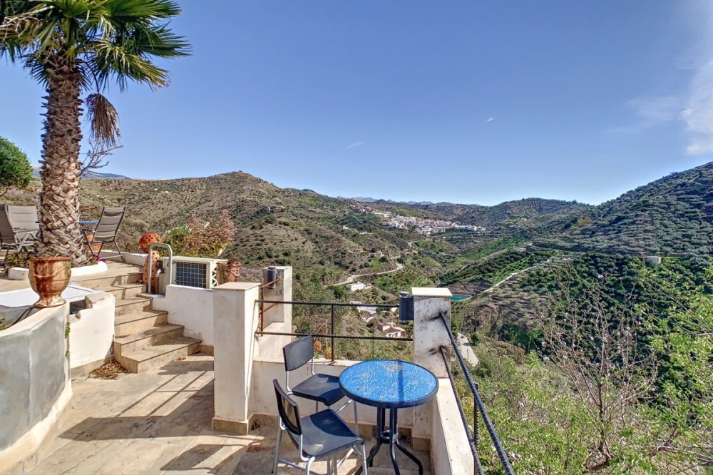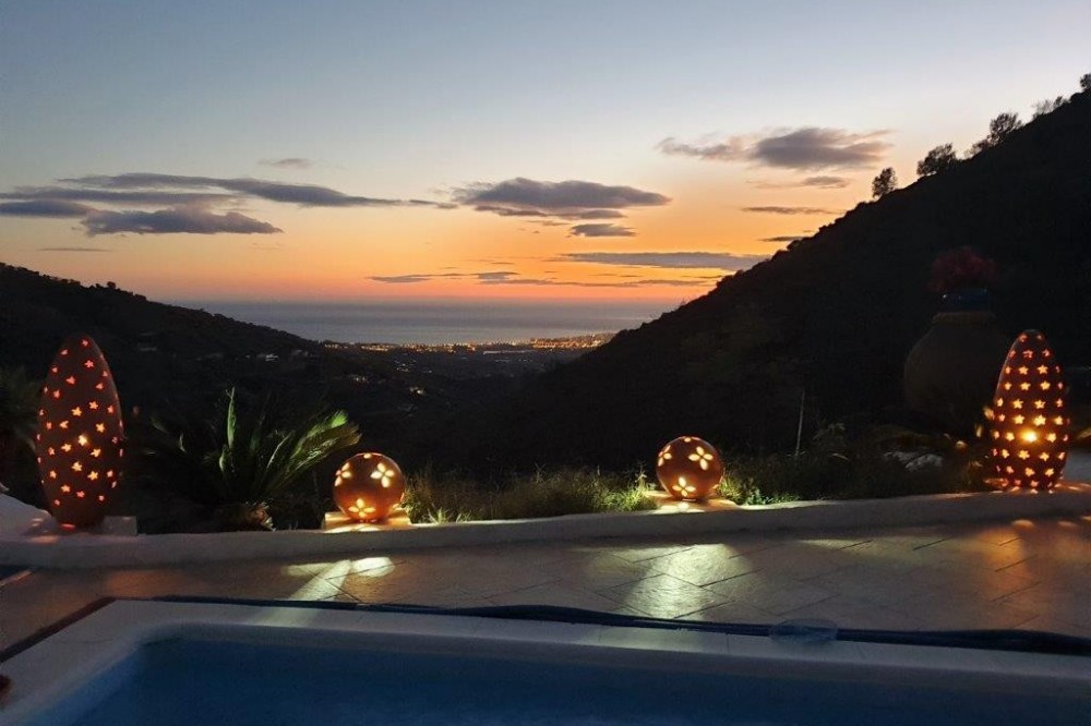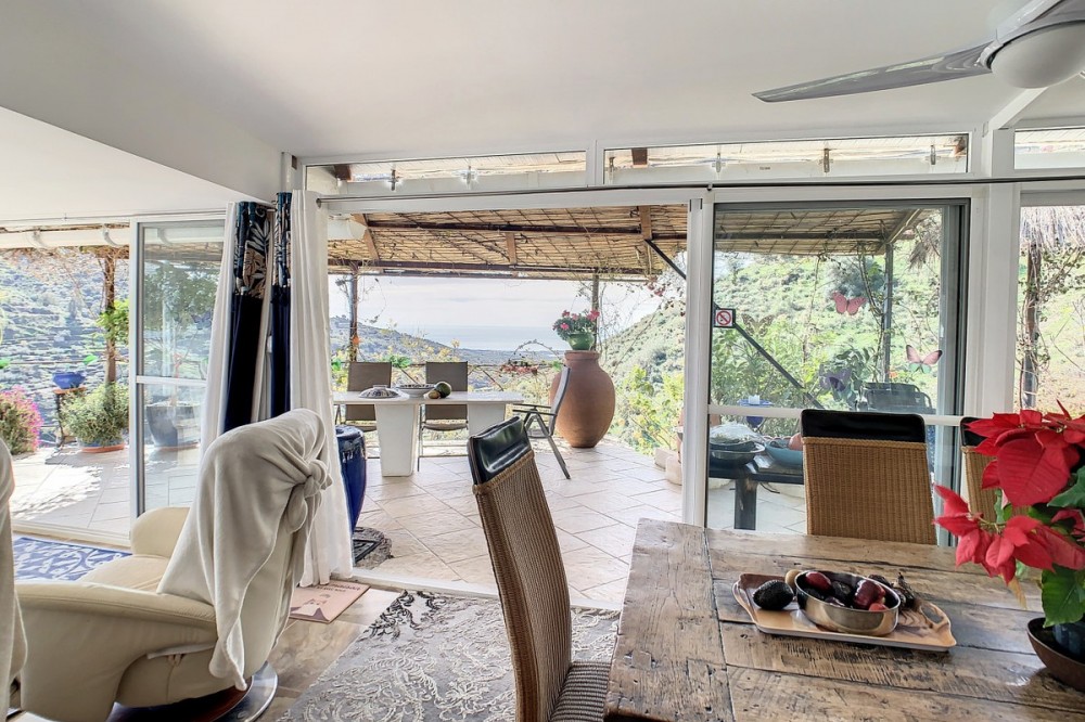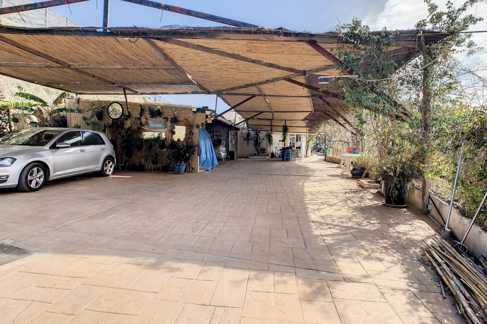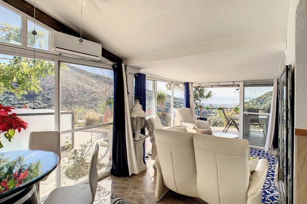 - You are looking for a large villa with a heated swimming pool, neatly hidden nearly at the top of a mountain, surrounded by nature with breath-taking views of the valley up to the sea and the village of Arenas? This might just be what you are looking for. At the entry of the property, you find a covered parking space for at least 6 cars and a workshop. From there you step onto a wide porch that surrounds the whole property. In the centre of the house, that ́s all on one level, you find an office, 3 bedrooms, 2 bathrooms (one on-suite), 2 kitchens, an open bbq space, a large sitting/dining room and more sitting areas with views to the outside through French doors. Around the porch there is an array of different privative sitting/sunbathing spaces where it is just a dream to be. Here you also find the heated swimming pool, palm trees, an exterior bedroom and a passage leading to little romantic benches with fantastic views all around the foot of the property. There is also an outdoor kitchen. This property is well finished and comes with all the amenities. It is perfect for people that are fond of comfort and privacy. We are pleased to be able to present this dream property to you soon, either personally or via virtual viewing. Because this world, it is unique - just like our Axarquía. In Andalusia. On the Costa del Sol. Here, on the sunny side of life...