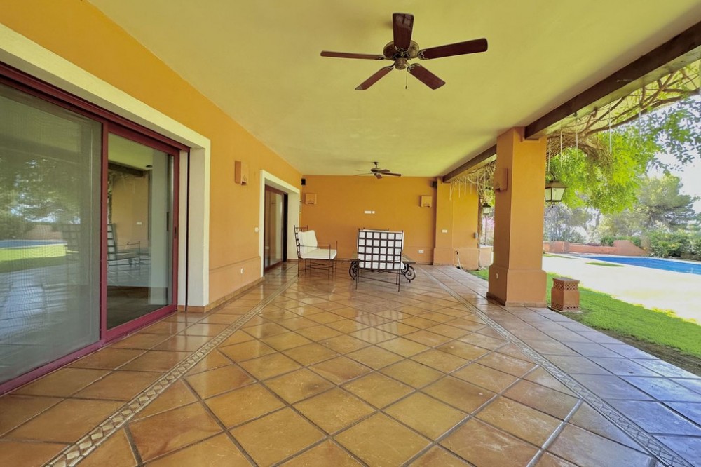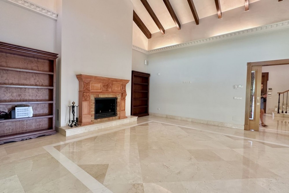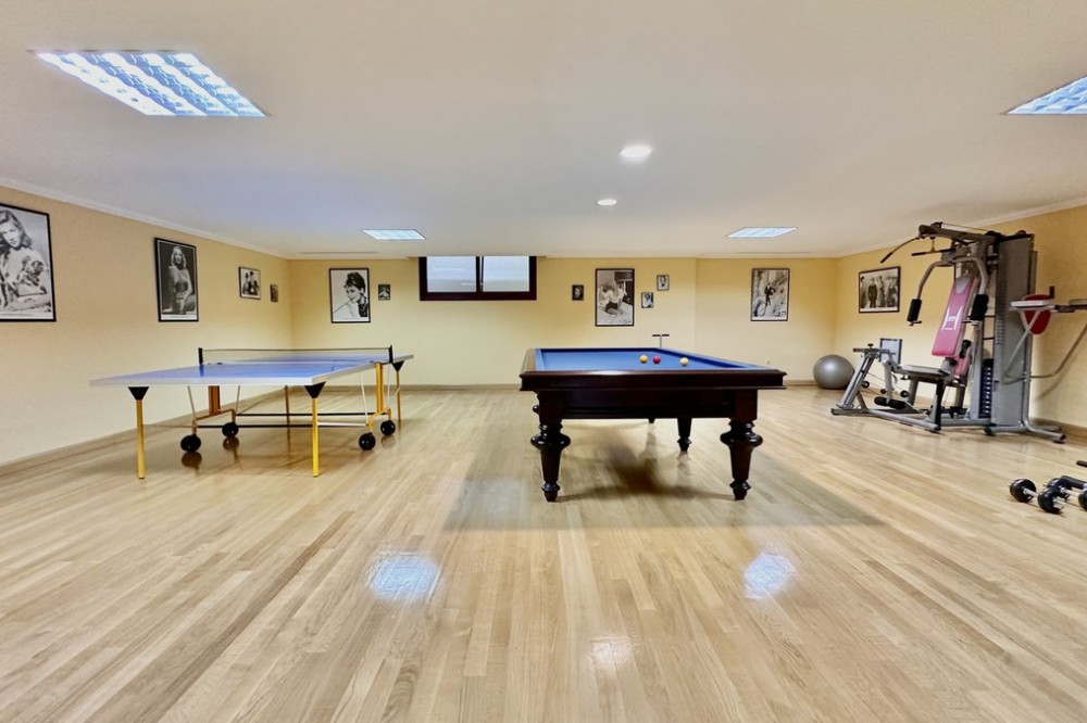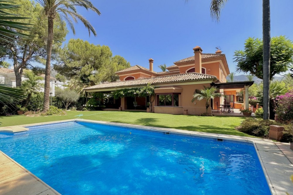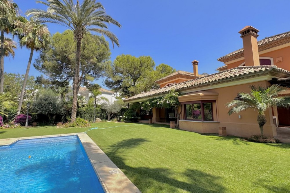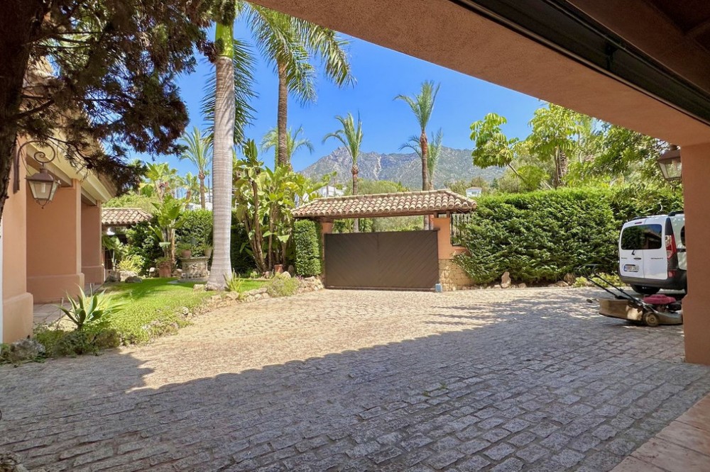 - This villa is located in the prestigious and secure community of Golden Mile Marbella. with 24h security, manicured gardens, paddle courts and children’s play area, within short distance to all aminities of Marbella and the beach. Very private property settled on a flat plot of almost 1500m2 with madure garden and good size swimming pool. The house offers comfotable entrance that leads to the covered garage for 2 cars plas carpor for another two. The villa is distribuited on 3 levels, on the ground floor there are, a spacious living room with the access to the cover large terrace and a garden that also leads to TV room, a guest toilet, a kitchen with utility room and pantry, a goos size master bedroom en suite. The upper floor consists of 4 bedrooms, 3 with their bathrooms, 2 bedrooms are with the access to the terrace. The Basement offers a living room with the cellar, another additional space to that could be addapted to personal tast, a toilet, billard room , a storage room, there is an access to the garden and BBQ area.