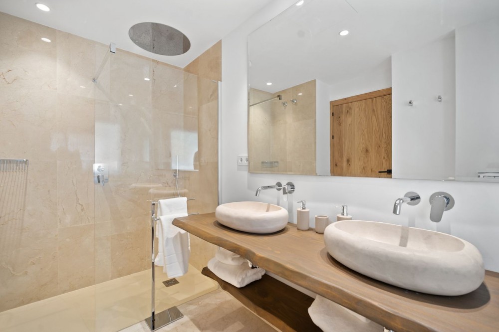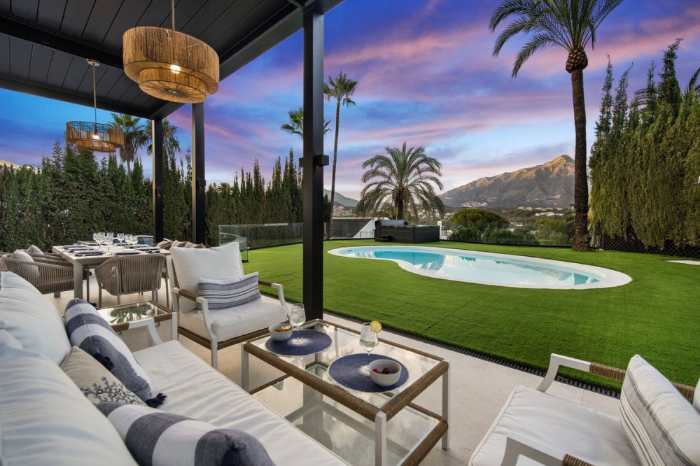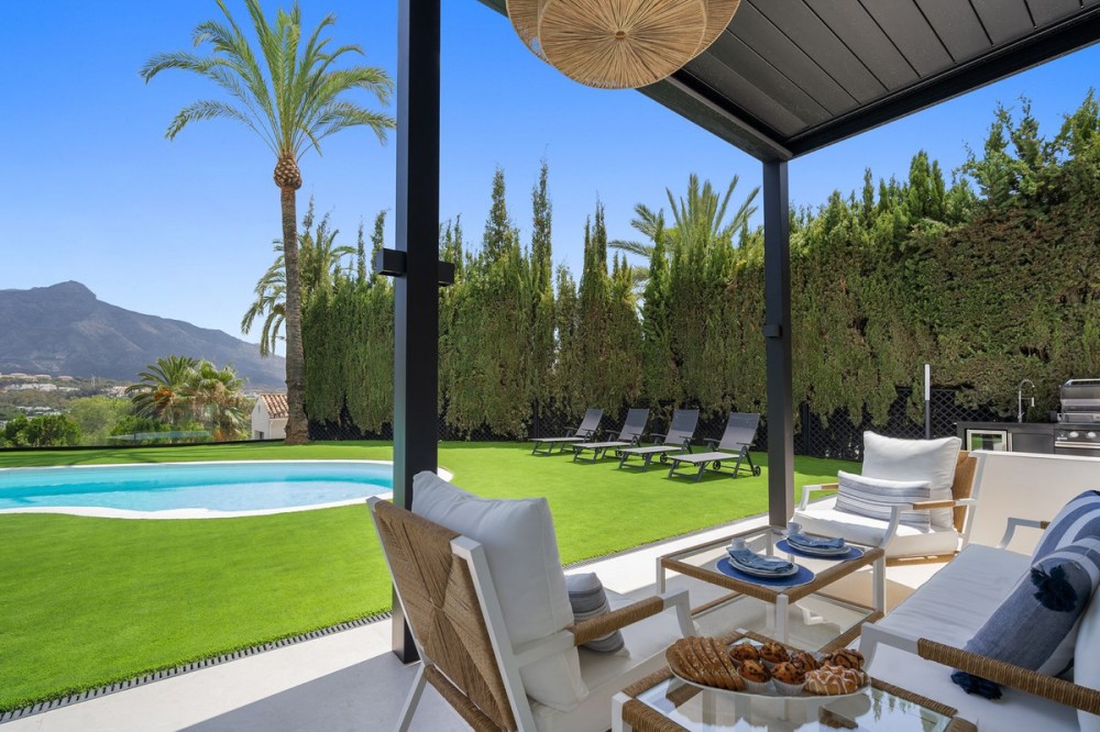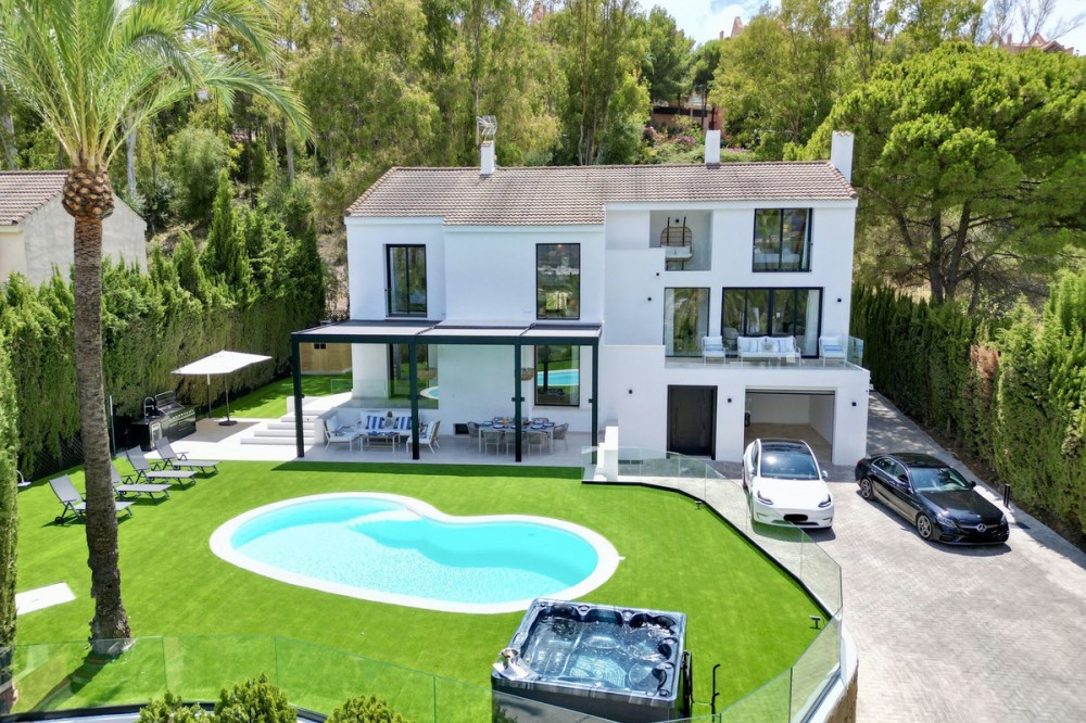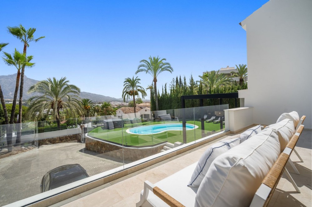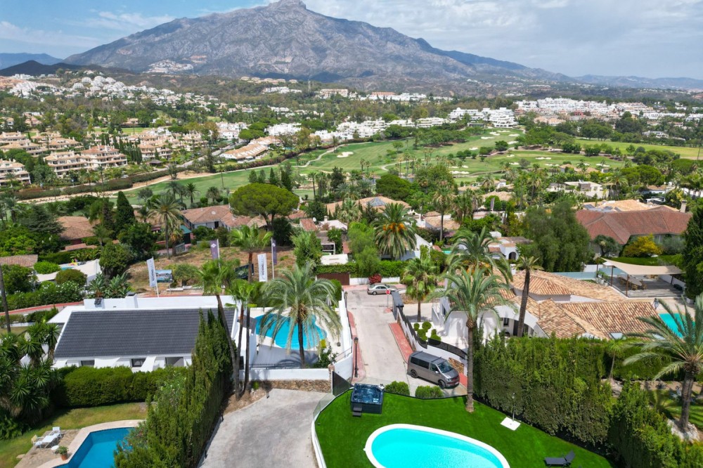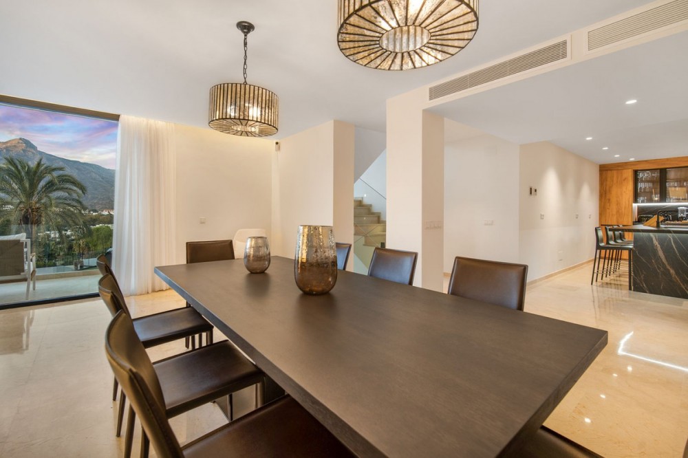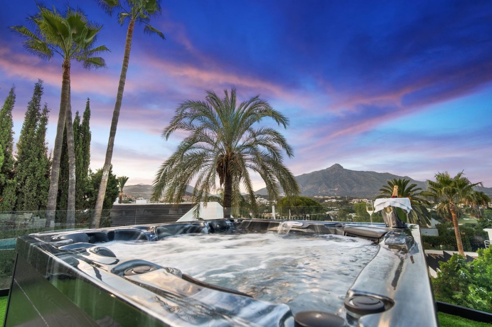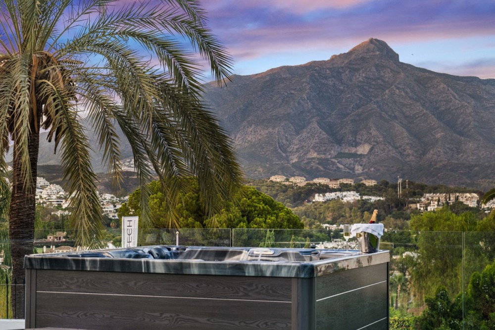 - Spectacular new villa in Nueva Andalucia New on the market 2023 stunning villa offers the following layout : 5 bedrooms / en-suite 5 bathrooms, 2 extra bathrooms, living room with extended open plan kitchen. Access to a south facing covered terrace. Distributed on three levels, it comprises, on the main floor: spacious living room with several seating areas; open-plan fully fitted kitchen/dining area equipped with top appliances and with a central island and wine cooler; en-suite guest bedroom; access to the porches, terraces, swimming pool and the carefully landscaped garden with jacuzzi. Upstairs: two guest en-suite bedrooms with fabulous views over La Concha, stunning master suite with dressing room and a terrace also enjoying the amazing views. Lower level: cinema, further guest bedroom with en-suite bathroom; garage for 1 car. Possibility to add a gym on this level. Special features include underfloor heating in the bathrooms and home automation system throughout. Just minutes away from several international schools, world class golf courses, gastronomic experiences and amenities, this magnificent home is set within a quiet gated complex with 24-hour security, guaranteeing a total privacy. The main house has been recently refurbished to the latest standards including central heating and double glazed windows.