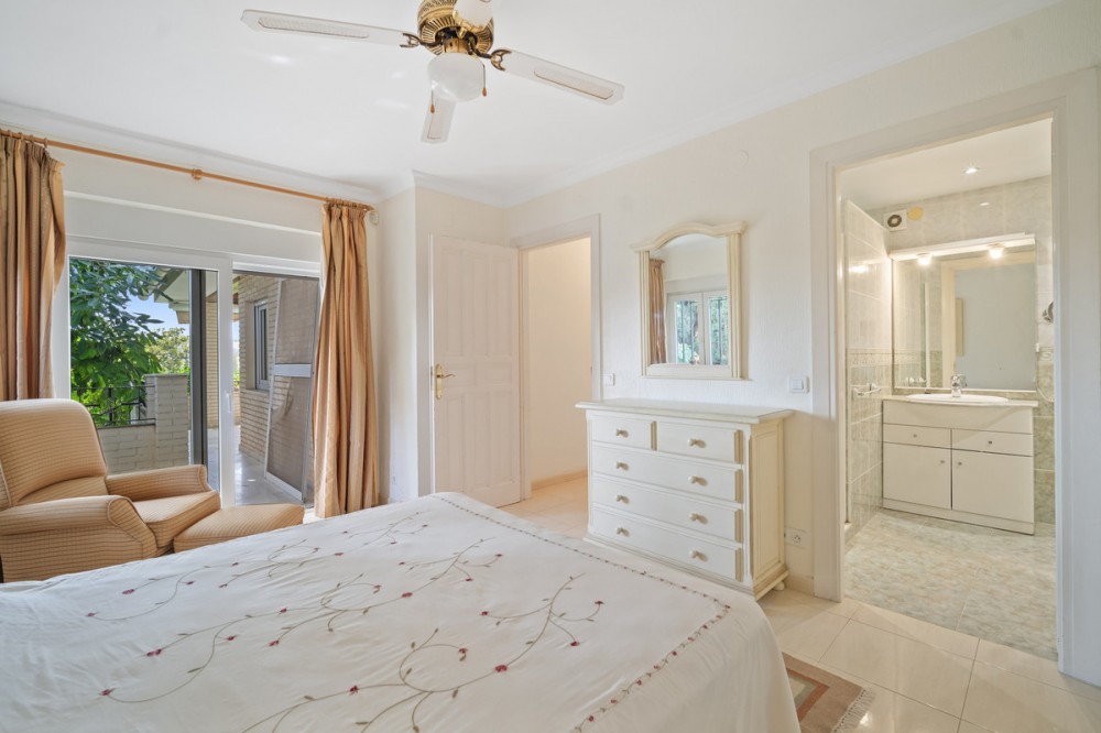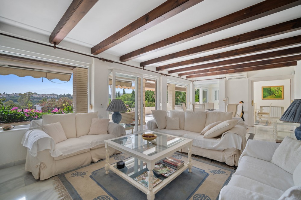 - This villa is nestled in an elevated position within the urbanisation of Guadalmina Alta, a beautiful and well-established urbanisation known for its quality living. This villa boasts stunning panoramic views due to its well-designed elevated position on a sizeable plot. The entrance to the house is graced by a picturesque patio, adding to its charm. On the main floor, you will find a beamed, generously-sized living room with cozy fireplace and a dining room offering access to a delightful terrace. Additionally, this floor accommodates two bedrooms, a bathroom and guest toilet. Descending to the garden level, you will discover two more good-sized bedrooms, each complete with its own en suite bathroom. These charming bedrooms open up to a lovely porch, and inviting pool and an expansive garden, making it a perfect space for quiet relaxation and outdoor enjoyment!