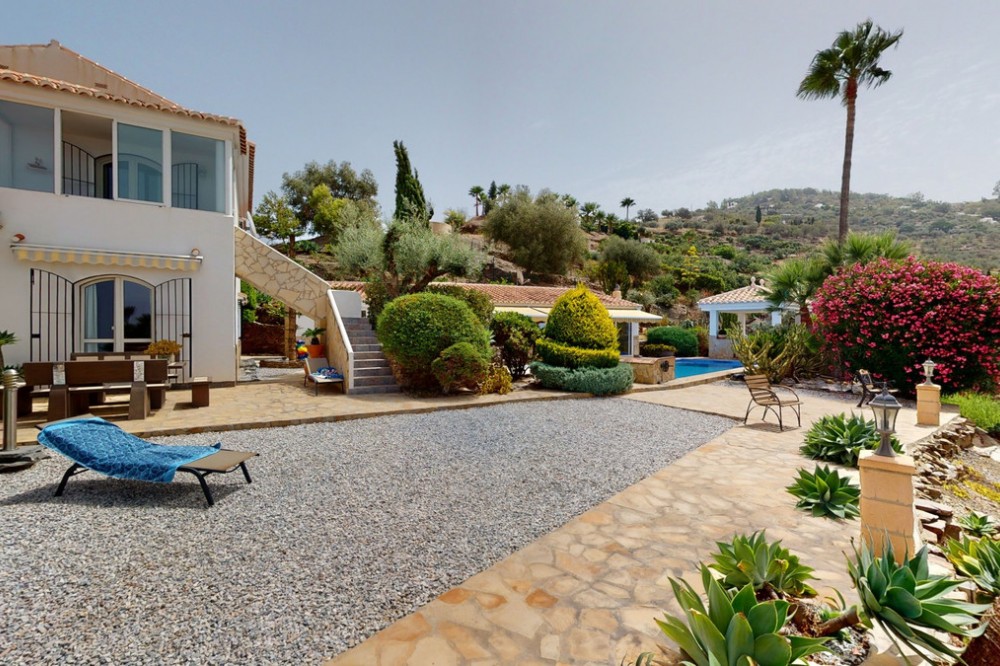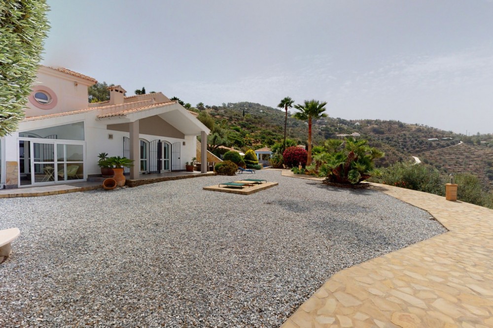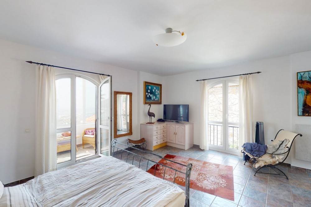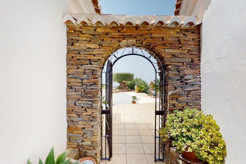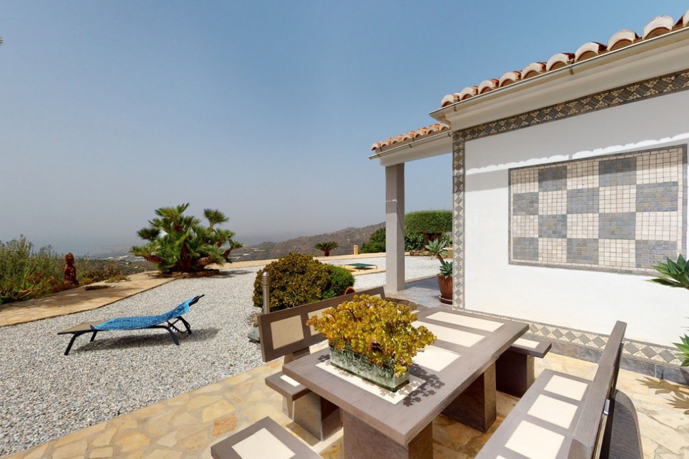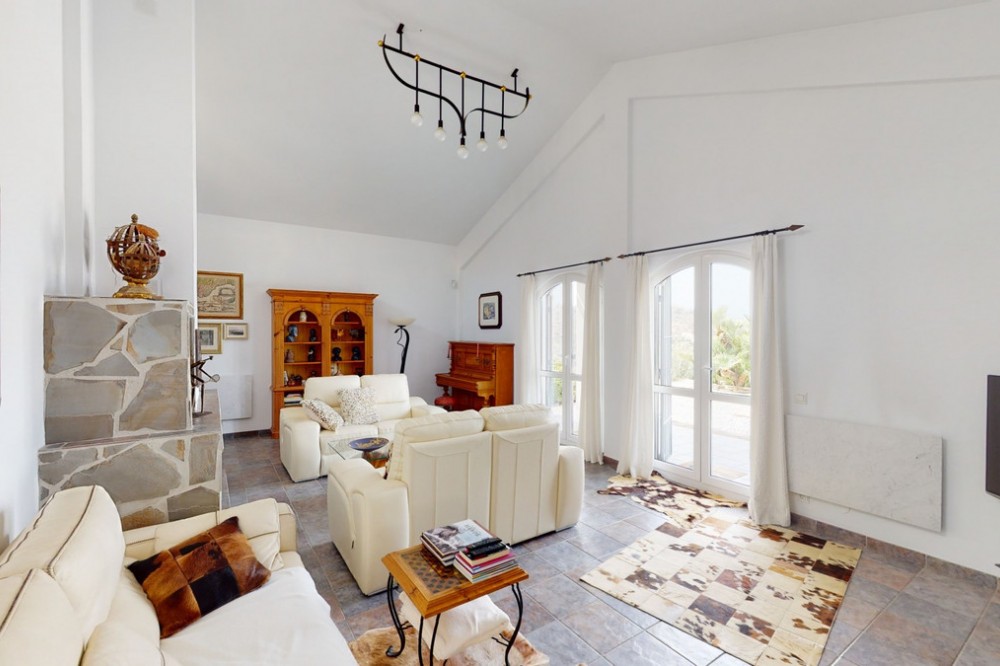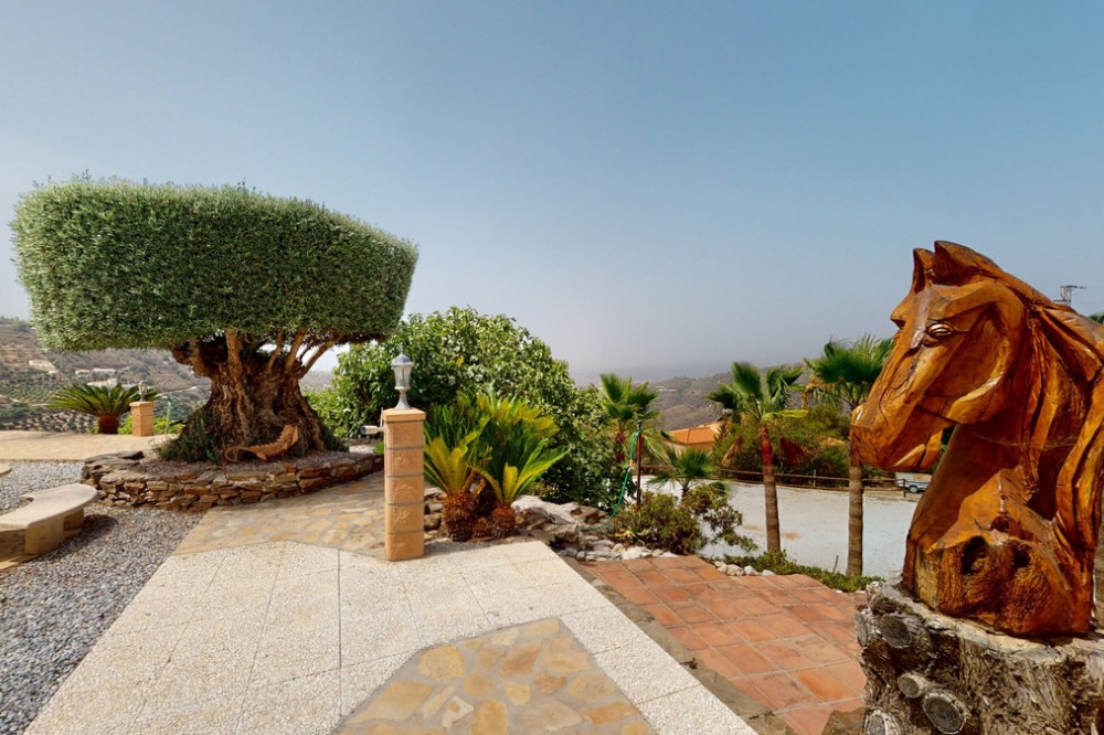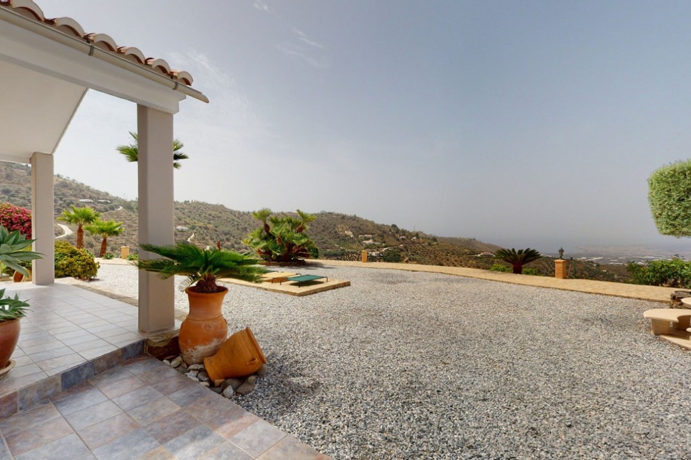 - If it ́s your dream to live in a fantastic, high quality built villa with a pool and breathtaking sea views, then you have found the right property. This 280 m2 luxury villa offers everything you could possibly want. In the centre of the modern villa mixed with Andalusian style is a charming patio, which gives the house a special accent and provides beautiful lighting and atmosphere. It links the entire lower area of the property. From the entrance area, one side leads to a room used as an office, as well as a bedroom with an on-suite bathroom and the spacious living room with a fireplace and sea views. This in turn is adjacent to the dining area and the kitchen, from which you enter the hallway that is connected to the entrance area. This hallway also leads to the dressing room with an on-suite bathroom, where there is a sauna. Stairs lead from the entrance to the second floor. Here you will find the large master bedroom with an on-suite bathroom and a winter garden. External stairs lead to the outdoor area, which gives this room a separate entrance. The wonderful outdoor area offers a double garage, as well as a laundry room, which is also used for storage. Right next to the inviting pool is a gym with bathroom, as well as a glass fronted annex that serves as a lounge area with an outdoor kitchen. The perfect place for celebrations and dinners with family and friends. On the 19,500 m2 property there is also a paddock, with shelter and its own driveway, for keeping horses. It ́s located below the house. The driveway also leads to a small riding arena with three horse stalls, a tack room and a shower for the horses. You have free design possibilities of the spacious property. Whether it is to plant a fruit and vegetable garden, expand the area of horse keeping, possibly convert the riding arena to a tennis court, volleyball or small soccer field, even something completely new. The choice is entirely up to you. We are pleased to be able to present this dream property to you soon, either personally or via virtual viewing. Because this world is unique - just like our Axarquía. In Andalusia. On the Costa del Sol. Here, on the sunny side of life...