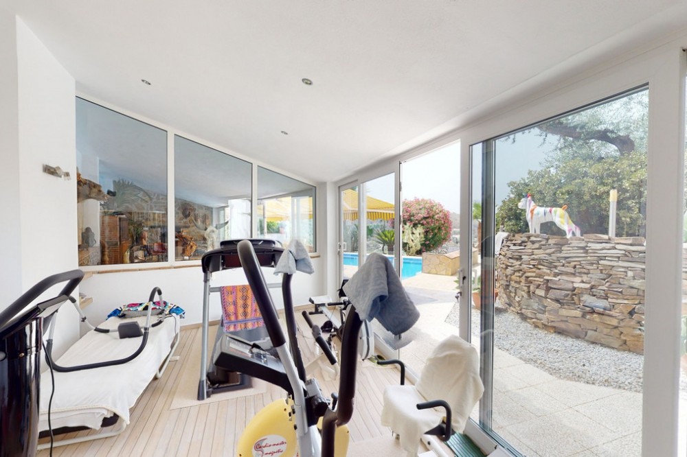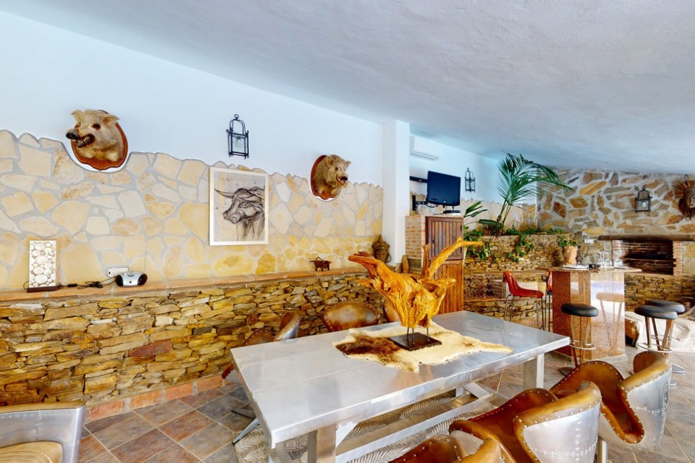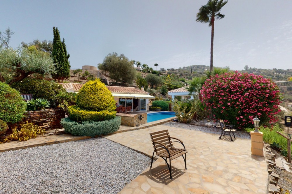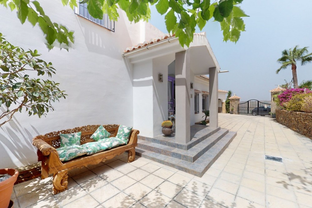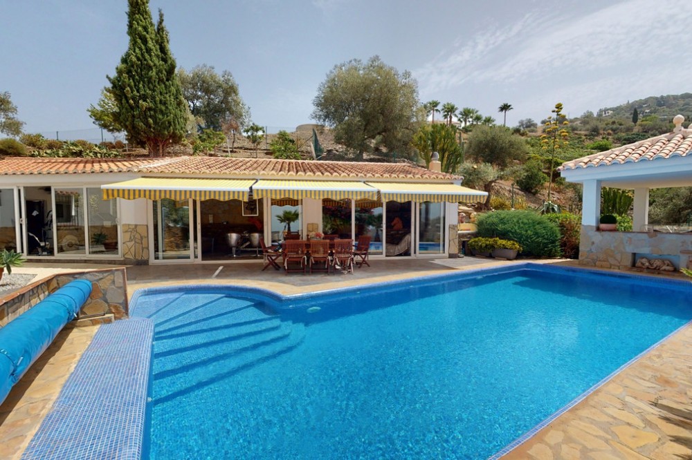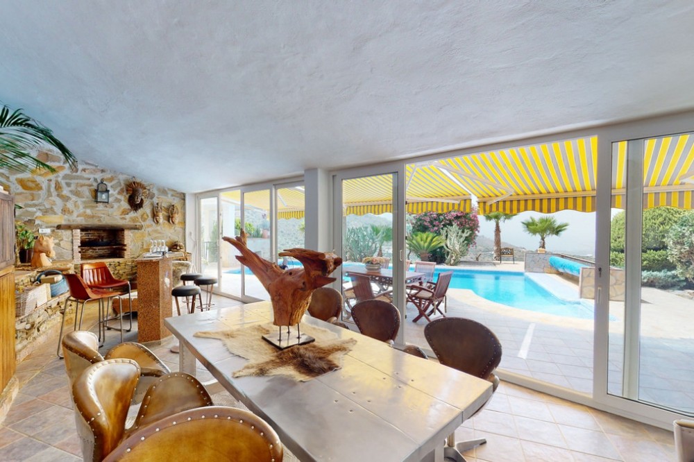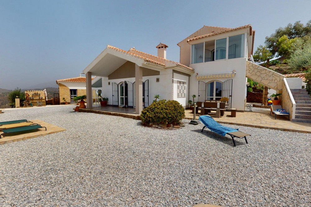 - If it ́s your dream to live in a fantastic, high quality built villa with a pool and breathtaking sea views, then you have found the right property. This 280 m2 luxury villa offers everything you could possibly want. In the centre of the modern villa mixed with Andalusian style is a charming patio, which gives the house a special accent and provides beautiful lighting and atmosphere. It links the entire lower area of the property. From the entrance area, one side leads to a room used as an office, as well as a bedroom with an on-suite bathroom and the spacious living room with a fireplace and sea views. This in turn is adjacent to the dining area and the kitchen, from which you enter the hallway that is connected to the entrance area. This hallway also leads to the dressing room with an on-suite bathroom, where there is a sauna. Stairs lead from the entrance to the second floor. Here you will find the large master bedroom with an on-suite bathroom and a winter garden. External stairs lead to the outdoor area, which gives this room a separate entrance. The wonderful outdoor area offers a double garage, as well as a laundry room, which is also used for storage. Right next to the inviting pool is a gym with bathroom, as well as a glass fronted annex that serves as a lounge area with an outdoor kitchen. The perfect place for celebrations and dinners with family and friends. On the 19,500 m2 property there is also a paddock, with shelter and its own driveway, for keeping horses. It ́s located below the house. The driveway also leads to a small riding arena with three horse stalls, a tack room and a shower for the horses. You have free design possibilities of the spacious property. Whether it is to plant a fruit and vegetable garden, expand the area of horse keeping, possibly convert the riding arena to a tennis court, volleyball or small soccer field, even something completely new. The choice is entirely up to you. We are pleased to be able to present this dream property to you soon, either personally or via virtual viewing. Because this world is unique - just like our Axarquía. In Andalusia. On the Costa del Sol. Here, on the sunny side of life...