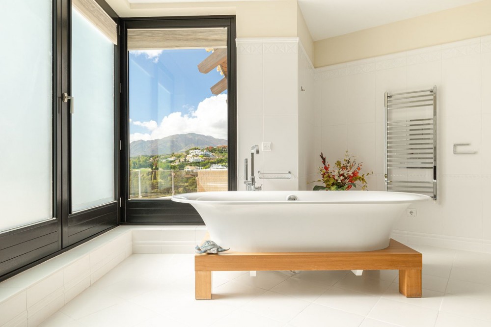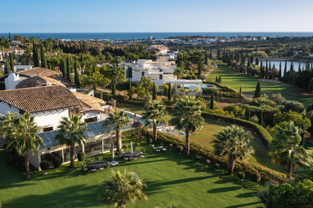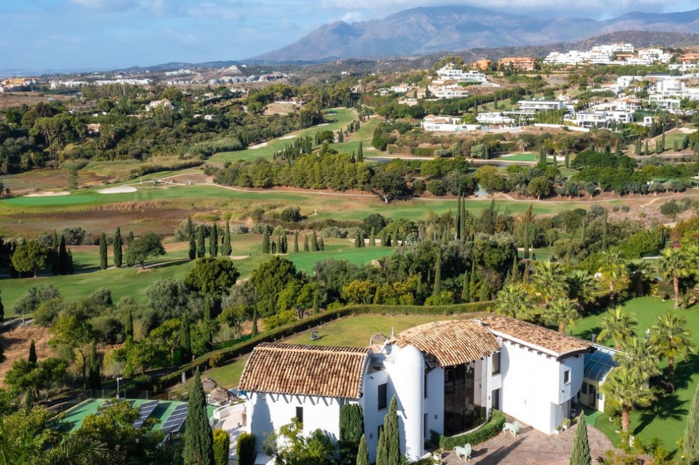 - This exceptional eight-bedroom villa is located in the prestigious gated community of Los Flamingos, offering an unparalleled blend of elegance, comfort, and breathtaking views. Positioned on a rare double plot, the property boasts uninterrupted panoramic views of both the Mediterranean Sea and the spectacular Loo Flamingos golf course, creating a serene and exclusive setting. The property has been designed with grand proportions and an emphasis on light, featuring soaring ceilings and floor-to-ceiling windows throughout the main residence. Each of the eight spacious bedrooms is ensuite, providing privacy and luxury, while separate staff quarters ensure convenience and discretion. For relaxation and entertainment, the property is unrivalled. Outdoors, a heated swimming pool is perfectly positioned to capture the stunning views, while the expansive summer kitchen and dining area can host up to 20 guests, making it ideal for gatherings. Inside, a private spa area invites complete indulgence, with a heated indoor pool and sauna offering year-round enjoyment.This villa combines world-class amenities with a setting of natural beauty and exclusivity, making it one of the most distinguished residences in Los Flamingos.