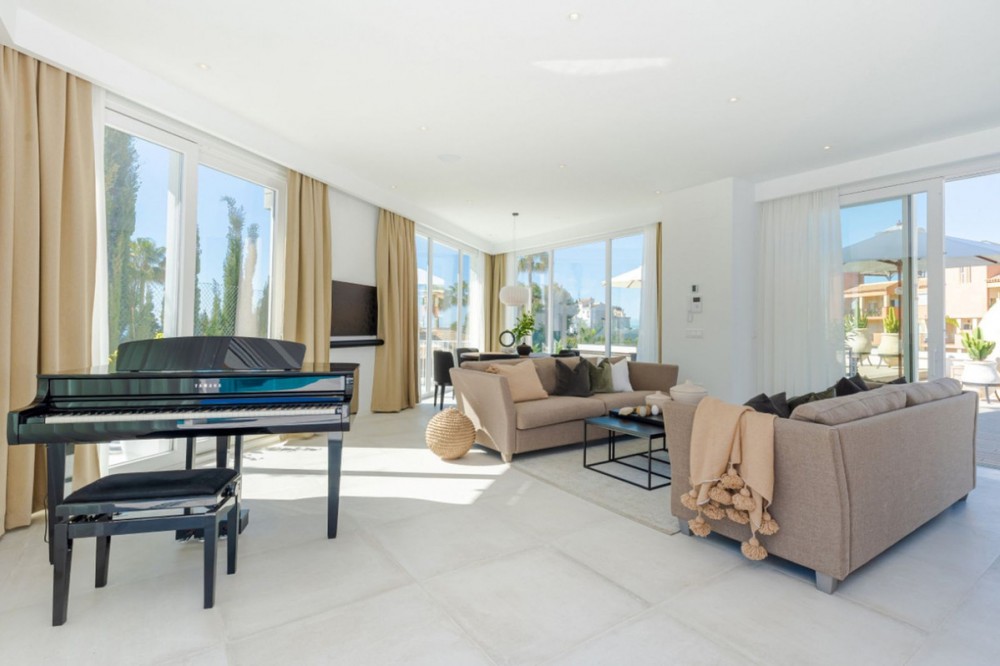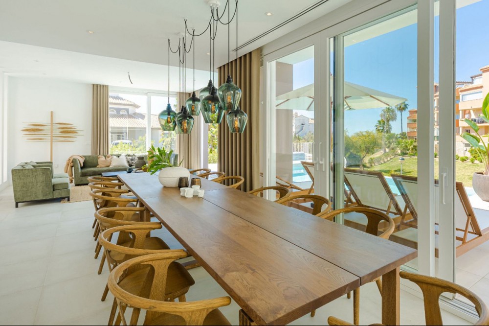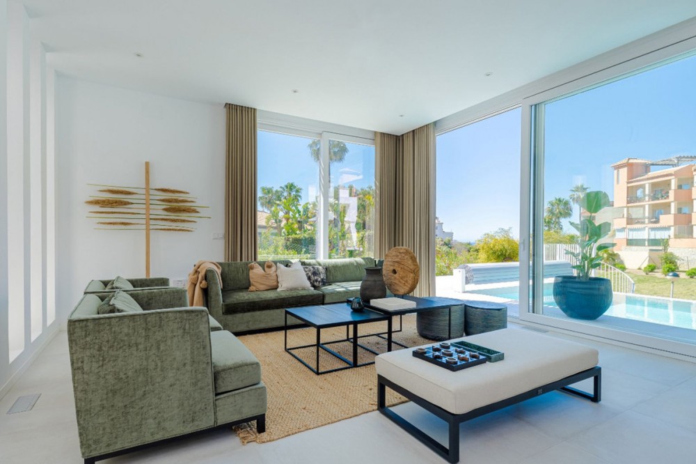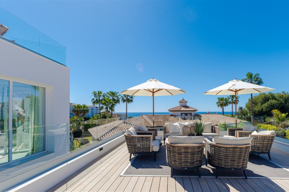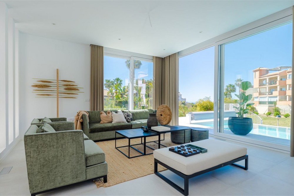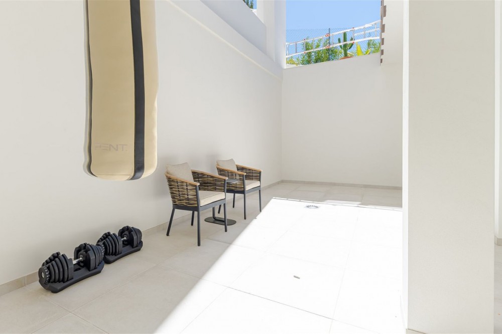 - 9 BEDROOM SOUTH-WEST FACING LUXURIOUS VILLAS WITH 2 HEATED SWIMMING POOLS, CINEMA ROOM, GYM AND WINE BODEGA CLOSE TO THE BEACH. This unique contemporary 9-bedroom property consists of TWO SEPARATE UNITS which are adjacent to each other on two adjoining plots. The properties could easily be joined together by installation of a lift or staircase if desired. Situated in a luxury, secure gated community, just 1.2 km (a 15 minute walk) from the beach, shops and restaurants in Riviera del Sol and Calahonda. This new development of 12 low-rise villas has been constructed in a contemporary style using very high-end materials. With a combined build size of 476 m2 these two properties consist of two lounges, two fully-equipped open-plan modern kitchens, two guest bathrooms and two large laundry rooms. All nine bedrooms (three in one property and six in the other) have ample fitted wardrobe space and ensuite bathrooms with underfloor heating. Nine of the bathrooms have walk-in showers, sink, and toilet and 1 bathroom has bathtub and shower. Most of the bedrooms have a semi-private outdoor space and are also equipped with a flat-screen TV. The owner has recently installed a gym with state-of-the-art equipment, a comfortable home cinema and a wine bodega with temperature control system. There is a Sonos home sound system providing excellent quality sound both inside and outside of the properties. High ceilings and large heat-resistant windows make the properties feel very spacious and bright allowing for the seamless integration of indoor and outdoor living spaces. Along with the two 8 x 4 metre heated saltwater swimming pools (with counter-current and electric cover) are a generous 89 m2 of terrace/porch areas and 2 huge roof solariums of 76 m2 and 141 m2 with glass balustrade and impressive 360 degree views over the sea and coastline. The total plot size is 977 m2. The current owners' interior design skills have transformed this property into a stunning and inviting space, perfect for daily living, as a holiday home or high rental-income property (currently rents for 12,000 Euros per week in high season). All interior and exterior designer furnishings are included in the asking price. There is gated covered parking for four vehicles and an additional two open parking spaces directly in front of the properties. Both properties are equipped throughout with air zone air-conditioning to ensure comfortable air quality and temperatures all year around, 1000 litre water reserve, water treatment system, UV resistant security glass, alarm system, safe, ample fitted wardrobe space, heated floors in ensuite bathrooms, high quality porcelain stoneware floor tiles (interior and exterior), 2 gas barbecues and video entry phone. Riviera del Sol sits on the Costa del Sol in Southern Spain midway between Marbella and Fuengirola. It is situated only a few minutes from the AP7 motorway access and the A7 national coastal road (formerly the N-340), allowing easy access to Malaga airport in 25 minutes and Marbella in 15 minutes. Riviera del Sol is a mixed residential and holiday area offering all the facilities and services needed to enjoy life comfortably. MUST BE SEEN TO APPRECIATE THE EXCELLENT QUALITIES AND POTENTIAL! VILLA 6 - 190M2 BUILD, 40M2 TERRACES, 76M2 SOLARIUM, 446M2 PLOT HALLWAY 3 BEDROOMS + 3 ENSUITE BATHROOMS GUEST BATHROOM UTILITY ROOM LOUNGE + OPEN PLAN KITCHEN (BUILT APART FROM BEDROOMS) 8 X 4 SWIMMING POOL SHARED COVERED PARKING FOR 4 CARS 1 OPEN PARKING SPACE VILLA 7 - 286M2 BUILD, 49M2 TERRACES, 141M2 SOLARIUM, 531M2 PLOT 6 BEDROOMS + 6 ENSUITE BATHROOMS (2 BEDROOMS ON LOWER FLOOR HAVE SEPARATE LOCK UP ENTRANCES) GUEST TOILET LOUNGE + OPEN PLAN KITCHEN UTILITY ROOM GYM WINE BODEGA CINEMA ROOM 8 X 4 SWIMMING POOL SHARED COVERED PARKING FOR 4 CARS 1 OPEN PARKING SPACE