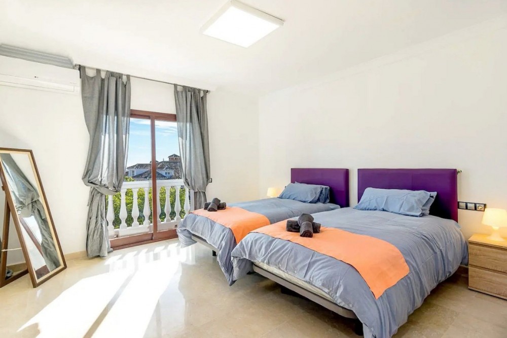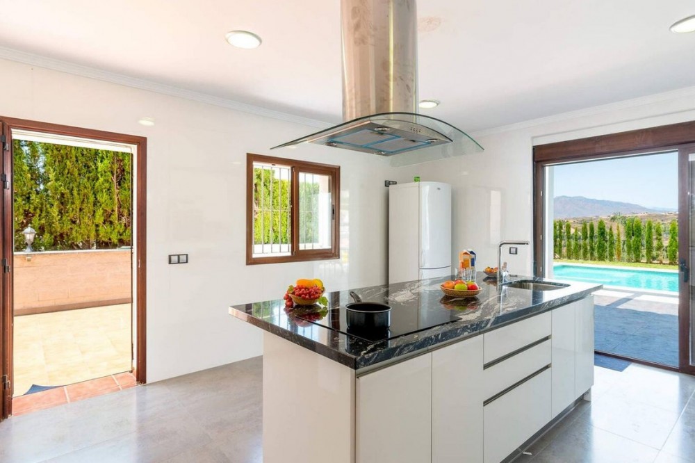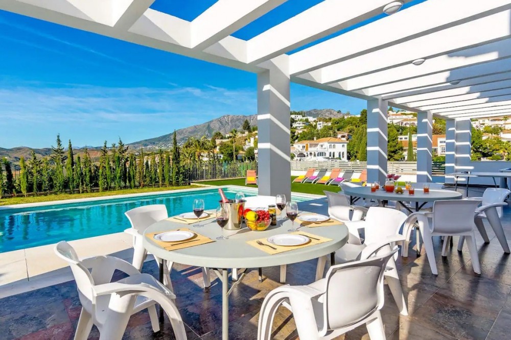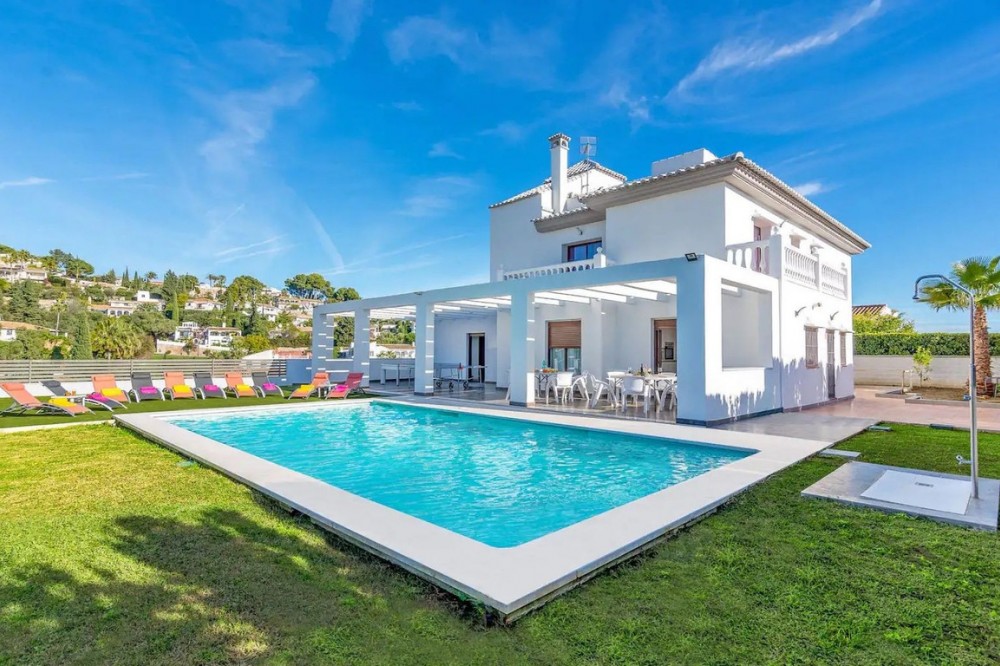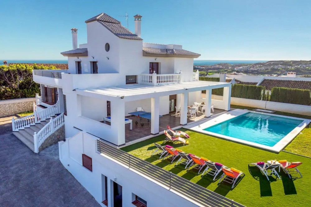 - This exceptional villa in Sierrezuela offers a private setting and unbeatable panoramic sea and golf views from the upper level and rooftop terrace. Originally built in 2014, the villa has recently been refurbished, including a modern kitchen and underfloor heating in the bathrooms. A driveway with a secure, automatic gate leads to the the private garage and a front patio with additional parking for 2 cars. An elegant staircase leads from the patio to the main entrance. The hall on the main floor leads to a generous sitting and dining area with a fire place and access to a small terrace. The large, modern kitchen boasts sleek finishes and convenient access to the pool area and a back garden with BBQ area, ideal for alfresco dining. The main floor also features a guest bedroom with an en-suite bathroom, an office, and a guest toilet. The first floor comprises four bedrooms, including the main bedroom with an ensuite bathroom and terrace. The rooftop terrace offers unparalleled panoramic views of the sea and Mijas Golf, providing an idyllic setting for relaxation and entertainment. The lower level of the villa present additional living space comprising three bedrooms, a living room and a small kitchen, offering potential for various lifestyle needs. Outside, the villa boasts a large covered terrace, a garden with a large pool, and a back garden with a BBQ area, perfect for enjoying the Mediterranean climate in style. Situated in the beautiful residential area of Sierrezuela, only a short drive to Fuengirola town, the beaches, and Mijas Golf, this villa offers the perfect blend of serenity and convenience, making it an ideal family home.