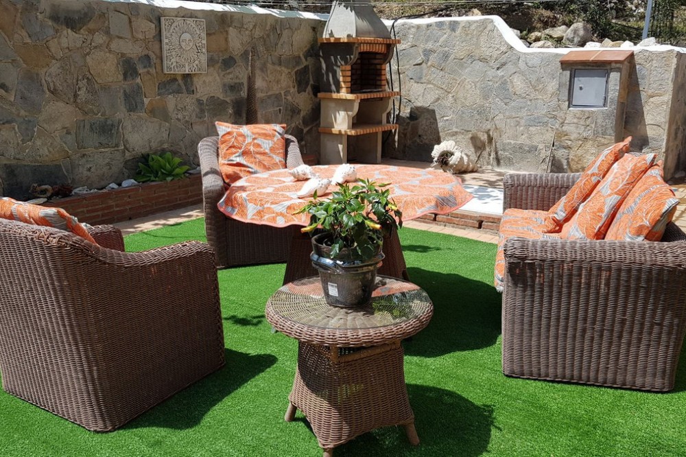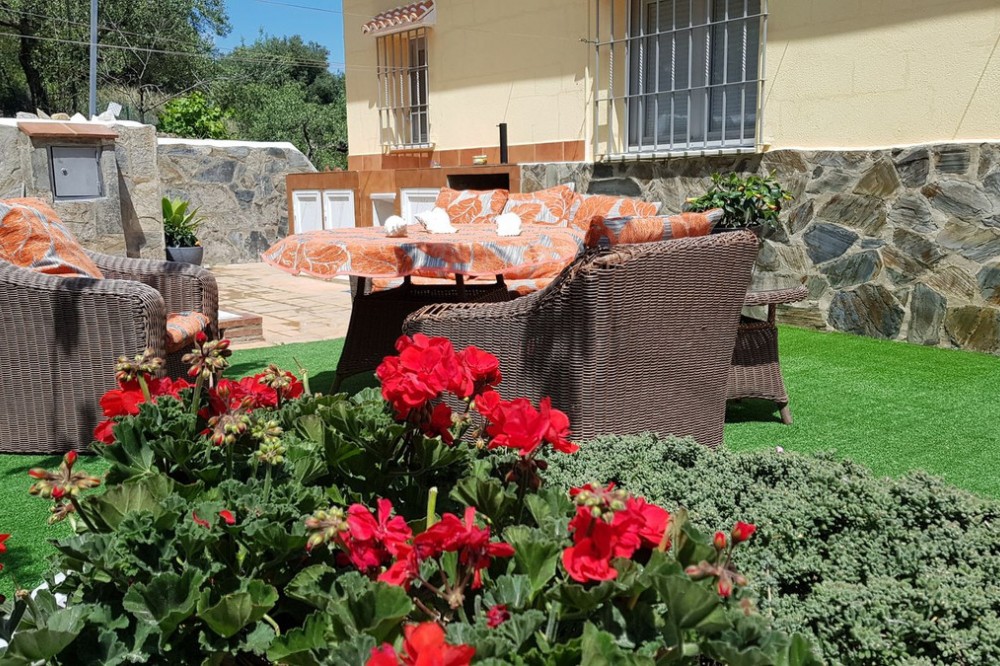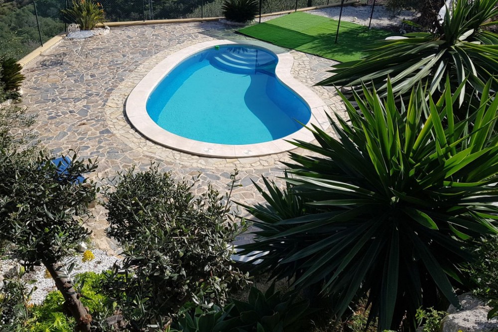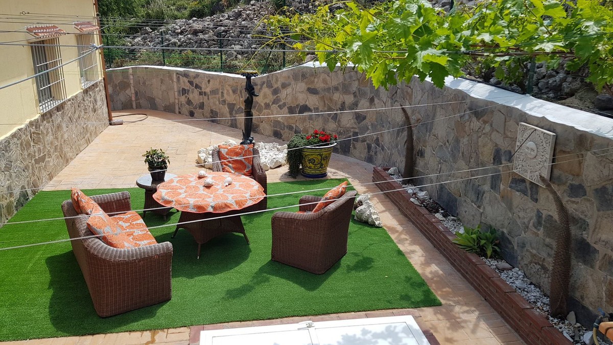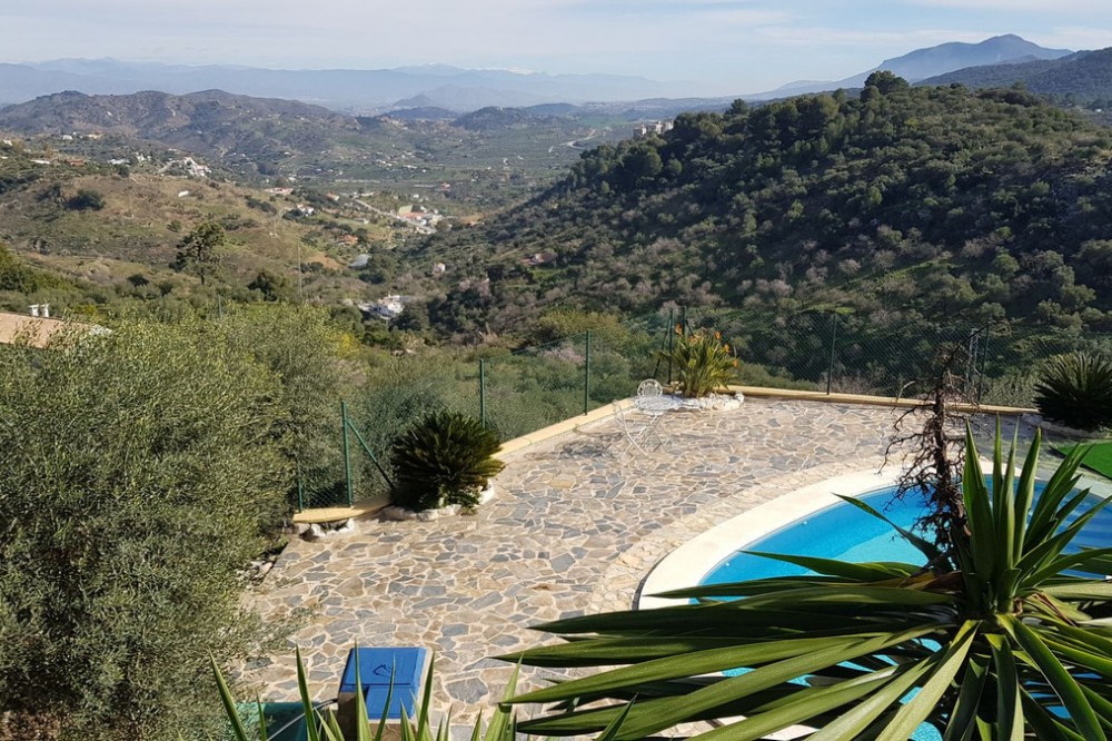 - This beautiful country house - built in 2012 - has a large garage with workshop (approx. 45 m²), a guest flat (approx. 45 m²) with living room and open-plan kitchen, a shower room and a separate large terrace. The living space is approx. 90 m². There are 2 bedrooms and 2 bathrooms (one en-suite) and an open-plan kitchen - very smart and only 3 years old. A large terrace of approx. 30 m² with marvellous views of the mountains as far as Málaga and the Sierra Nevada is accessible from the living room, another terrace is located behind the building. There is a private well and a large underground tank with a capacity of 11,000 litres for drinking water in case the groundwater is insufficient. A small pool - not heated, no air conditioning and no heating - just a fireplace in the living room. The plot measures approx. 3,500 square metres and is planted with olive trees, lemon trees, vines, almond trees, etc. For further information please do not hesitate to contact us Translated with DeepL.com (free version)