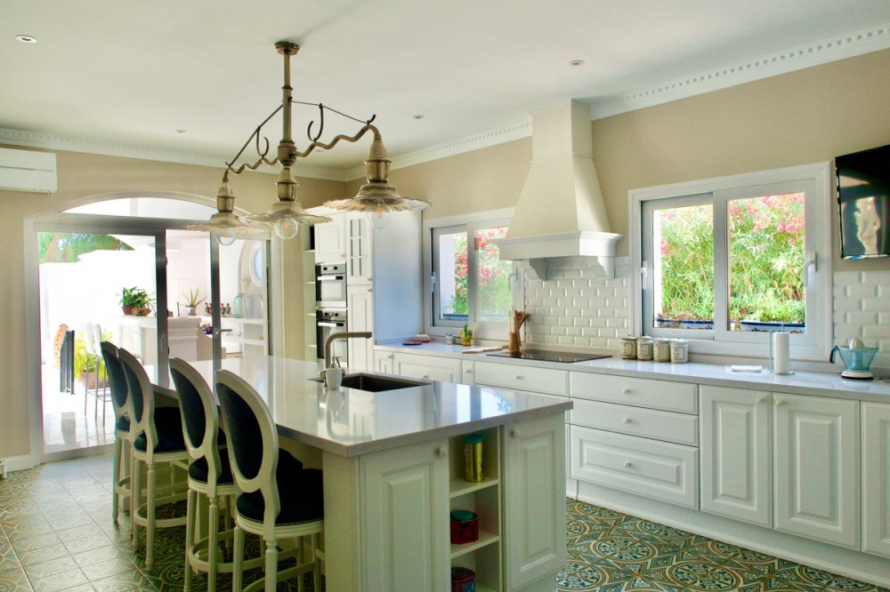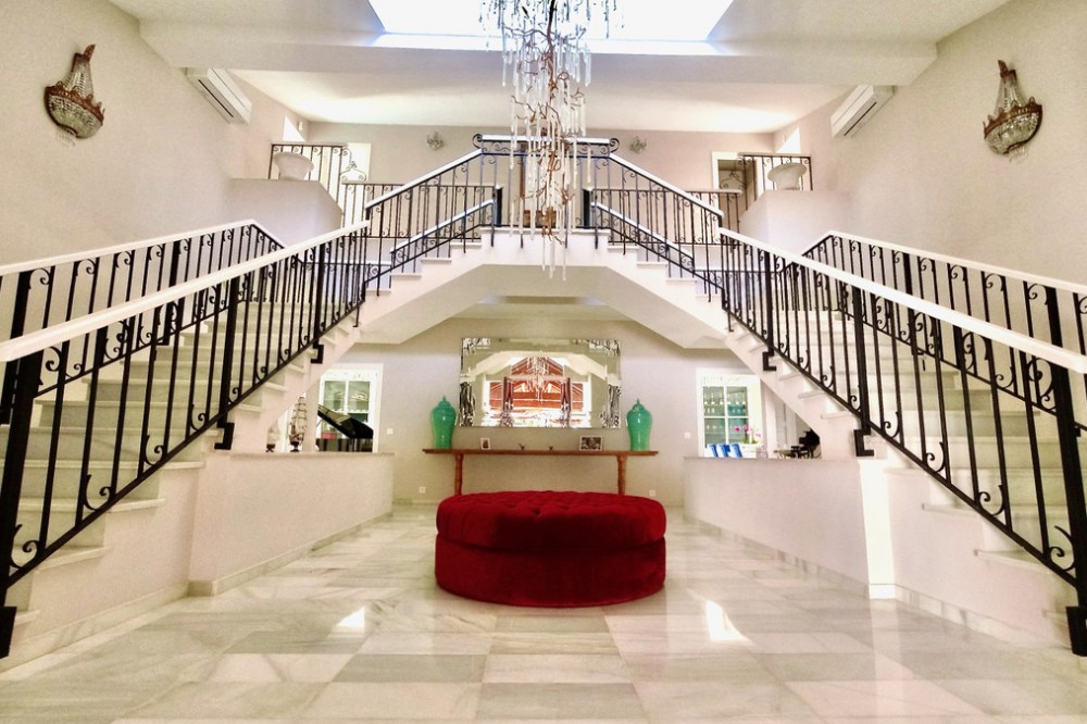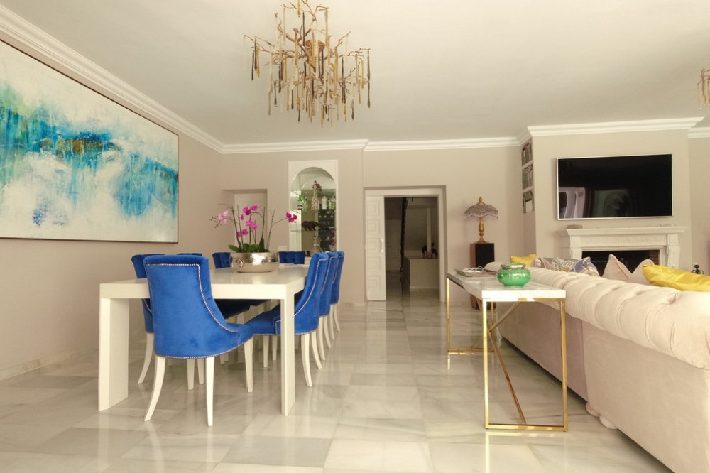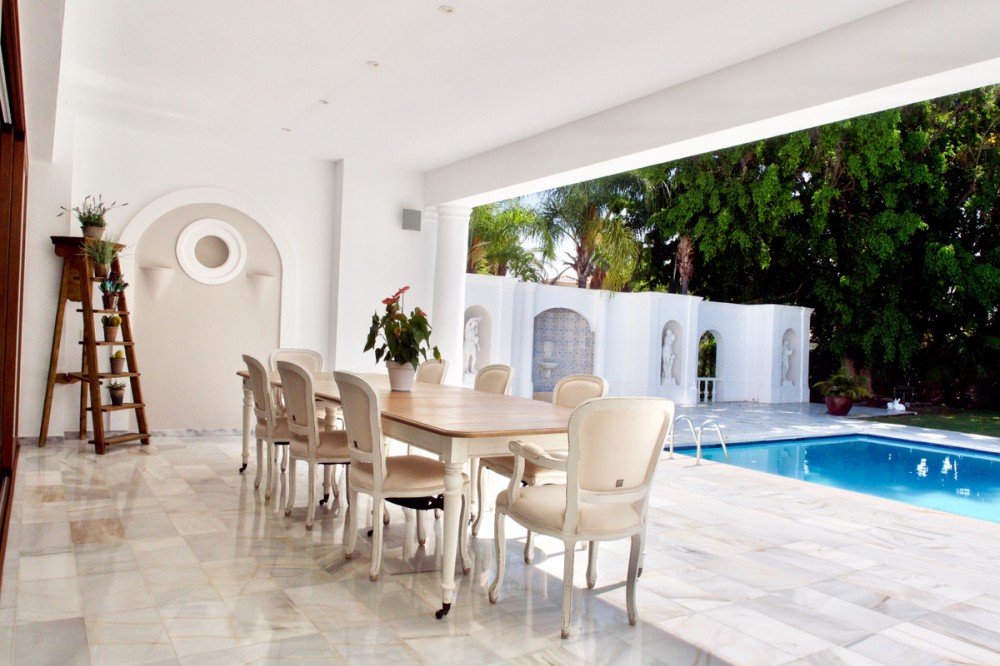 - Discover the epitome of luxury living with this impressive and elegant villa, perfectly situated in a serene cul-de-sac. Spanning an expansive built area of 730 m² on a generous plot of 2400 m², this home features mature private gardens and a stunning pool, all while offering breat htaking sea views. The villa has been meticulously renovated to the highest standards, showcasing a classic style that exudes sophistication. As you enter through the large automatic entrance doors, a long private driveway leads to a covered parking area accommodating up to six cars, along with a spacious double garage of 136 m². Step inside to be greeted by an impressive reception area adorned with double-height oak doors and a magnificent double-sided staircase. The main living and dining rooms boast full-height glass windows that flood the space with natural light and offer picturesque views of the pool and gardens. The recently fitted luxury kitchen is a chef's dream, featuring high-end appliances and handmade units with an island, perfect for entertaining. Adjacent to the kitchen, enjoy seamless access to the pool terrace, complete with a bar and BBQ area. The ground floor also includes staff quarters and a large utility room for added convenience. Ascend the two elegant curved stairways to the first floor, where you'll find two double ensuite bedrooms with expansive terraces overlooking the gardens and pool area. An additional double bedroom with an ensuite bathroom offers stunning sea views from its private terrace. This exclusive property is not overlooked, providing ultimate privacy while being just a short walk from the sea and local amenities. With easy access to San Pedro, Puerto Banús, and Marbella within a 10-minute drive, this villa is the perfect blend of luxury and location. Don’t miss the opportunity to make this stunning villa your dream home!