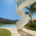 - This prestigious villa stands as a testament to architectural ingenuity, capturing the essence of uniqueness and sophistication. Designed by the visionary minds of Vicens & Ramos architects, its futuristic yet nostalgic structure commands attention with its flowing lines and harmonious integration within the lush green surroundings. The villa harmoniously coexists with nature, enveloped by a tapestry of vibrant greenery. The ground floor accommodates all living spaces, while the upper level features a captivating dome-like entrance and a bespoke spiral staircase, evoking a sense of grandeur. The entrance, thoughtfully designed for parking convenience, sets the stage for welcoming guests and making a lasting impression. An outdoor spiral staircase grants direct access to the garden from the entry level. The ground floor encompasses a fully-equipped kitchen, generous living and dining areas and four stunning bedrooms, each offering their own unique charm. With an abundance of windows and glass sliding doors, natural light floods the interior, seamlessly connecting it to the outdoors. The villa boasts a captivating garden, highlighted by an egg-shaped pool adorned with tranquil light blue tiles. Towering palm trees grace the landscape, while the verdant grass provides ample space for leisure and social gatherings. The terrace tiles, specially chosen for this property, add yet another bespoke touch to the villa's distinctive character. Offering an unparalleled architectural masterpiece, this exceptional villa promises an extraordinary personal retreat, complemented by breathtaking views and an enviable location within the esteemed Finca Cortesin Resort.