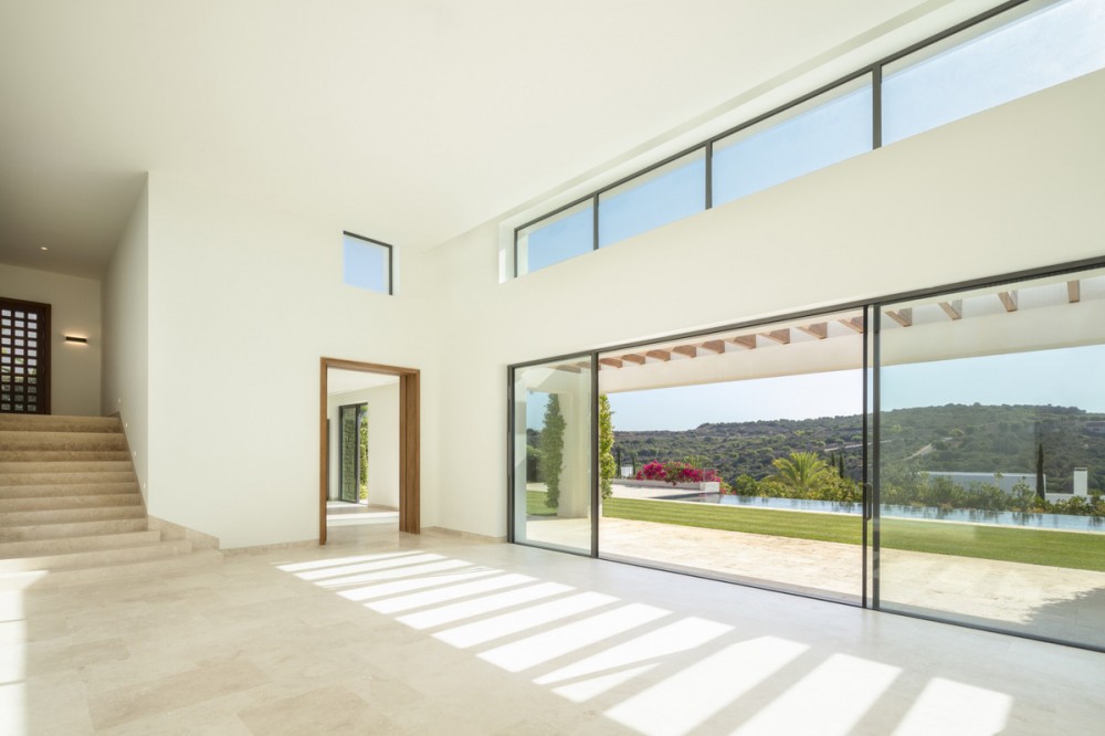 - Nestled within the enclave of Green 10 in the Finca Cortesin resort, this villa exudes the charm of Ibiza-style residences. The white structure, adorned with traditional Mediterranean stones, creates a captivating atmosphere for ultimate enjoyment. Set on a generous plot, the property boasts meticulously manicured gardens, adorned with swaying palm trees and vibrant floral bushes. A stunning pool beckons for a refreshing dip, while the covered terrace provides a delightful space for al-fresco dining and a relaxing oasis. Spanning across two floors, the villa offers direct garden access from the ground level. The inviting ground floor encompasses a spacious living, dining and kitchen area, adorned with high ceilings and abundant windows that bathe the space in natural light. The modern kitchen comes fully equipped with top-of-the-line Gaggenau appliances. Two guest rooms, with direct access to the garden, are thoughtfully located on the ground floor. The upper level of the villa is dedicated to the remaining bedrooms, each boasting its own private bathroom. The walkway connecting the rooms offers a picturesque view of the living area, creating an interior balcony-like experience. The property boasts sweeping vistas of the golf course and surrounding mountain range, providing an idyllic backdrop that radiates tranquility and serenity. The property also has a private driveway for parking convenience within the plot. With its coveted location within the Finca Cortesin resort, this villa is an ideal haven for families or those seeking to embrace the luxurious Mediterranean lifestyle in all its splendor.