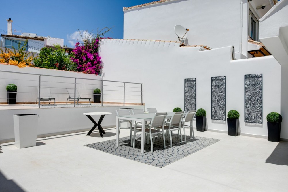 - A beautifully renovated beachfront villa with perfect sea views. The house has been tastefully modernised to offer a large open plan living room with fully fitted modern kitchen, on the lower level is also one of the 3 bedrooms with bathroom. Upstairs are 2 further double bedrooms and another bathroom. At the rear of the house is a super large patio for alfresco dining and sun bathing area, at the front is a smaller terrace on the ground level and also a balcony off of the upstairs bedrooms from which you can enjoy the panoramic views. The community offers 5 swimming pools, tennis courts and gymnasium plus direct access onto the beach and promenade. Located halfway between Estepona and Duquesa the house is perfectly positioned. Viewing is highly recommended. The property benefits from an active tourist license. Detached Villa, Estepona, Costa del Sol. 3 Bedrooms, 2 Bathrooms, Built 160 m², Terrace 45 m². Setting : Beachfront, Close To Port, Close To Marina, Urbanisation. Orientation : South. Condition : Excellent, Recently Renovated. Climate Control : Air Conditioning, Hot A/C, Cold A/C. Views : Sea. Features : Fitted Wardrobes, Near Transport, Private Terrace, Marble Flooring, Double Glazing. Furniture : Fully Furnished. Kitchen : Fully Fitted. Garden : Communal. Security : Electric Blinds. Parking : Street. Utilities : Electricity, Drinkable Water. Category : Beachfront, Luxury, Resale.