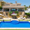 • LUXURIOUS VILLA WITH SEA VIEWS AND TOP FACILITIES WITHIN WALKING DISTANCE OF LA CALA DE MIJAS Discover this fully renovated 5 bedroom, 5 bathroom villa, just a ten-minute walk from the bustling centre of La Cala de Mijas. The villa was built in 2008 and in the last 2 years everything has been completely renovated, with the atmosphere and original character still coming to the fore. This, together with the high-quality finishes, makes this a villa full of comfort that offers everything you could wish for. Enter the villa through an impressive wooden door and walk through the front garden with fountain to the main entrance. The spacious hall with chandelier and high ceiling immediately offers a breathtaking view of the sea. The bright living room, with partly open kitchen with luxury Siemens appliances and cooking island, has a full-length terrace for optimal light and sea views. Also on the ground floor is a separate toilet and a spacious bedroom with walk-in dressing room and en suite bathroom. There is an elevator for easy access to all floors, but of course you can also reach both the basement and the upper floor via the stairs. On the upper floor there are 2 spacious bedrooms, both with a bathroom en suite. Again, there is a beautiful sea view and both bedrooms give access to a large roof terrace. There is also a separate office space on this floor. The basement should certainly not be forgotten and we will explain to you why! The basement is a versatile space with a bar, an indoor swimming pool, a gym, a studio with bathroom, kitchen and private entrance, an office space, a laundry room, bathroom, storage room and a garage with space for 3 cars. In this bar you have your own party location at home! The bar is equipped with a professional beer tap, refrigerators, stained glass windows and a billiards table. Next to this room is the heated indoor swimming pool which is equipped with showers and toilet. The indoor pool has an automatic dehumidifier. In the water installation there is a water descaler for the complete supply of all the water in all rooms. Both the basement and the ground floor give access to the garden of 375m2. This has also recently been redesigned, including fruit trees and a sprinkler system. The beautiful salt water swimming pool, with separate shower, has also been completely re-tiled and in the evening the lighting in both the pool and the fountain creates a beautiful atmosphere. We are talking about a villa that has been completely renovated: • New kitchen and 5 new bathrooms • Completely renewed water pipes and electrical installations • The garden has been redesigned • A total of 7 new plastic sliding doors have been installed • The villa has been completely replastered and painted, inside and out • New electric awnings and underfloor heating throughout the villa Finally; There are electric shutters throughout for extra comfort and the villa also has an advanced alarm and camera system for optimal security. Experience ultimate comfort and luxury in this unique villa. Make an appointment for a viewing today!
