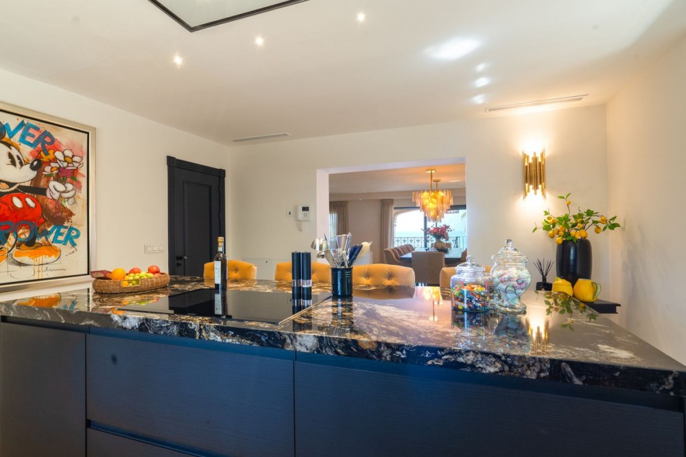 • LUXURIOUS VILLA WITH SEA VIEWS AND TOP FACILITIES WITHIN WALKING DISTANCE OF LA CALA DE MIJAS Discover this fully renovated 5 bedroom, 5 bathroom villa, just a ten-minute walk from the bustling centre of La Cala de Mijas. The villa was built in 2008 and in the last 2 years everything has been completely renovated, with the atmosphere and original character still coming to the fore. This, together with the high-quality finishes, makes this a villa full of comfort that offers everything you could wish for. Enter the villa through an impressive wooden door and walk through the front garden with fountain to the main entrance. The spacious hall with chandelier and high ceiling immediately offers a breathtaking view of the sea. The bright living room, with partly open kitchen with luxury Siemens appliances and cooking island, has a full-length terrace for optimal light and sea views. Also on the ground floor is a separate toilet and a spacious bedroom with walk-in dressing room and en suite bathroom. There is an elevator for easy access to all floors, but of course you can also reach both the basement and the upper floor via the stairs. On the upper floor there are 2 spacious bedrooms, both with a bathroom en suite. Again, there is a beautiful sea view and both bedrooms give access to a large roof terrace. There is also a separate office space on this floor. The basement should certainly not be forgotten and we will explain to you why! The basement is a versatile space with a bar, an indoor swimming pool, a gym, a studio with bathroom, kitchen and private entrance, an office space, a laundry room, bathroom, storage room and a garage with space for 3 cars. In this bar you have your own party location at home! The bar is equipped with a professional beer tap, refrigerators, stained glass windows and a billiards table. Next to this room is the heated indoor swimming pool which is equipped with showers and toilet. The indoor pool has an automatic dehumidifier. In the water installation there is a water descaler for the complete supply of all the water in all rooms. Both the basement and the ground floor give access to the garden of 375m2. This has also recently been redesigned, including fruit trees and a sprinkler system. The beautiful salt water swimming pool, with separate shower, has also been completely re-tiled and in the evening the lighting in both the pool and the fountain creates a beautiful atmosphere. We are talking about a villa that has been completely renovated: • New kitchen and 5 new bathrooms • Completely renewed water pipes and electrical installations • The garden has been redesigned • A total of 7 new plastic sliding doors have been installed • The villa has been completely replastered and painted, inside and out • New electric awnings and underfloor heating throughout the villa Finally; There are electric shutters throughout for extra comfort and the villa also has an advanced alarm and camera system for optimal security. Experience ultimate comfort and luxury in this unique villa. Make an appointment for a viewing today!