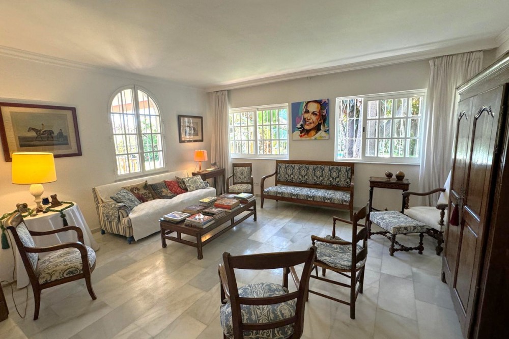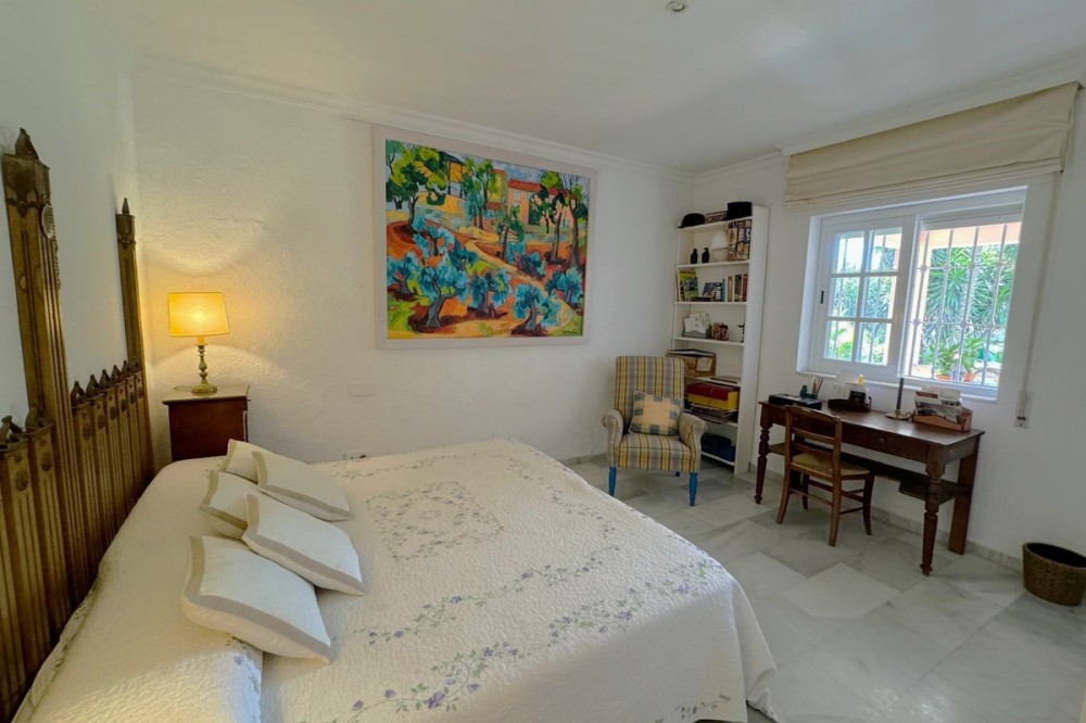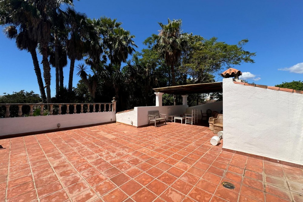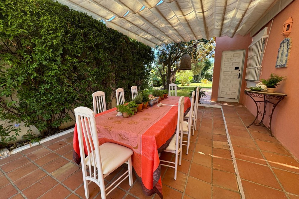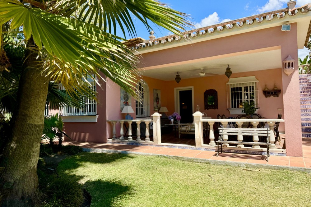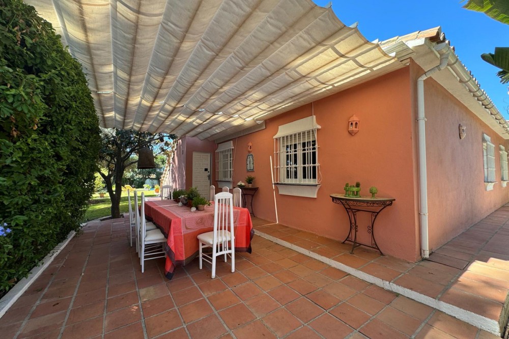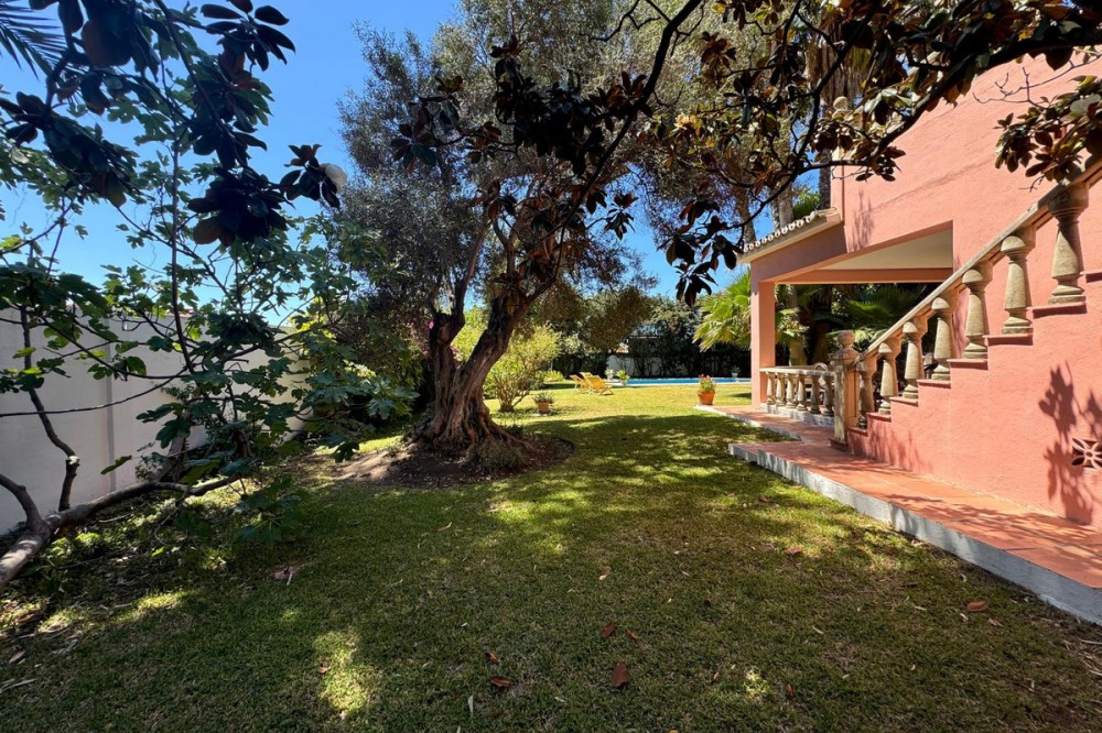 • Beautiful family villa with a lot of charm located on the second line of the beach the well established urbanisation Linda Vista Baja, San Pedro de Alcántara. Built on a single floor, on a beautiful plot it has a very nice mature garden, with tropical plants and fruit trees. Due to its magnificent position, it is a very interesting renovation proyect. Just a few minutes walk to all kinds of services such as restaurants, international schools and shops. South facing, with beautiful views of the sea and to the mountains from the roof terrace. It consists of: cozy covered porch very privated with views to the garden. Spacious living room with dining area and fireplace, large fully equipped kitchen with breakfast area and laundry room. In total there are 6 double bedrooms with built-in cupboards + 1 maid's bedroom and 3 bathrooms. The master bedroom is very spacious with its en-suite bathroom and office. Maid's room with shower room. On the East side of the house, there is a very cozy patio, ideal as a summer dining room for the whole family covered with awnings. Private garage and outdoor parking area for several cars. Air-conditioning. Solar panels.