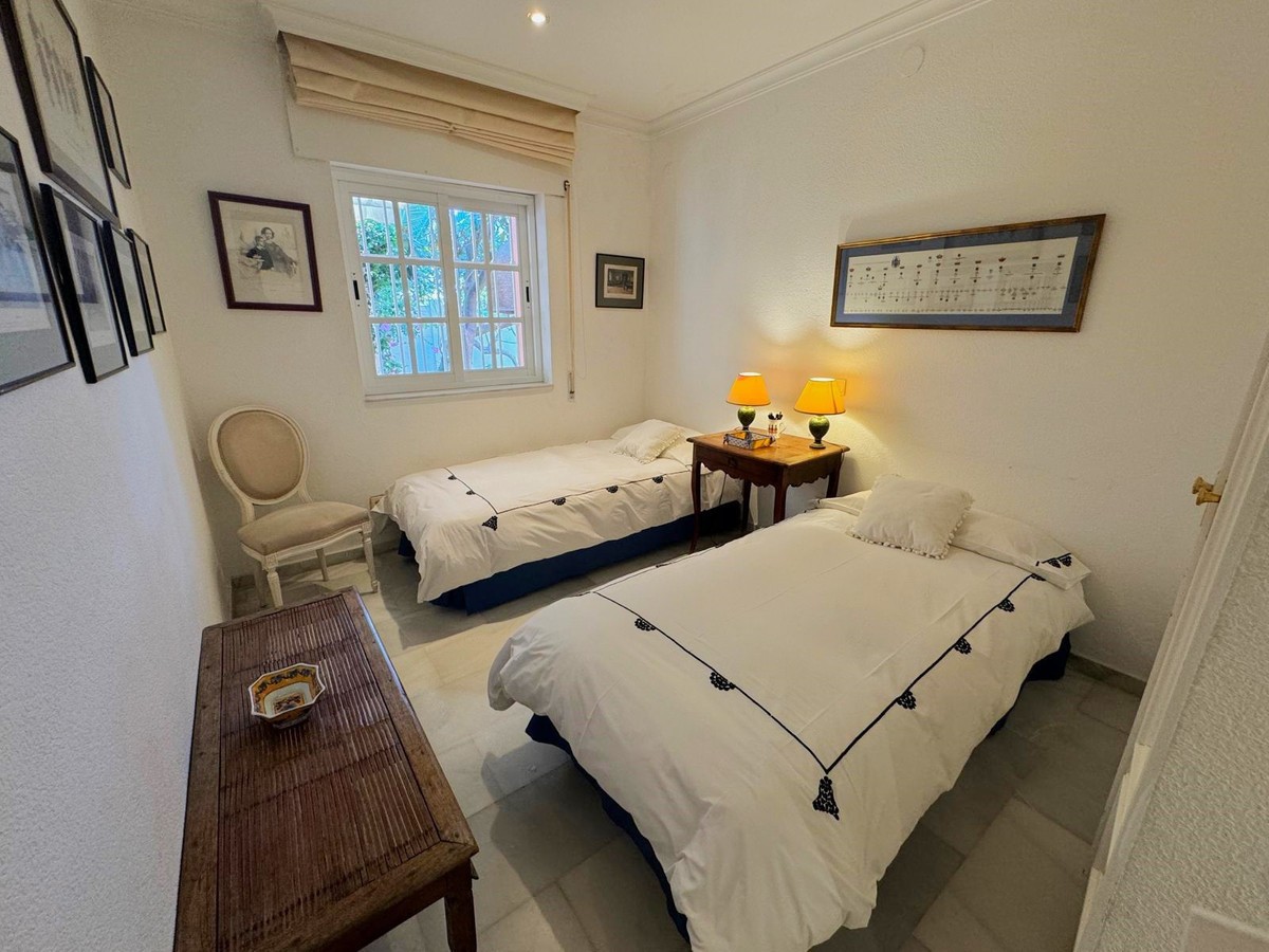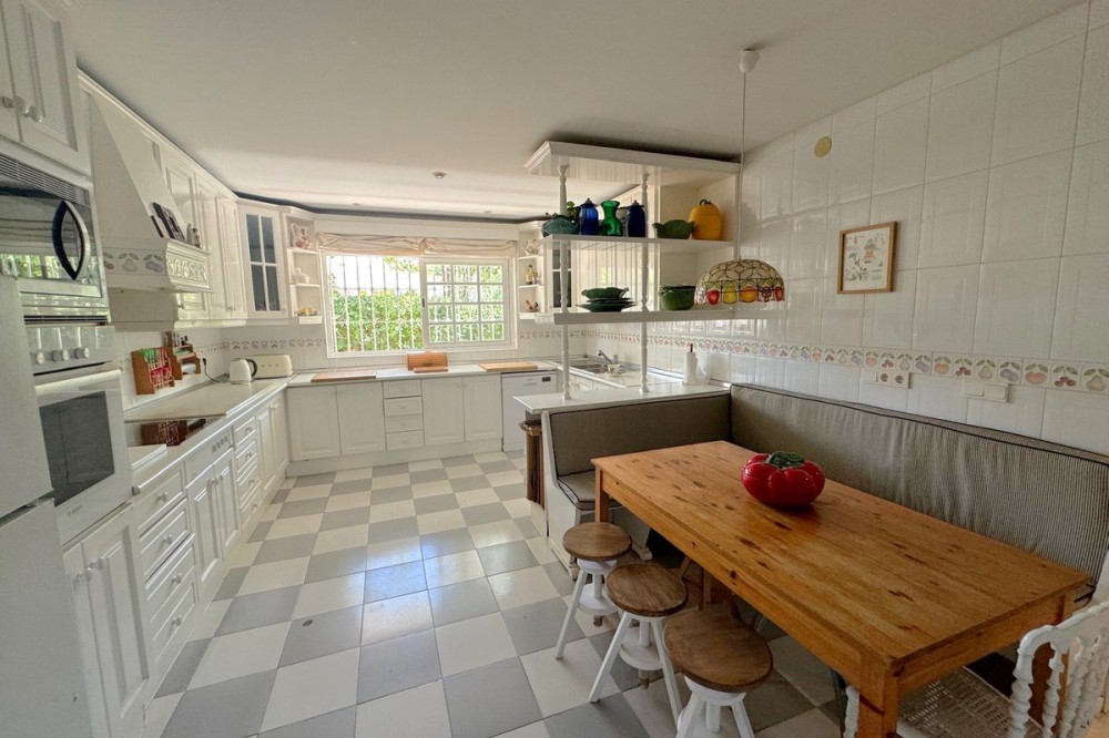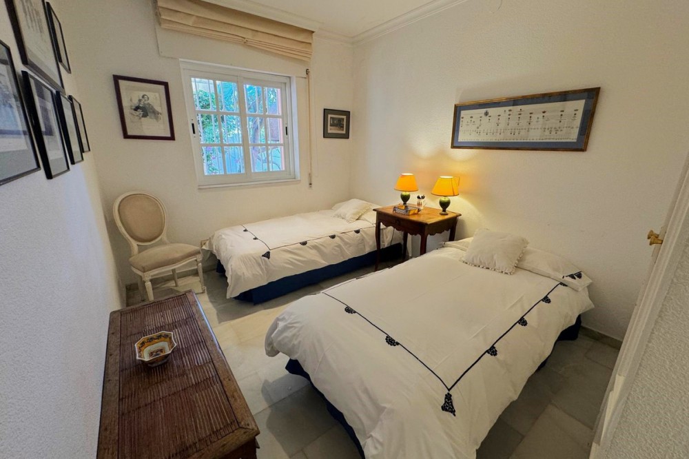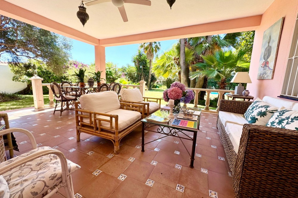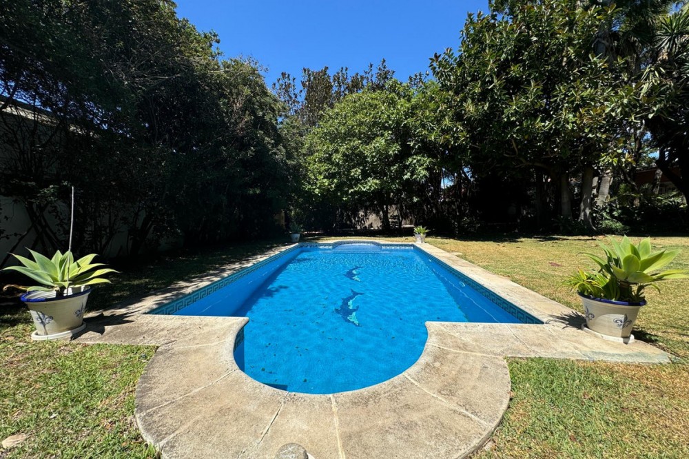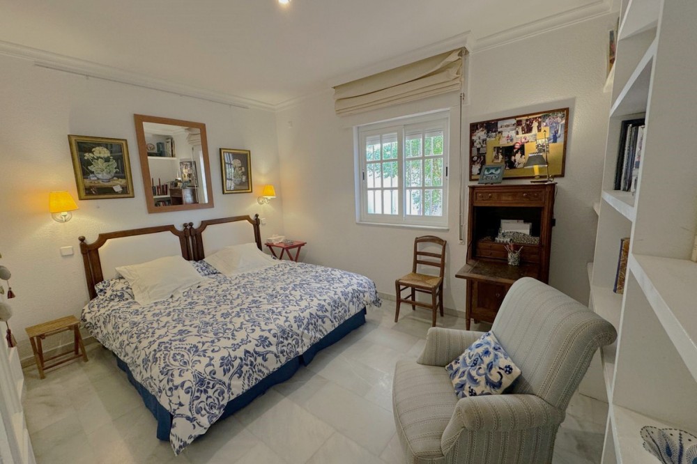 • Beautiful family villa with a lot of charm located on the second line of the beach the well established urbanisation Linda Vista Baja, San Pedro de Alcántara. Built on a single floor, on a beautiful plot it has a very nice mature garden, with tropical plants and fruit trees. Due to its magnificent position, it is a very interesting renovation proyect. Just a few minutes walk to all kinds of services such as restaurants, international schools and shops. South facing, with beautiful views of the sea and to the mountains from the roof terrace. It consists of: cozy covered porch very privated with views to the garden. Spacious living room with dining area and fireplace, large fully equipped kitchen with breakfast area and laundry room. In total there are 6 double bedrooms with built-in cupboards + 1 maid's bedroom and 3 bathrooms. The master bedroom is very spacious with its en-suite bathroom and office. Maid's room with shower room. On the East side of the house, there is a very cozy patio, ideal as a summer dining room for the whole family covered with awnings. Private garage and outdoor parking area for several cars. Air-conditioning. Solar panels.