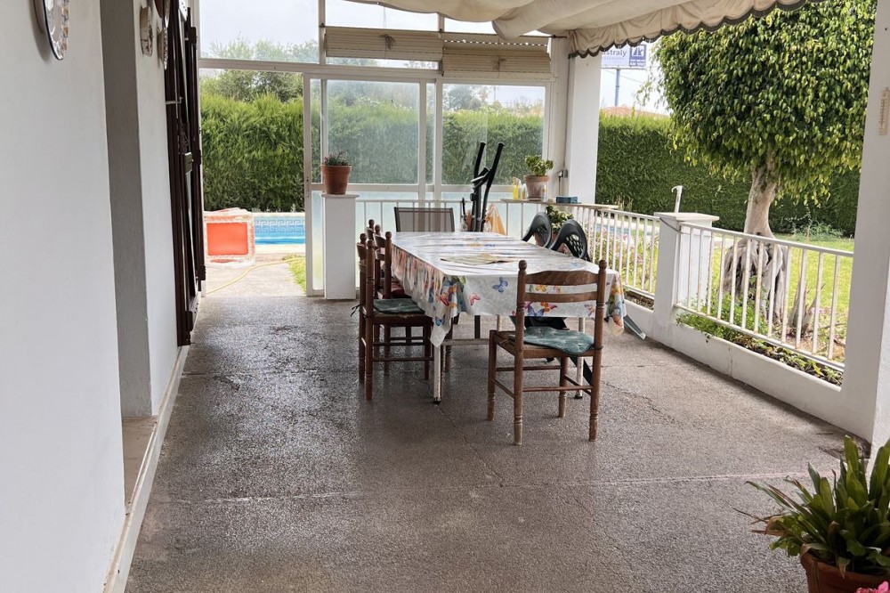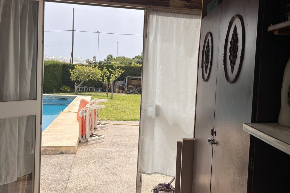 - Large plot with house and swimming pool in the area of el Velerín. It is very close to hospital, school, supermarkets, beach bar and beach. Very well located, with quick access to the motorway and close to the pass that crosses it. The plot is flat and on entering we find the garage, following the road we reach the porch of the main house, barbecue area and three more rooms that are currently used as bedrooms with a bathroom. The porch is covered and gives access to the entrance of the house. The main house is distributed in a living-dining room next to the kitchen with three large bedrooms and two bathrooms, one of them en suite. Next to the porch we find the barbecue area that leads to the area where the three bedrooms with a bathroom are located. On the right side of the main house is the swimming pool with a shower and toilet area. There is also a large storage room in this area. the property would benefit from a reform as it has many possibilities. it is a great product for investment. Translated with DeepL.com (free version)