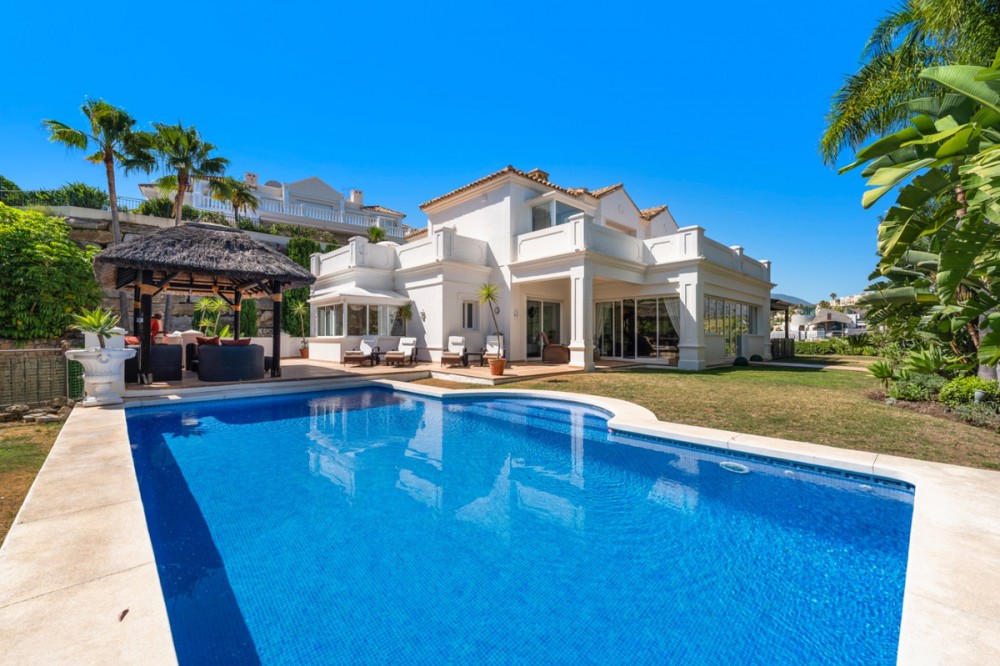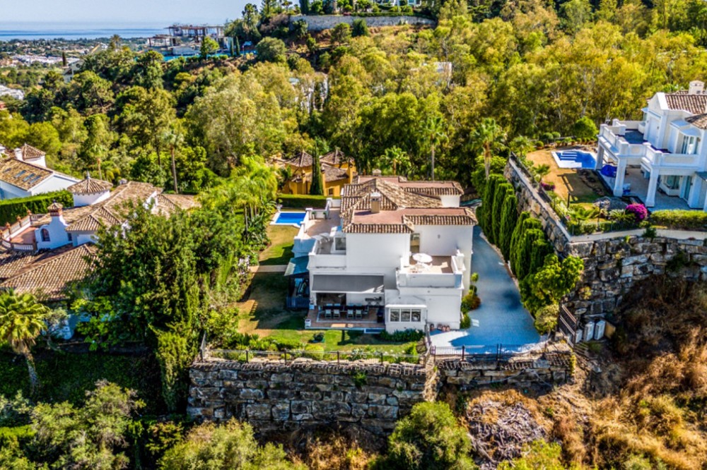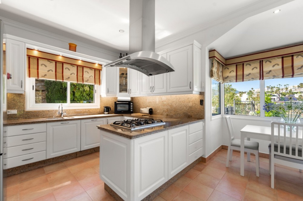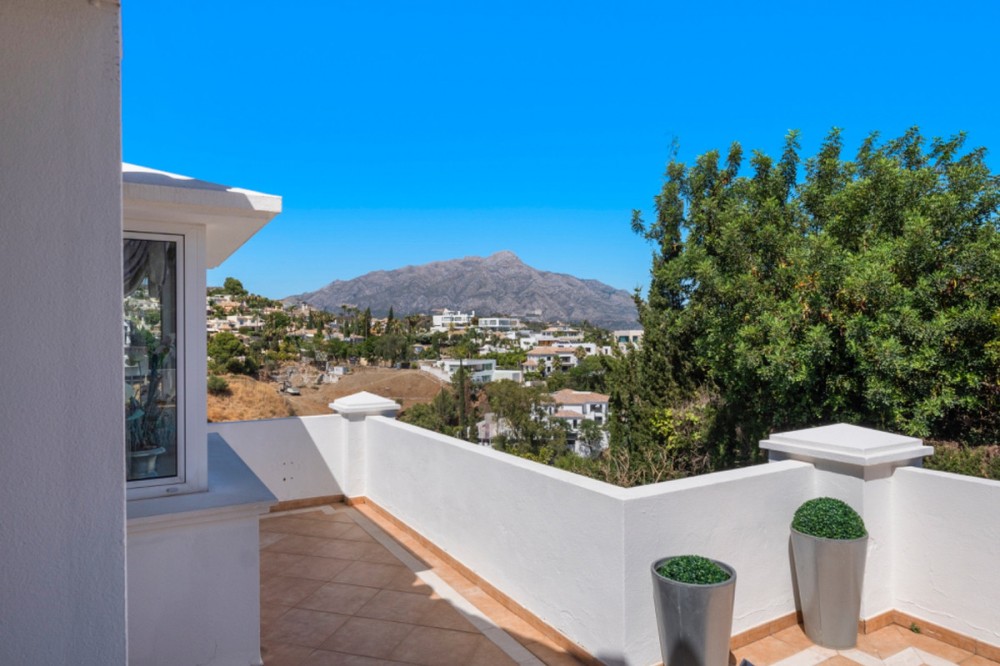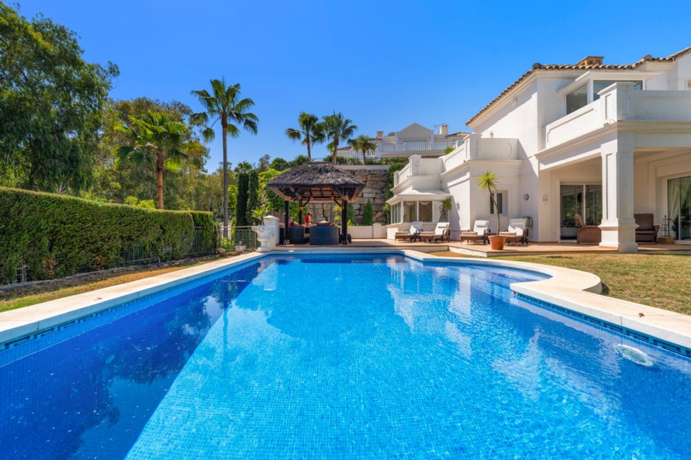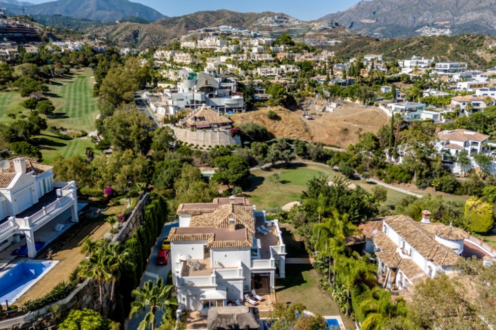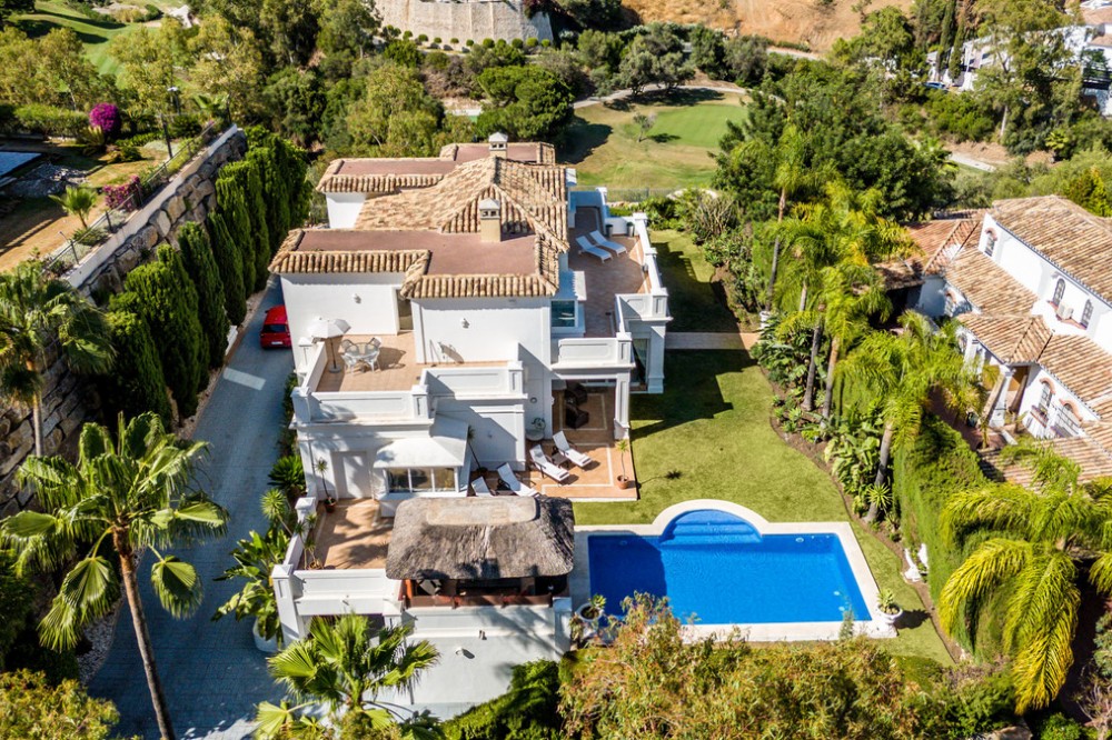 • Villa Alto sits proudly within one of the coast’s most exclusive gated communities, surrounded by a world-class golf course and protected by 24-hour security. This elegant five-bedroom villa combines privacy, space, and style across three levels, offering panoramic views of La Concha mountain and the lush golf valley. Inside, bright open spaces flow from a grand entrance hall to a spacious living and dining area with full glass doors leading to the terrace. The kitchen is modern and light-filled, designed for both cooking and entertaining. Each bedroom is generously sized and features an ensuite bathroom, with the main suite enjoying its own terrace and dressing room. Outside, landscaped gardens wrap around the villa with a large pool, shaded lounge, and outdoor dining area with barbecue. The terraces invite you to relax, dine, or simply take in the mountain and valley views. Villa Alto is a statement of refined living for those seeking comfort, security, and elegance in a prime location.