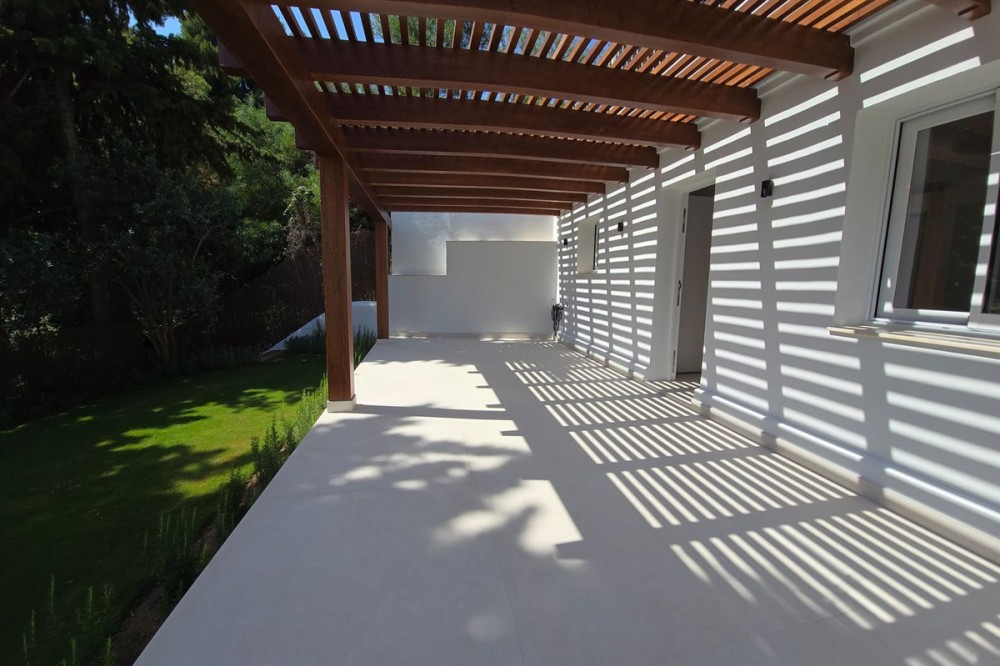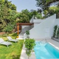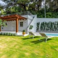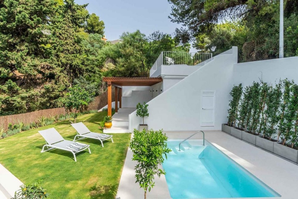 - Fantastic detached villa for sale in the centre of Marbella, 5mn walking distance to the old town. The plot has 690m2 of land. It is totally refurbished and tastefully decorated with quality furniture (Roche Bobois). The property is on one floor and consists of a main villa with 2 bedrooms (1 master bedroom with access to the terrace, dressing room, and 1 complete bathroom and the second bedroom with bathroom en suite), living room, open plan kitchen, both with direct access to the pool and garden, 1 guest toilet. In the garden area we find the swimming pool, and an outbuilding that could be used as a study, office, atelier... with open kitchen and bathroom with shower. The houses each have a very large terrace, ideal to enjoy the view of the nature as it is surrounded by trees.