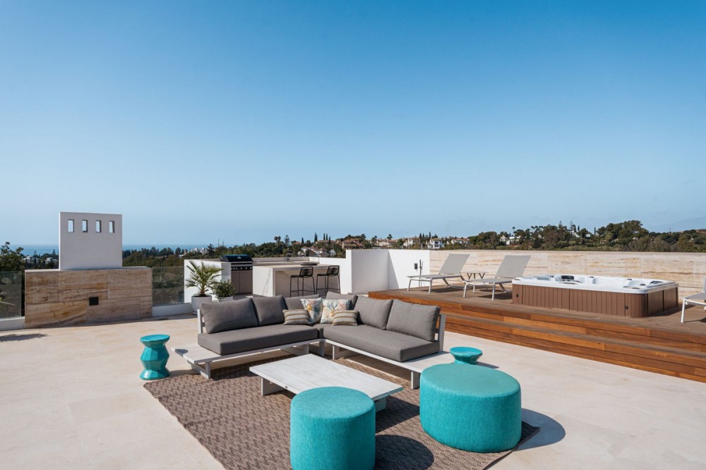 • This stunning 5-bedroom contemporary villa, located in the heart of Marbella's prestigious Golden Mile, is a masterpiece of modern luxury. Nestled within an exclusive gated community, the property offers privacy, security, and breathtaking views of the Mediterranean Sea and surrounding mountains. Designed in 2024 by a renowned local architect, the villa boasts a total built area of 1,016 m², with 630 m² of sophisticated living space. Spanning three meticulously crafted levels, this villa features interiors by a prestigious designer and is offered fully furnished. The five en-suite bedrooms serve as private retreats, each opening to expansive terraces with stunning views. On the main floor, an open-plan layout seamlessly connects the living room, dining area, and modern kitchen, all illuminated by natural light pouring in through large windows. A cozy fireplace adds warmth, while the outdoor space offers a lush garden, serene pool, and a porch terrace ideal for relaxation. The first floor houses the luxurious master suite, complete with a lavish bathroom and dressing room, as well as two additional bedrooms with terrace access. The rooftop terrace is designed for entertaining, featuring a jacuzzi, solarium, and barbecue area, all offering panoramic vistas. The lower level provides additional versatility, including an extra bedroom suite and ample space for a gym, home cinema, or games room. A three-car underground garage, advanced home automation, central heating, and air conditioning ensure year-round comfort. Located close to top-tier services and amenities, with 24-hour security, this villa offers the ultimate in luxury living on Marbella’s Golden Mile.