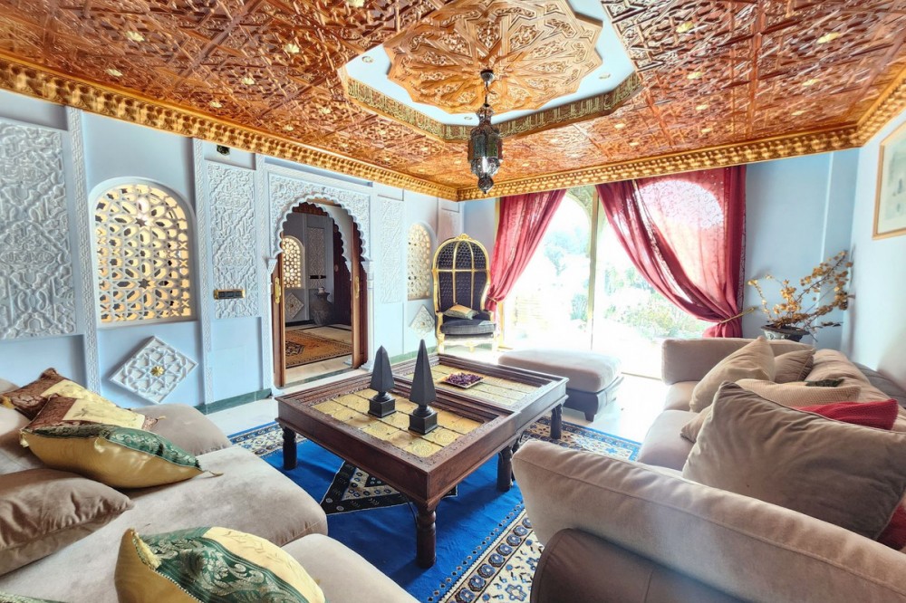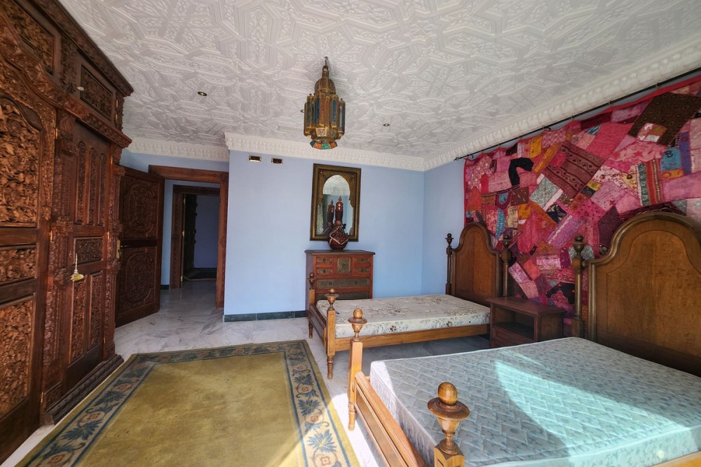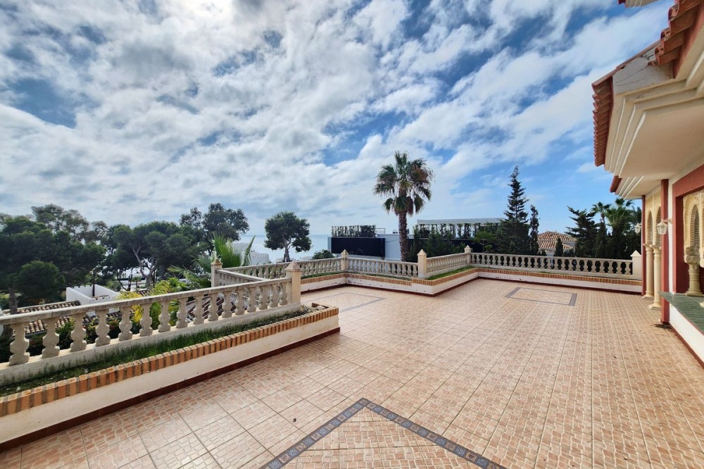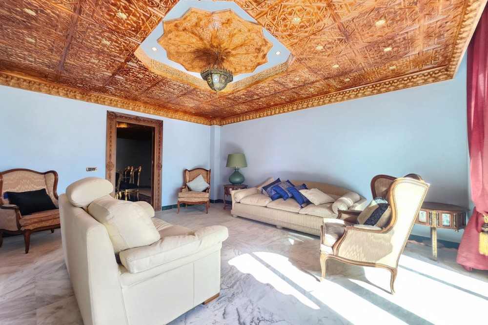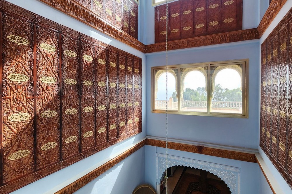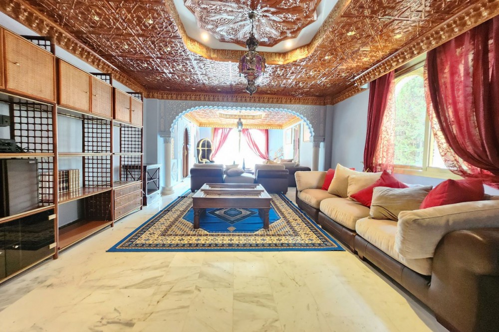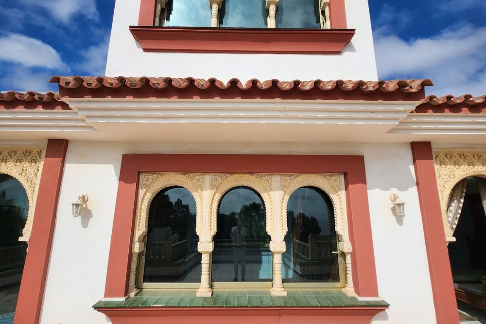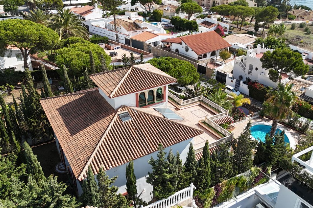 - Stunning Villa in Arabish-Andalusian Palace Style in Cala de Mijas Just 300 meters from the sea, this magnificent villa blends Andalusian Nazarí-modern design, combining luxury and tradition. Its privileged south-facing orientation ensures sunlight throughout the day, illuminating the garden and pool area. The property is accessed through a grand gate and a driveway. The villa is distributed over 3 floors plus a loft, featuring unique architectural details. Upon arrival, a small staircase leads to the pool and the main porch, offering stunning sea views. The entrance is through an impressive double door, hand-carved in mahogany, leading to a majestic 12-meter-high hall with a central patio and a marble fountain, all bathed in natural light coming through the central tower. To the left, a sliding double door opens to a large, bright double living room with sea views and windows overlooking the side garden. The high ceiling is lined with hand-carved mahogany wood, adding an artisanal touch to the space. This floor also includes a bright bedroom with garden views and a marble bathroom, perfectly equipped. On the right side of the hall, another living room with sea views connects to a spacious dining room, which leads to a modern kitchen equipped with high-end appliances and direct access to the rear garden. The upper floor offers three spacious bedrooms, two of them with access to a large terrace with panoramic sea views. The master bedroom features an en-suite bathroom with a jacuzzi and large windows providing abundant natural light. A second full bathroom also includes a jacuzzi and side windows. All carpentry is handcrafted from mahogany, and the windows are double-glazed. The lower floor offers flexible space with four additional bedrooms, perfect for conversion into a cinema room, games room, or even an independent apartment. It also includes a full bathroom and a garage with space for four cars. Located in the exclusive coastal urbanization of **Torrenueva**, this property is in the heart of Mijas' coastal area, just a short distance from the beaches and surrounded by lush forests. This enclave is known for its tranquility, international community, and excellent access to the AP7 motorway and A7 highway, allowing quick access to Málaga airport in 25 minutes, and Marbella or Puerto Banús in less than 15 minutes. Additionally, the nearby Cabopino area offers a charming marina just 10 minutes away. Torrenueva stands out for its excellent range of services, including restaurants, shops, tennis and golf clubs, as well as outdoor activities such as hiking, fishing, and diving. A unique property in an exceptional location, perfect for those seeking luxury, privacy, and proximity to the sea.