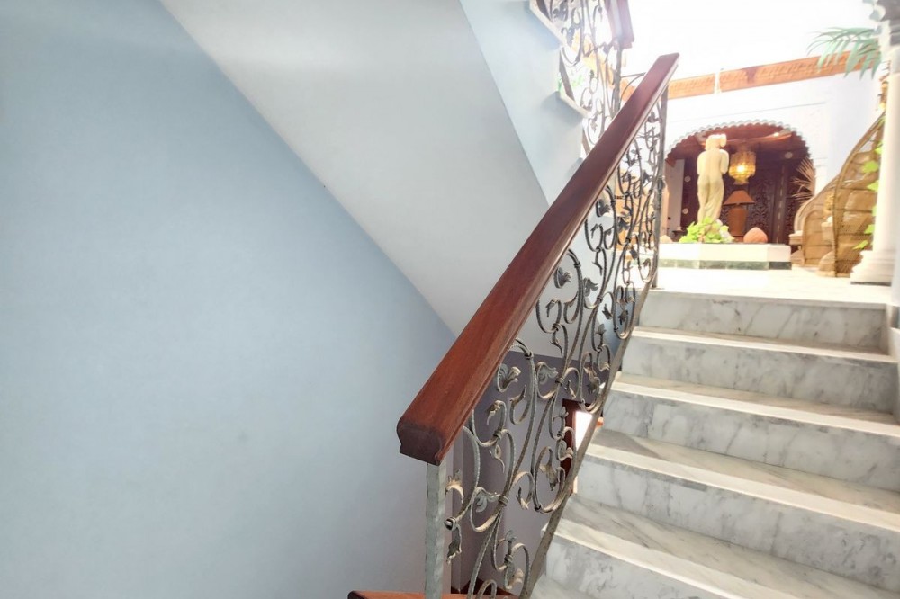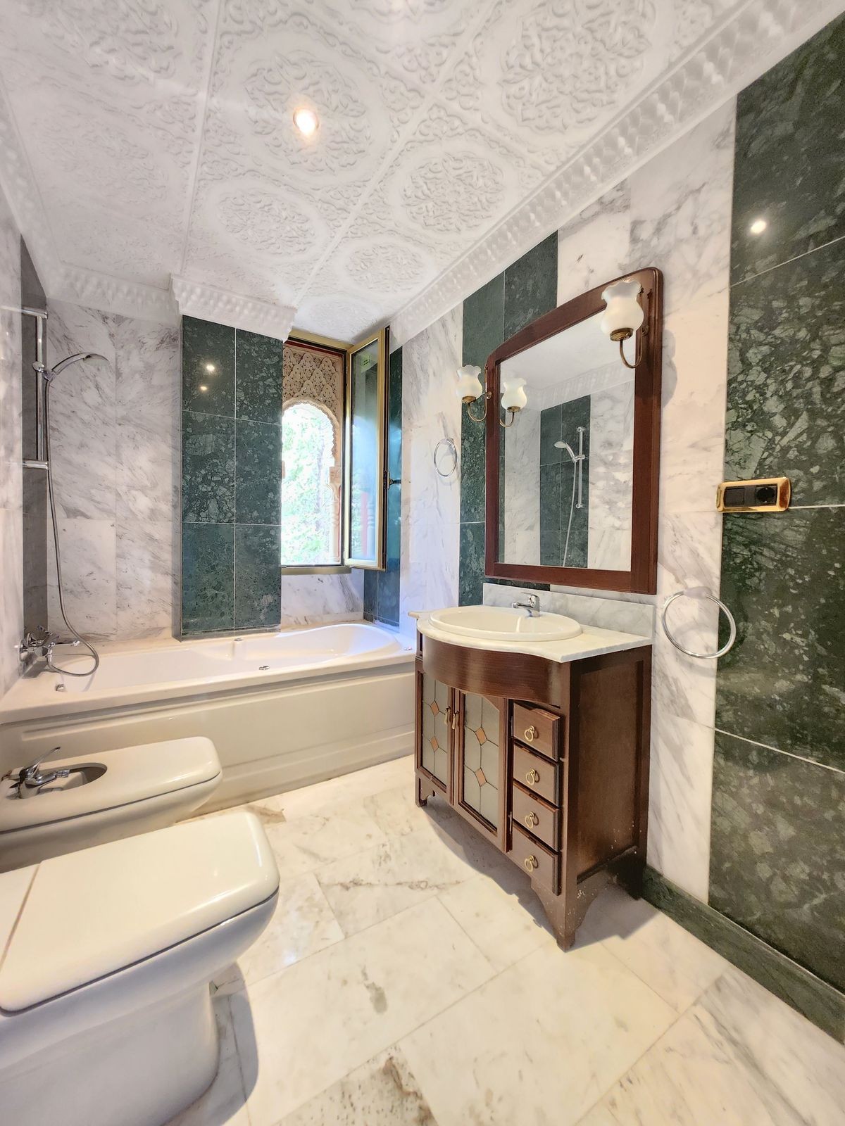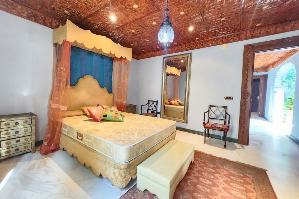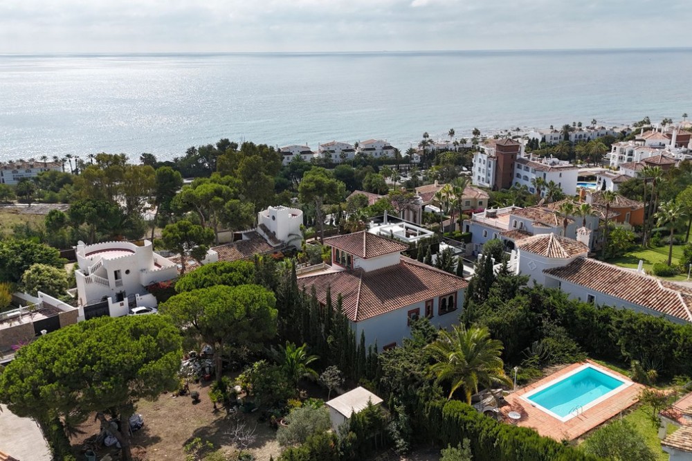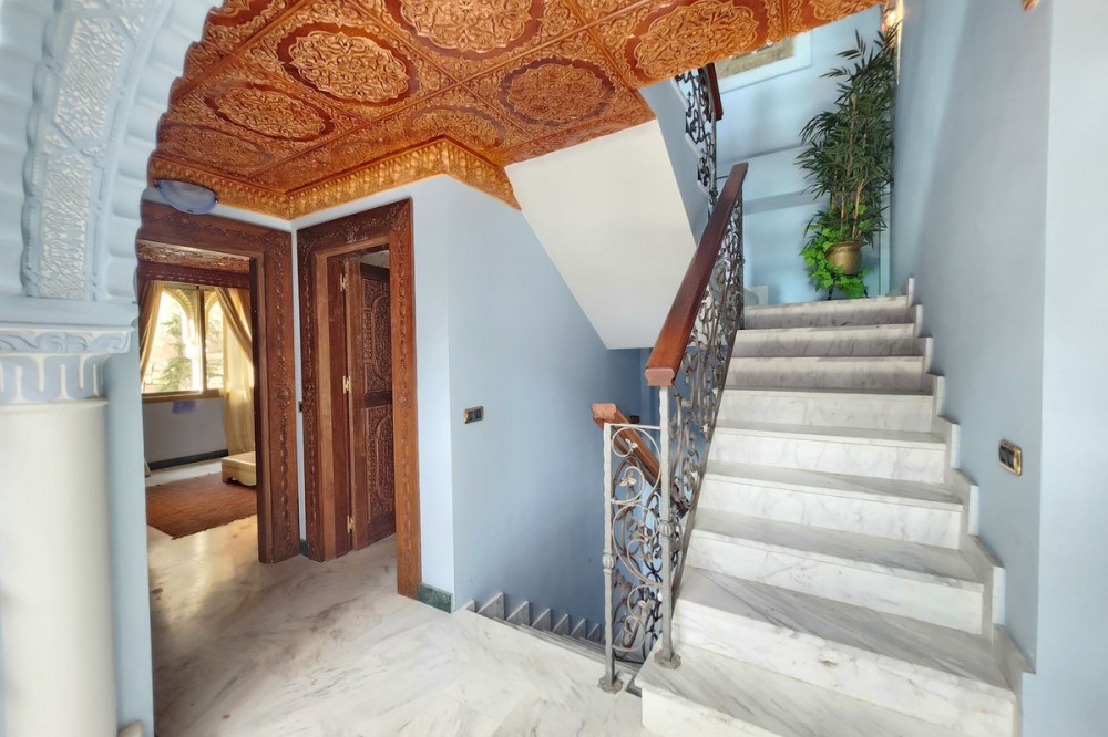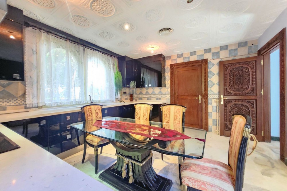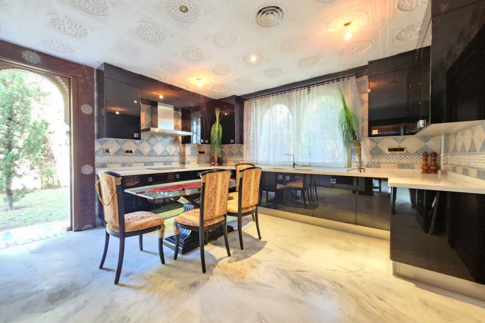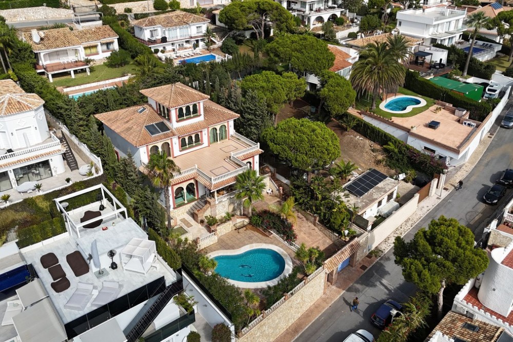- Stunning Villa in Arabish-Andalusian Palace Style in Cala de Mijas Just 300 meters from the sea, this magnificent villa blends Andalusian Nazarí-modern design, combining luxury and tradition. Its privileged south-facing orientation ensures sunlight throughout the day, illuminating the garden and pool area. The property is accessed through a grand gate and a driveway. The villa is distributed over 3 floors plus a loft, featuring unique architectural details. Upon arrival, a small staircase leads to the pool and the main porch, offering stunning sea views. The entrance is through an impressive double door, hand-carved in mahogany, leading to a majestic 12-meter-high hall with a central patio and a marble fountain, all bathed in natural light coming through the central tower. To the left, a sliding double door opens to a large, bright double living room with sea views and windows overlooking the side garden. The high ceiling is lined with hand-carved mahogany wood, adding an artisanal touch to the space. This floor also includes a bright bedroom with garden views and a marble bathroom, perfectly equipped. On the right side of the hall, another living room with sea views connects to a spacious dining room, which leads to a modern kitchen equipped with high-end appliances and direct access to the rear garden. The upper floor offers three spacious bedrooms, two of them with access to a large terrace with panoramic sea views. The master bedroom features an en-suite bathroom with a jacuzzi and large windows providing abundant natural light. A second full bathroom also includes a jacuzzi and side windows. All carpentry is handcrafted from mahogany, and the windows are double-glazed. The lower floor offers flexible space with four additional bedrooms, perfect for conversion into a cinema room, games room, or even an independent apartment. It also includes a full bathroom and a garage with space for four cars. Located in the exclusive coastal urbanization of **Torrenueva**, this property is in the heart of Mijas' coastal area, just a short distance from the beaches and surrounded by lush forests. This enclave is known for its tranquility, international community, and excellent access to the AP7 motorway and A7 highway, allowing quick access to Málaga airport in 25 minutes, and Marbella or Puerto Banús in less than 15 minutes. Additionally, the nearby Cabopino area offers a charming marina just 10 minutes away. Torrenueva stands out for its excellent range of services, including restaurants, shops, tennis and golf clubs, as well as outdoor activities such as hiking, fishing, and diving. A unique property in an exceptional location, perfect for those seeking luxury, privacy, and proximity to the sea.