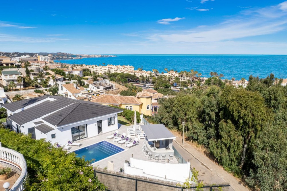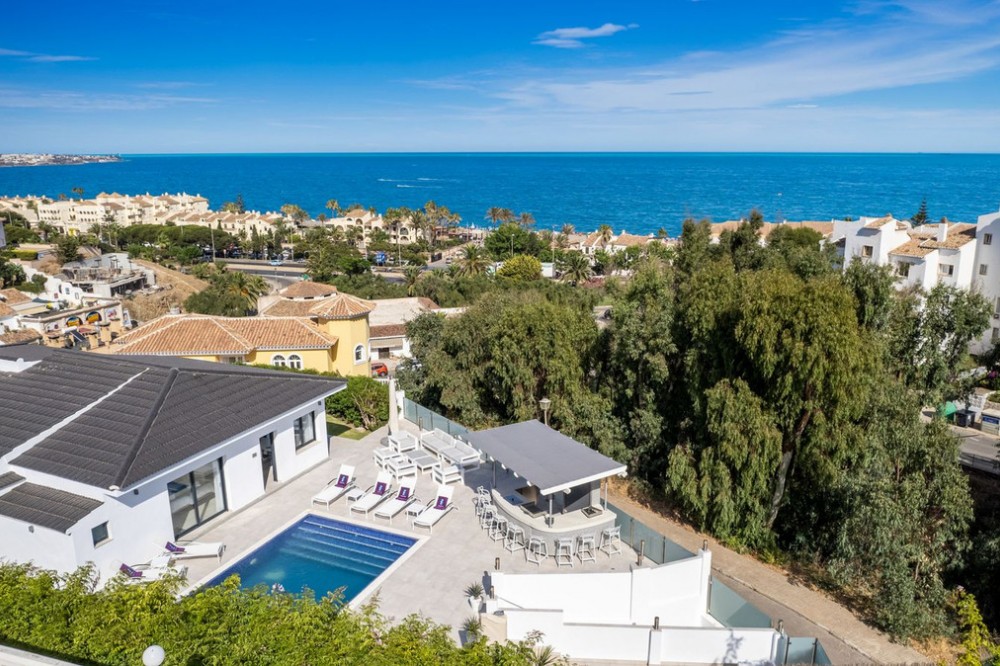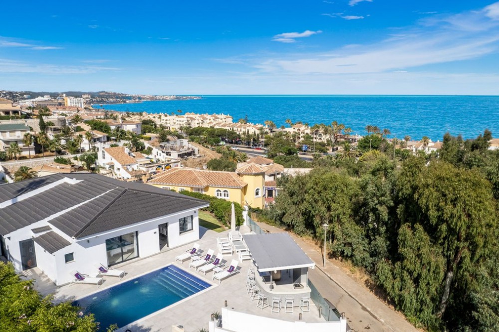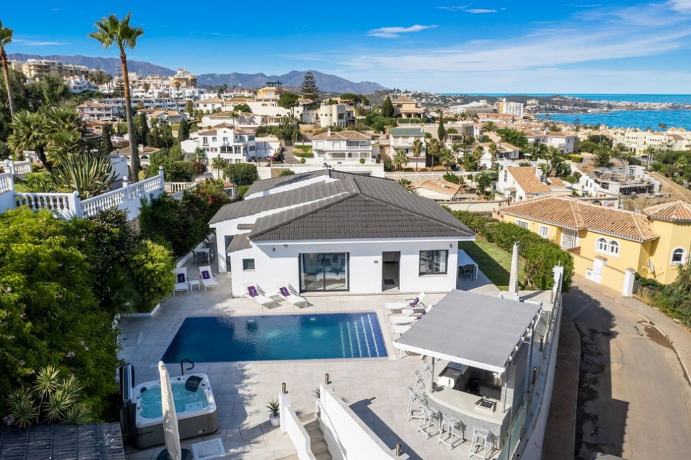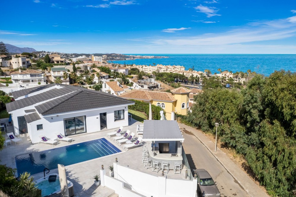 - Amazing sea views from the beautifully presented 5 bedroom 6 bathroom villa finished to a very high standard, the light in this beautiful villa flows through from every side, large floor to ceiling windows in every room allows the sunlight to flood in, with easy access to the garden and pool from most rooms this really is the perfect holiday/home for anybody looking to be close to the beach, shops/restaurants, the town of La Cala de Mijas or Riviera del sol. Fantastic sea views from most of the villa and pool area, with a great bar/BBQ area by the heated pool, Jacuzzi, sauna and out side loo. This villa would be prefect for family living, lock up and go or a semi holiday rental with owners use.