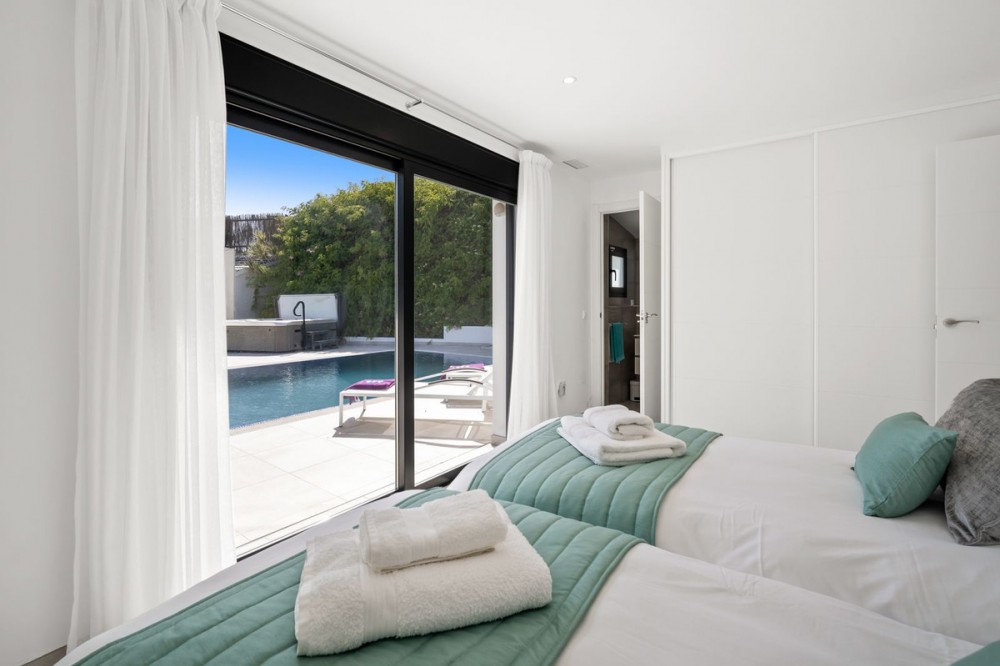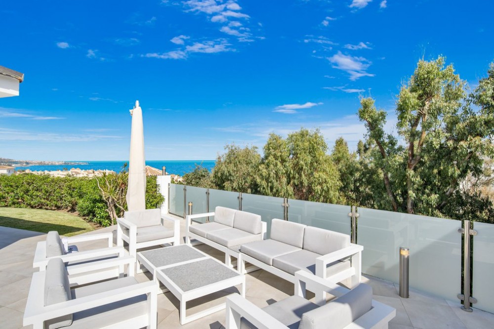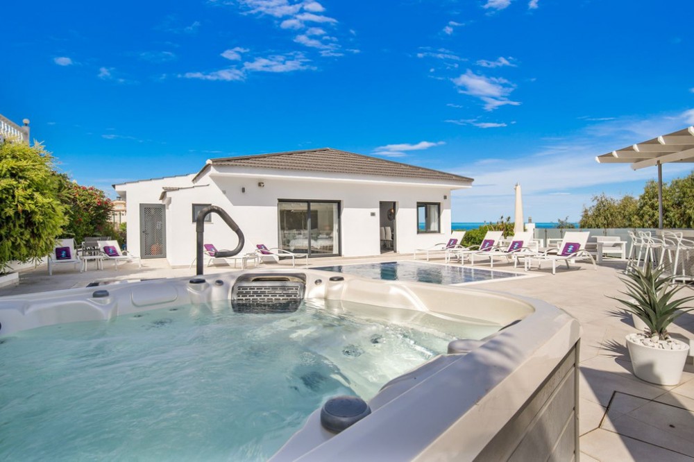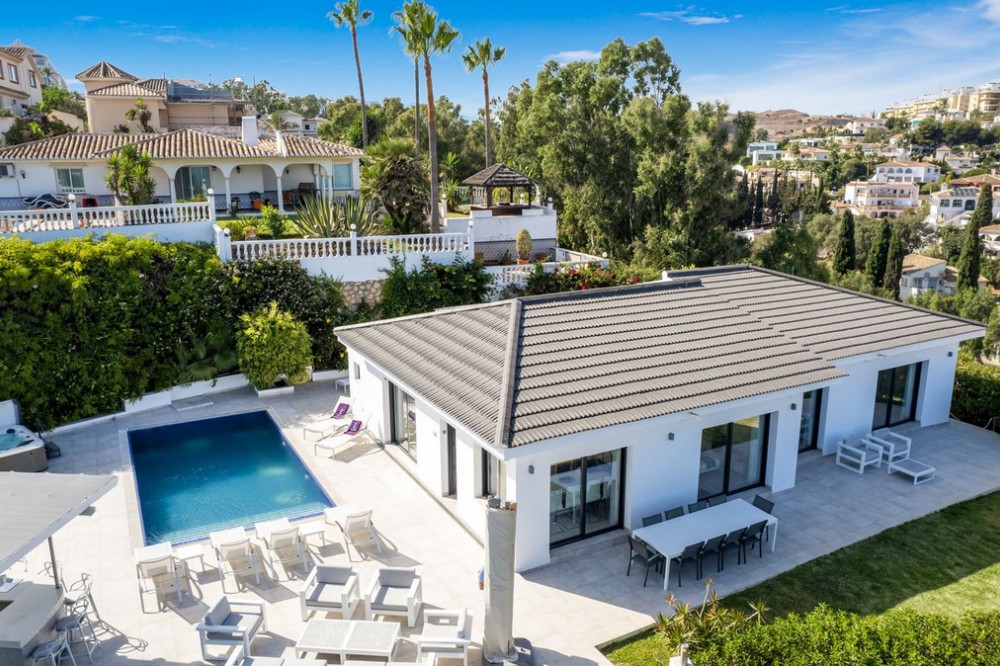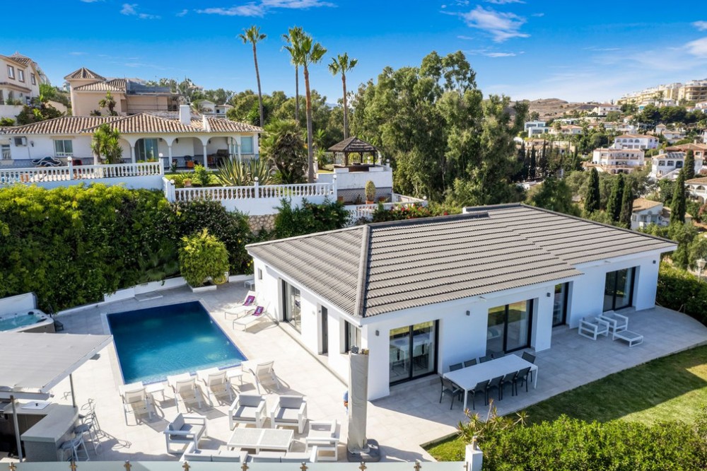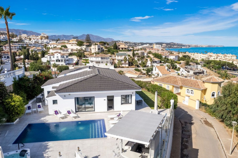 - Amazing sea views from the beautifully presented 5 bedroom 6 bathroom villa finished to a very high standard, the light in this beautiful villa flows through from every side, large floor to ceiling windows in every room allows the sunlight to flood in, with easy access to the garden and pool from most rooms this really is the perfect holiday/home for anybody looking to be close to the beach, shops/restaurants, the town of La Cala de Mijas or Riviera del sol. Fantastic sea views from most of the villa and pool area, with a great bar/BBQ area by the heated pool, Jacuzzi, sauna and out side loo. This villa would be prefect for family living, lock up and go or a semi holiday rental with owners use.