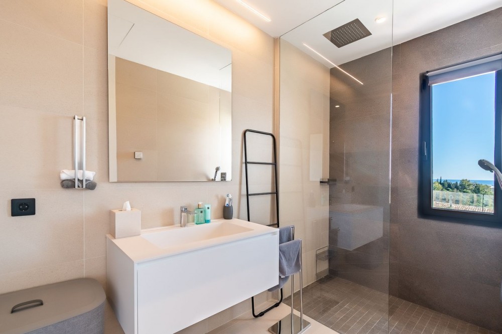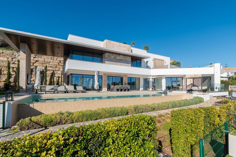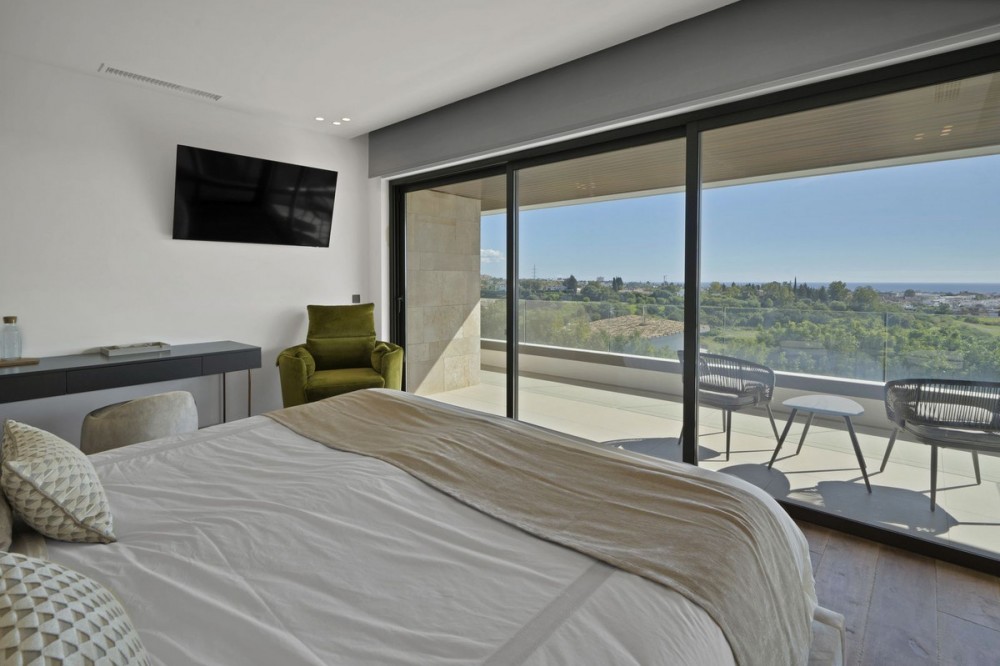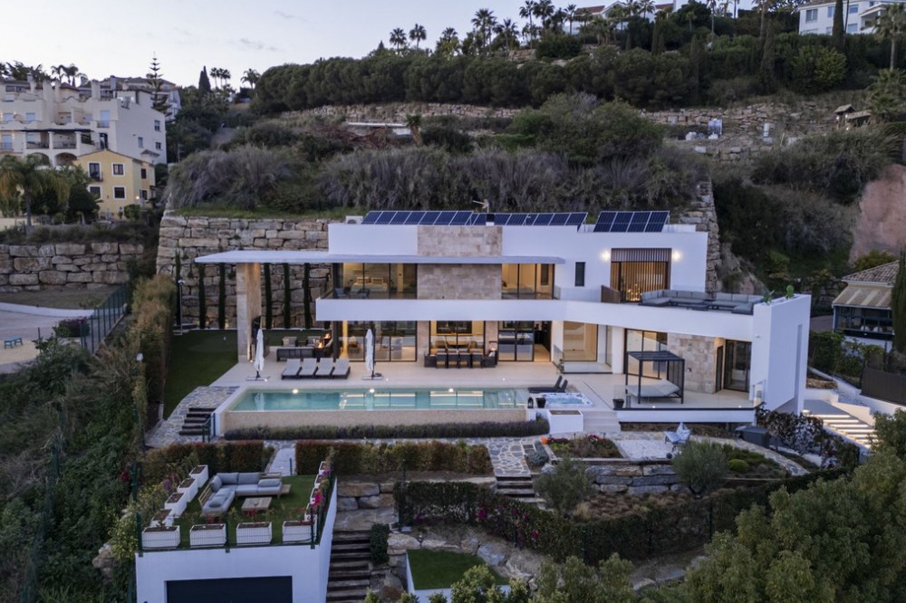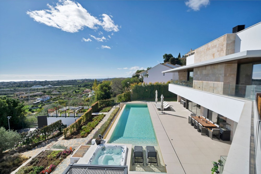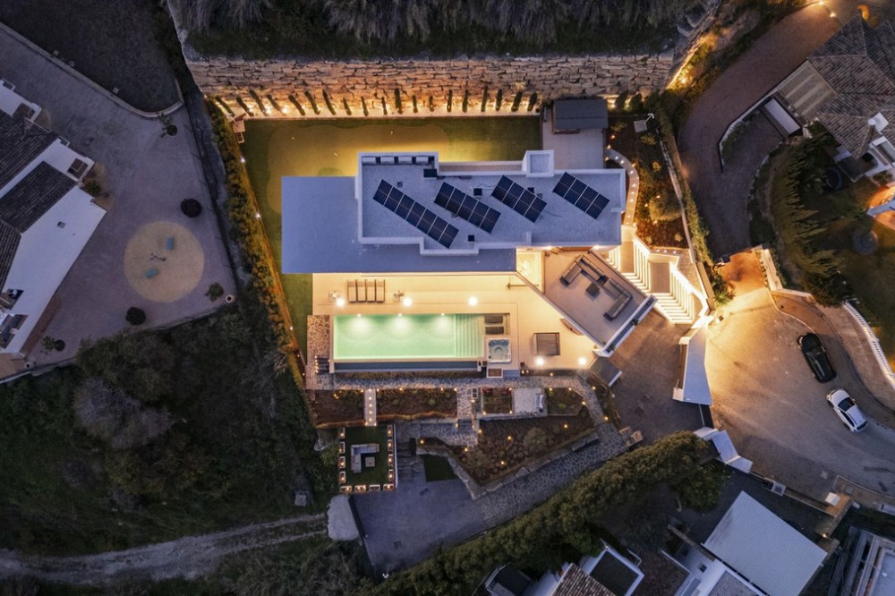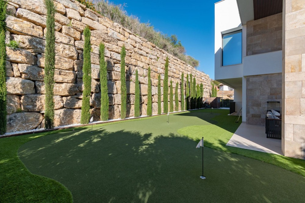 • Dream Villa for Golfers with Panoramic Views in Puerto del Almendro, Benahavís Located in the exclusive and private gated community of La Resina, in Puerto del Almendro, this stunning luxury villa has been designed and decorated with an unparalleled level of detail and sophistication. With 930 m² of built space on a 1,036 m² plot, this property represents the perfect fusion of elegance, comfort, and cutting-edge technology. Situated on one of the best plots in the area, the villa offers breathtaking 270° panoramic views of the sea and mountains, creating a unique setting of peace, privacy, and natural beauty. Additionally, it is located within a secure gated community with 24/7 security, ensuring maximum safety and tranquility. A Golfer’s Paradise Designed for golf enthusiasts, the villa features putting greens in the garden and a professional golf simulator, offering a premium experience without leaving home. Wellness and Relaxation in Every Space Luxury is evident in every detail, from the private spa, which includes a Turkish sauna and Swedish sauna, to the fully equipped gym with state-of-the-art fitness technology. Outdoors, relaxation is guaranteed with a heated jacuzzi and a stunning heated private pool, surrounded by beautifully landscaped gardens. The property also boasts a covered chill-out area with a TV, perfect for enjoying the outdoors in total comfort. Layout and Exclusive Features 3 spacious bedrooms in the main villa, each with an en-suite bathroom. Independent apartment, perfect for guests or staff, featuring 1 bedroom, 1 full bathroom, and a fully equipped kitchen. Private hair salon, offering a personal care experience at home. Indoor elevator, ensuring accessibility throughout the house. Game room, ideal for family entertainment. Functional and Versatile Spaces Indoor garage with space for 3 cars. Outdoor parking for 2 cars, which can also be used as storage or converted into an additional apartment. Solar panels, ensuring energy efficiency and sustainability. Every corner of this villa has been carefully designed with the highest quality materials, achieving the perfect balance between luxury, modernity, and comfort. If you are looking for an exclusive residence where privacy, security, and design come together in an unparalleled setting, this villa is simply one of a kind.