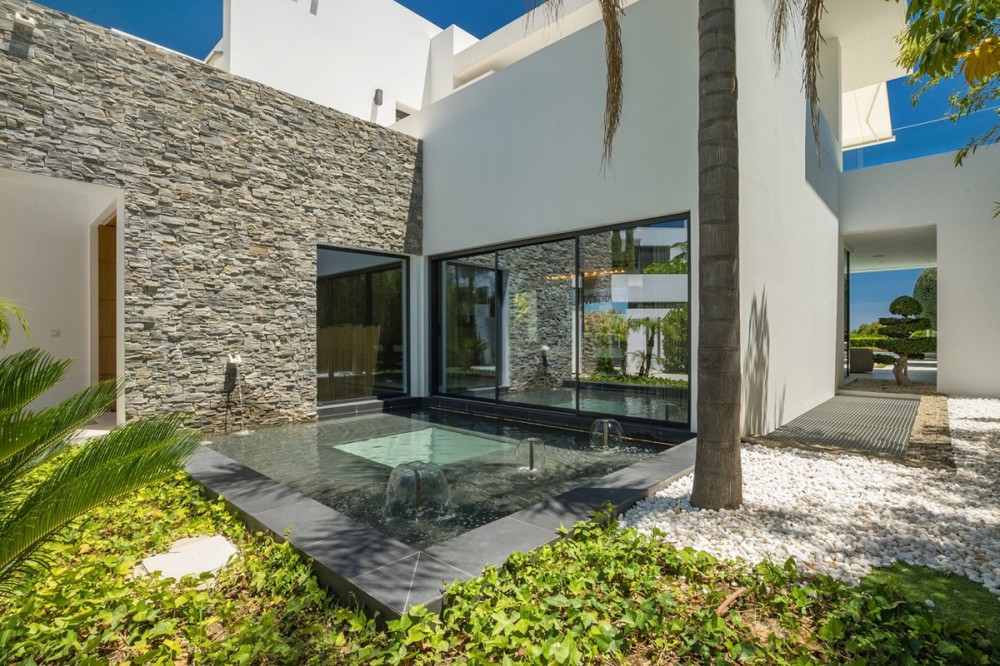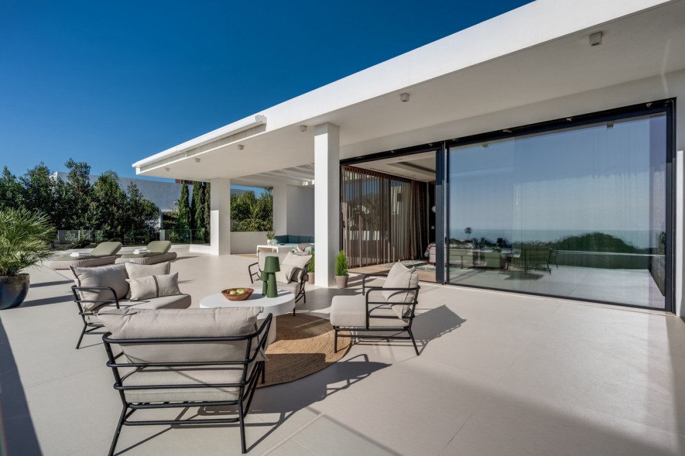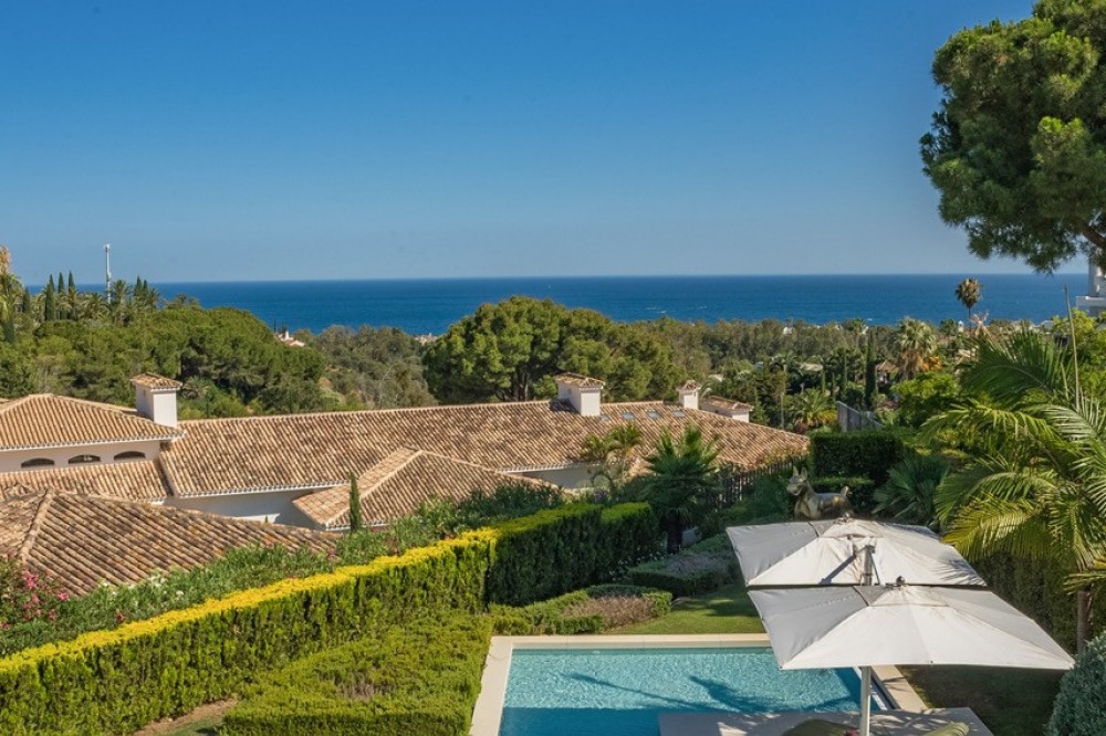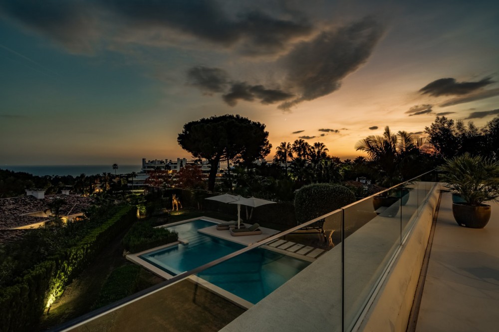 - This exceptional villa is nestled within an exclusive gated community in Marbella’s prestigious Golden Mile. Set on a generous south-facing plot, the property is bathed in natural sunlight and enjoys breathtaking panoramic sea views from both floors, creating a serene and luxurious coastal retreat. For the future owner, a brand-new high-quality kitchen from Siematic or equivalent will be included, offering the option to replace the existing one. The buyer also enjoys the exclusive opportunity to tailor the design, materials, and appliances to perfectly reflect their personal style and preferences. Designed by renowned architects Cristian Larrain K. and Rodolfo Nonini, the villa stands as a striking example of modern architectural excellence. Its crisp white façade, symmetrical lines, and lush greenery create an elegant yet inviting aesthetic. The rooftop terrace crowns the residence, offering uninterrupted sea views and iconic La Concha Mountain. The outdoor spaces are equally impressive, featuring breathtaking sea views, private pool, stylish terraces, and a meticulously landscaped garden – ideal for both relaxation and entertaining. Inside, the home exudes contemporary sophistication. The open-plan living area is enhanced by ambient ceiling lighting and a soft neutral color palette, creating a warm and welcoming atmosphere. The dining area flows seamlessly into the kitchen and social zones, making it perfectly suited for both everyday living and special occasions. A high-end indoor/outdoor sound system ensures effortless entertainment throughout. The kitchen itself is spacious, functional, and beautifully appointed, with ample storage, generous worktops, and a cozy breakfast nook. Each bedroom is a private retreat, featuring refined finishes and its own en-suite bathroom. The master suite, occupying the entire upper level, offers the ultimate in privacy and comfort, complete with walk-in closet, freestanding bathtub, double vanity, and floor-to-ceiling windows framing spectacular sea views. Further amenities include a state-of-the-art entertainment room, home cinema, wine cellar, gym, elevator, and three-car garage – all thoughtfully designed for modern luxury living. For complete peace of mind, the community provides full-time staff who oversee the maintenance of the pool and gardens. Optional property management services are also available, ensuring a truly turnkey lifestyle. This serene and secure neighborhood offers a rare balance of tranquility and convenience. While tucked away in peaceful surroundings, the villa remains within walking distance of the beach and Marbella’s vibrant Golden Mile. Residents enjoy proximity to world-class dining and lifestyle venues such as Puente Romano, Alba by Serafina, Besaya Beach, and the stylish Boho Club. This is more than a home – it is a seamless blend of elegance, comfort, and exclusivity, where every detail has been carefully curated to deliver the finest in Mediterranean living.